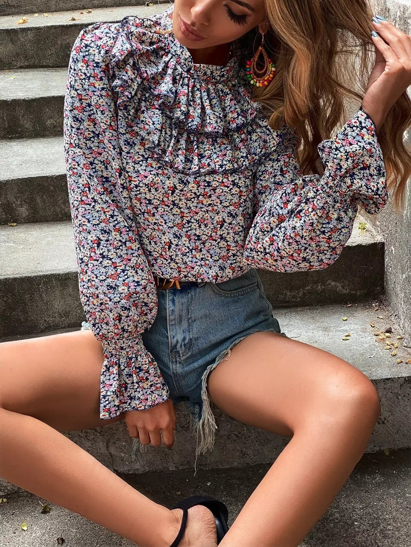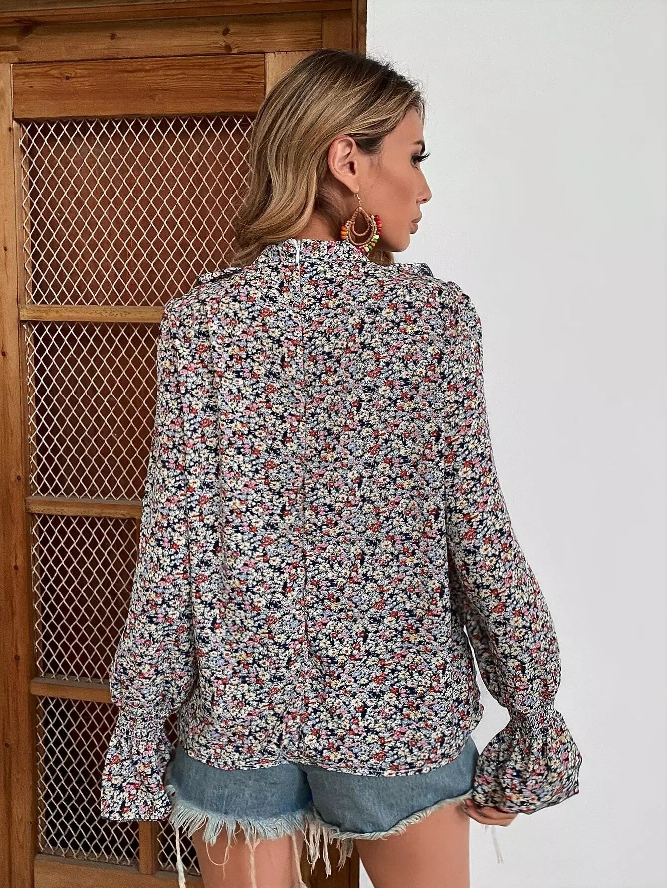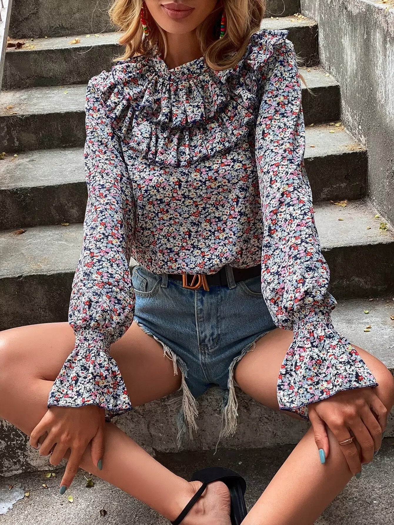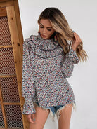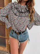 Ditsy Floral Flounce Sleeve Ruffle Trim Blouse