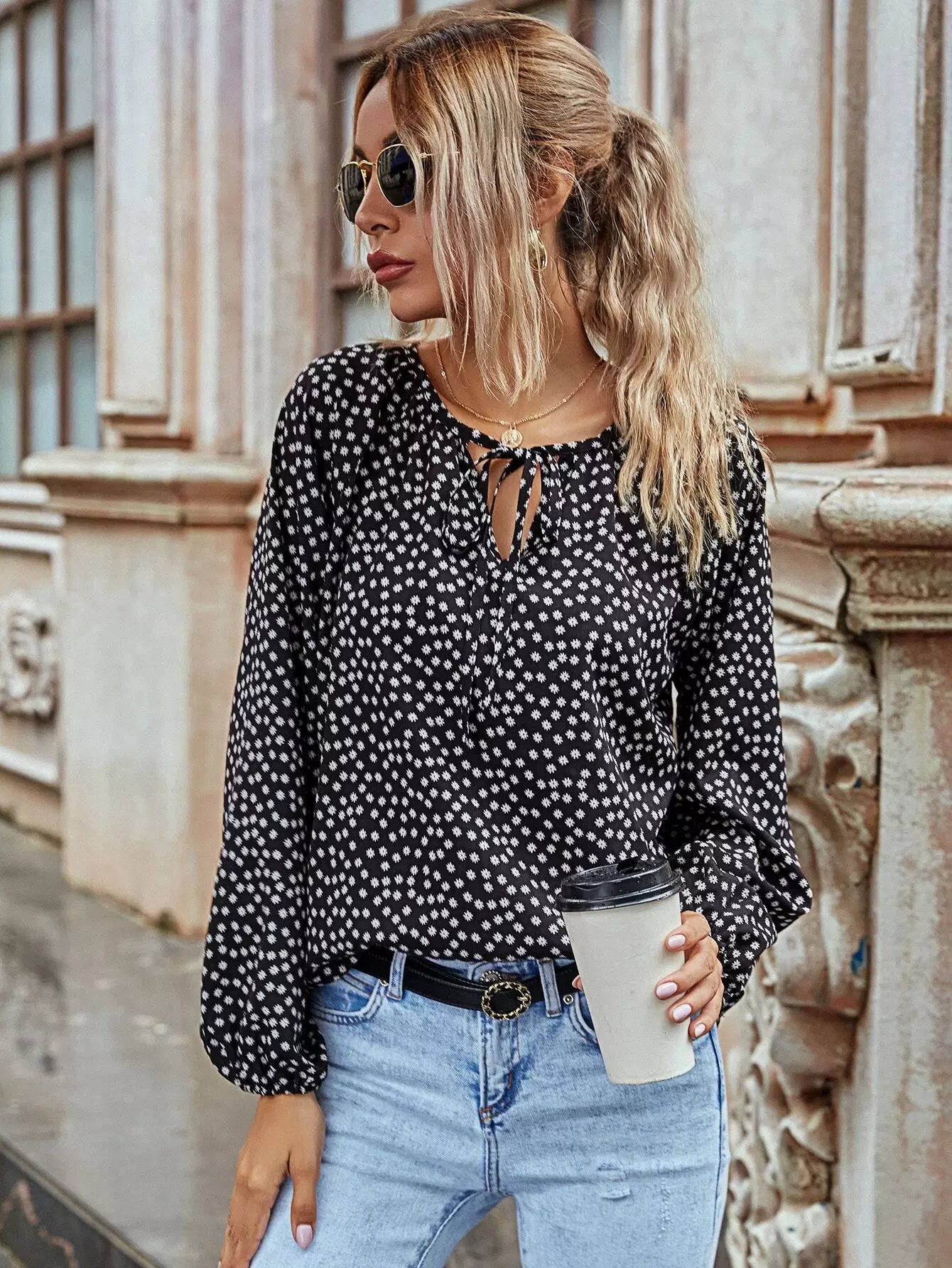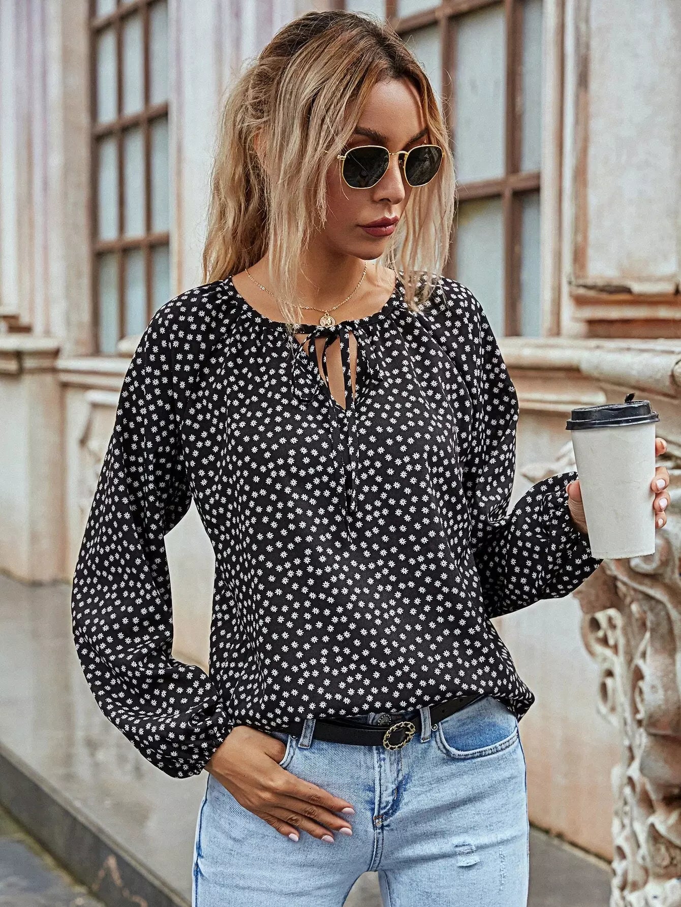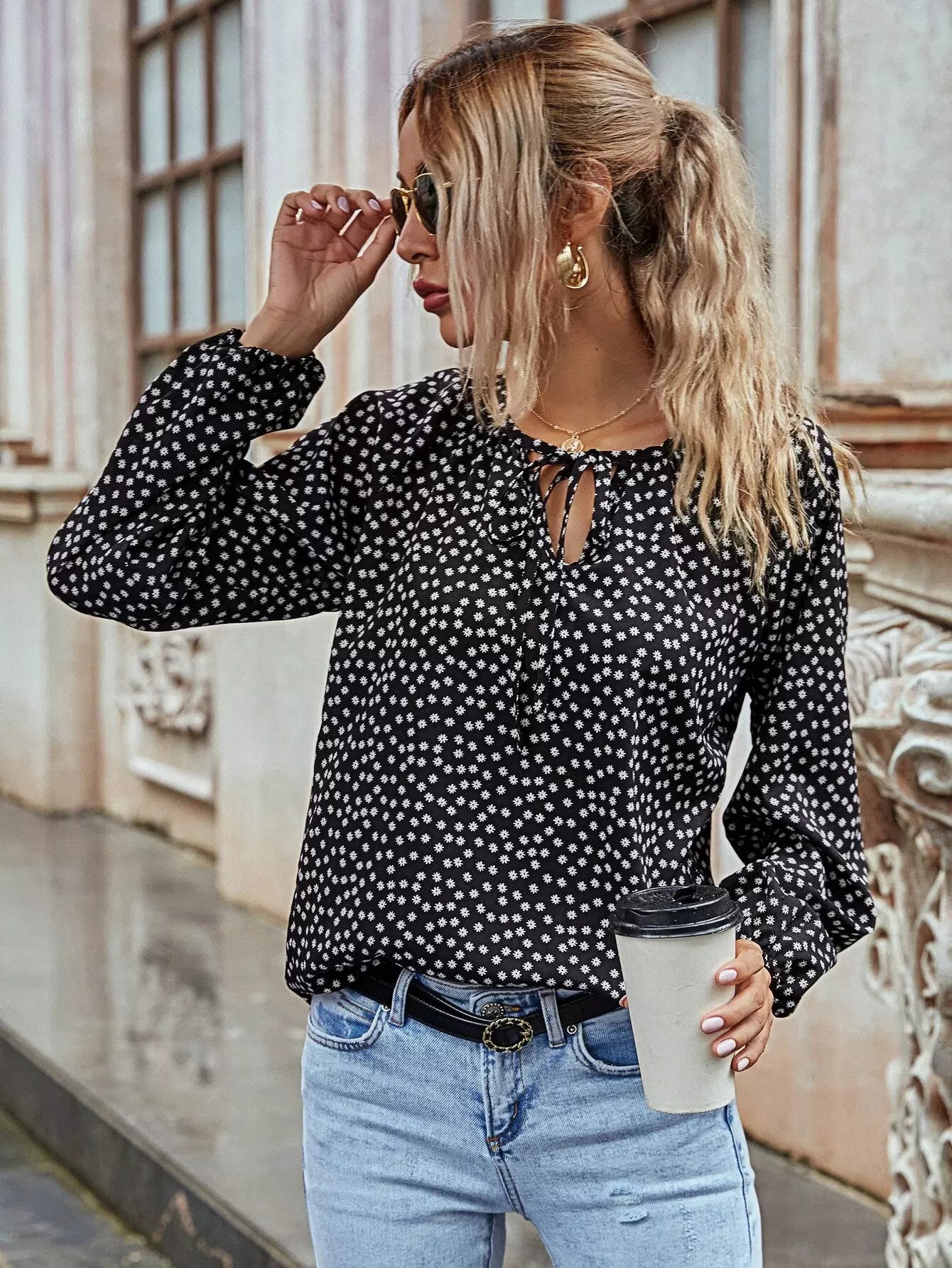 Women - Ditsy Floral Keyhole Tie Neck Blouse