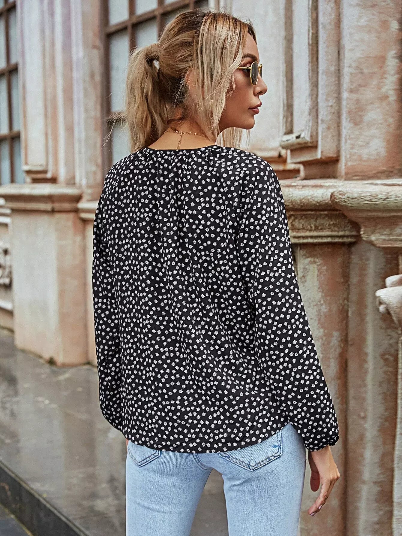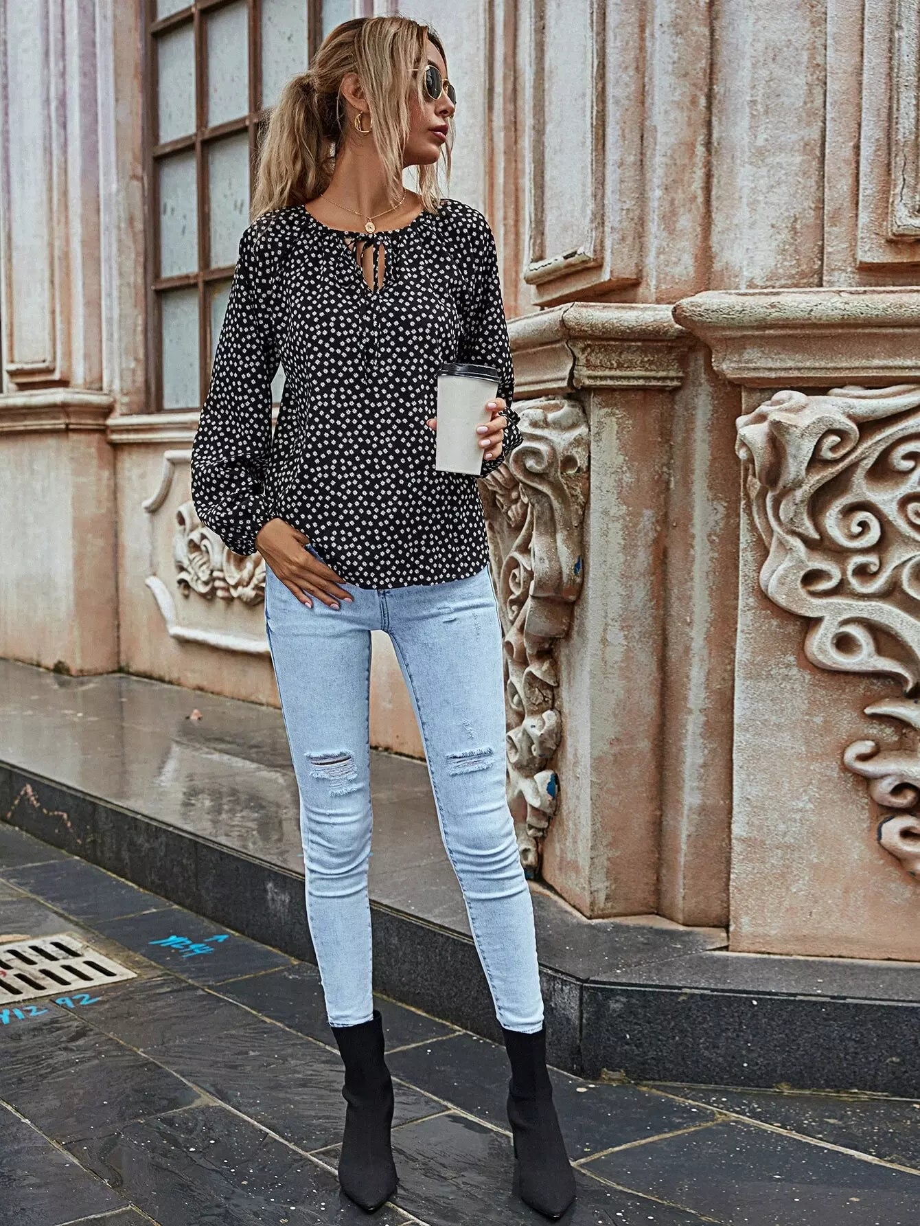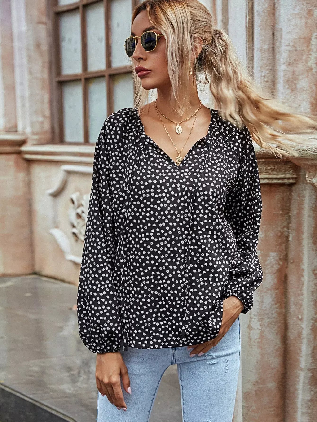 Women - Ditsy Floral Keyhole Tie Neck Blouse