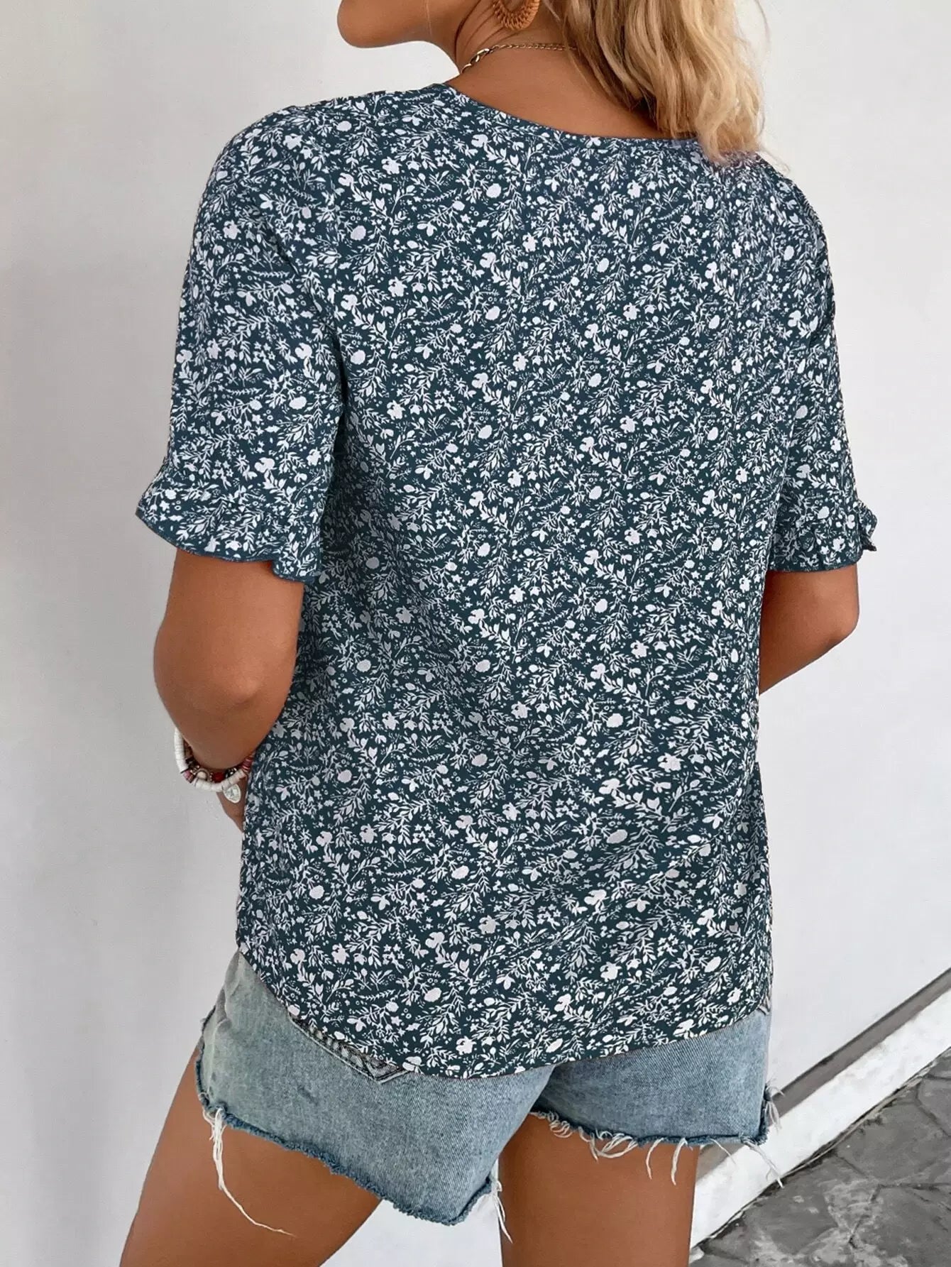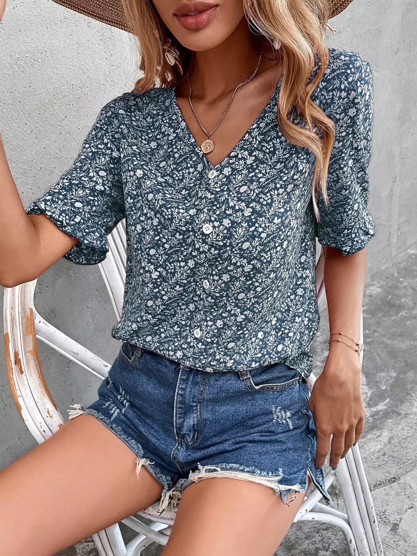 Ditsy Floral Print Flounce Sleeve Blouse