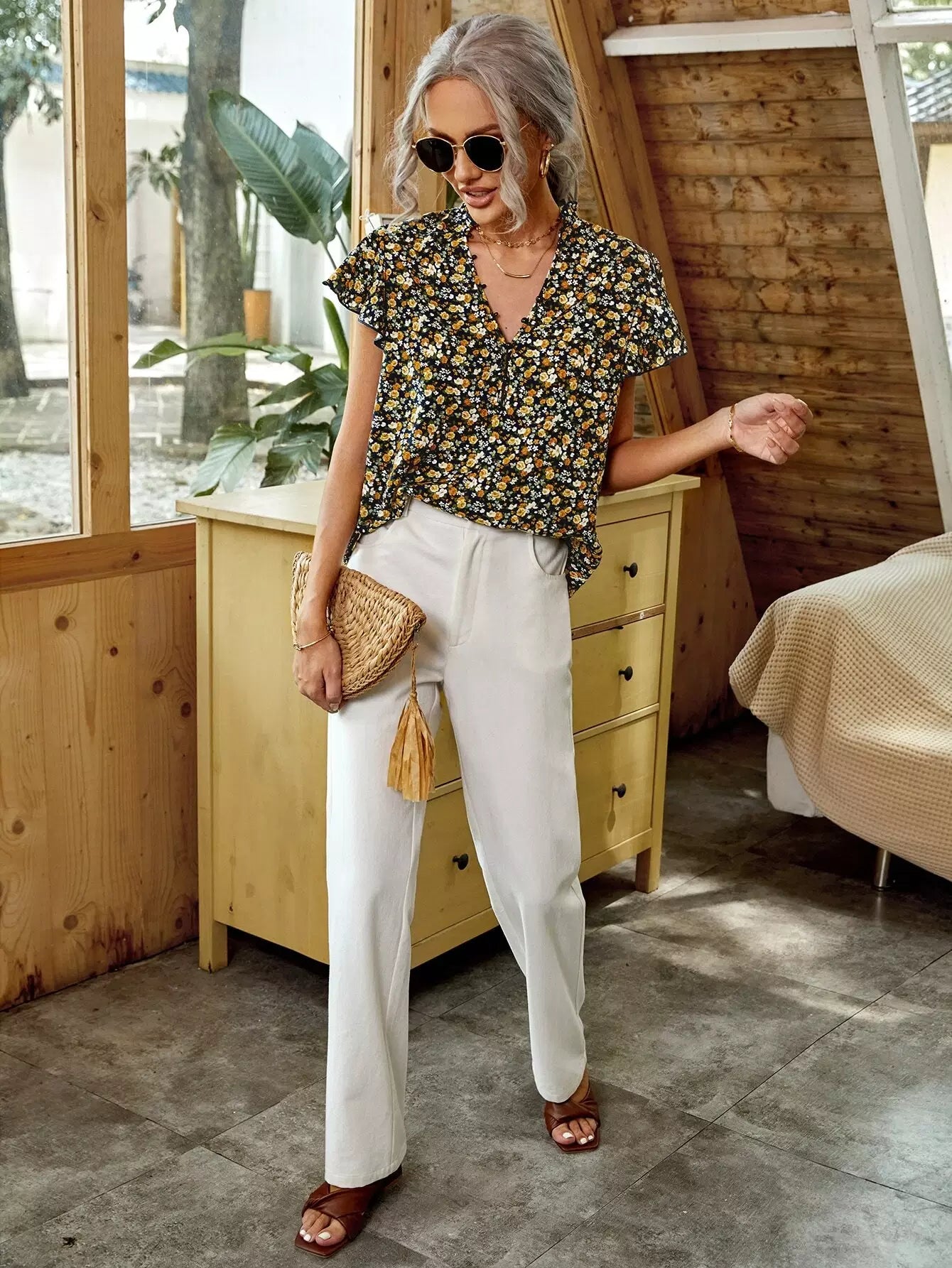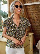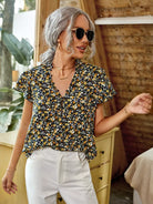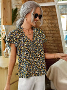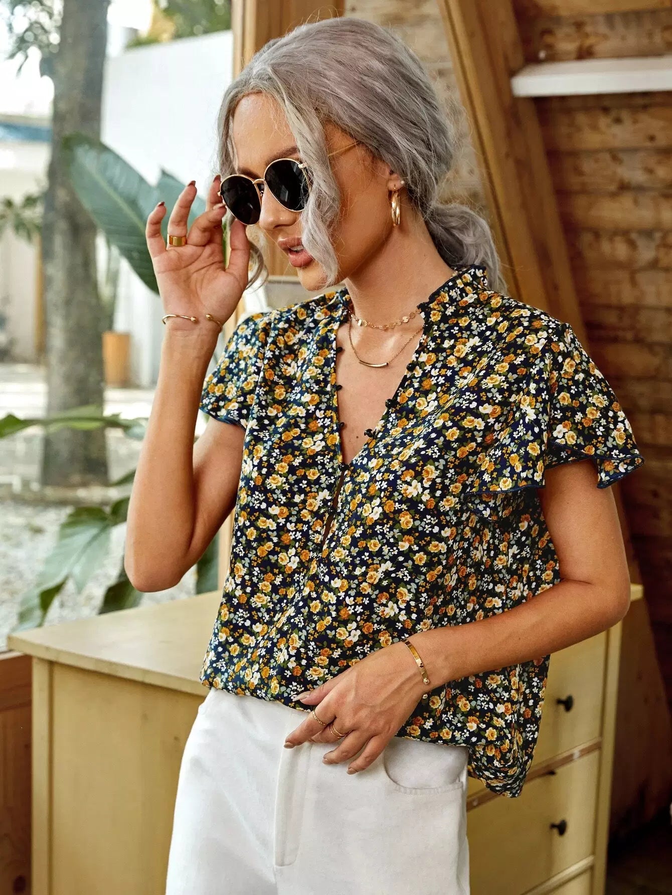 Ditsy Floral Print Frill Half Button Butterfly Sleeve Blouse