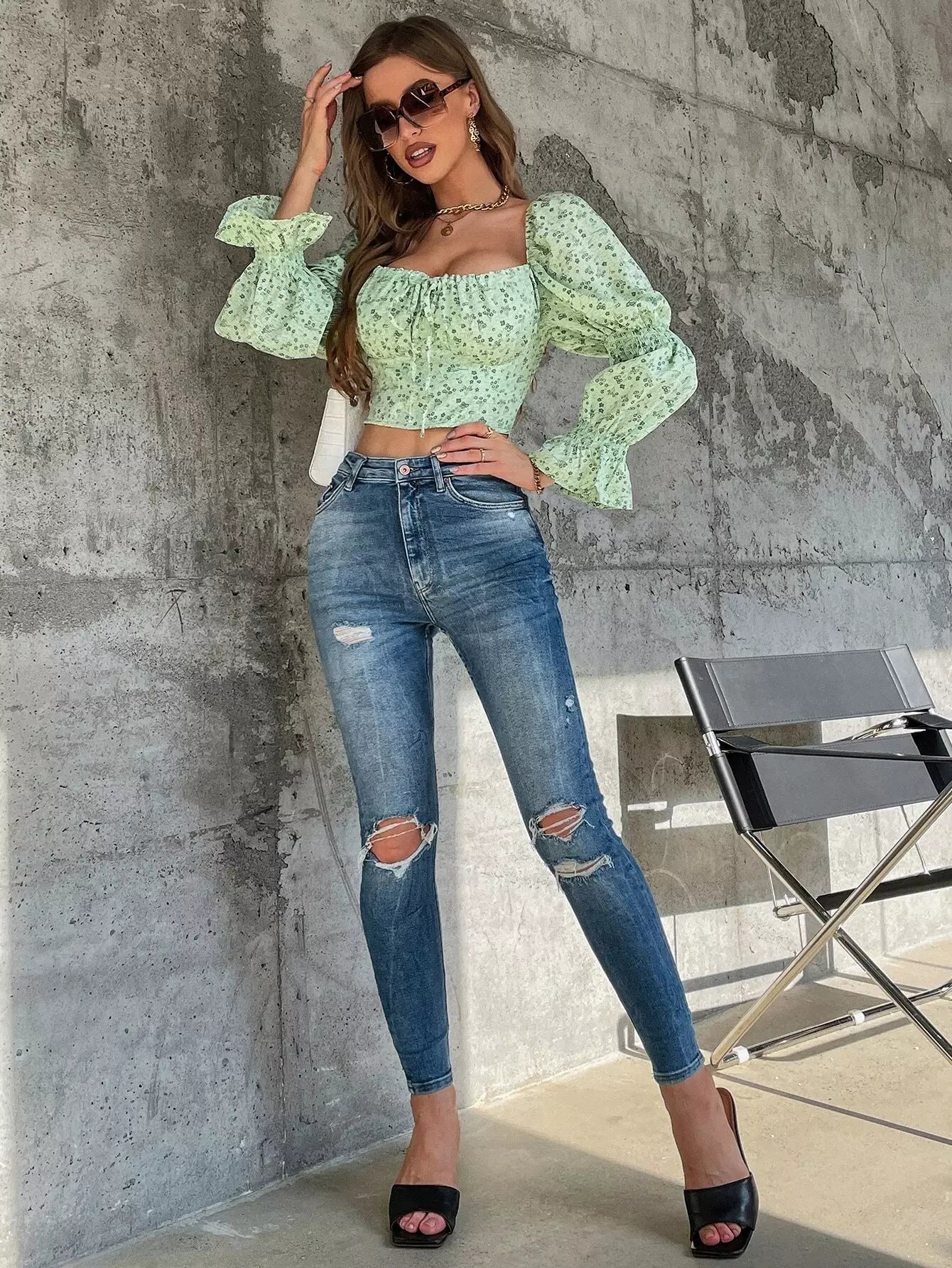 Ditsy Floral Scoop Neck Flounce Sleeve Shirred Back Blouse