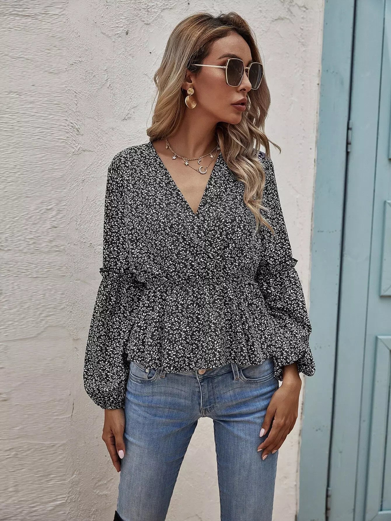 Ditsy Floral Surplice Bishop Sleeve Peplum Blouse