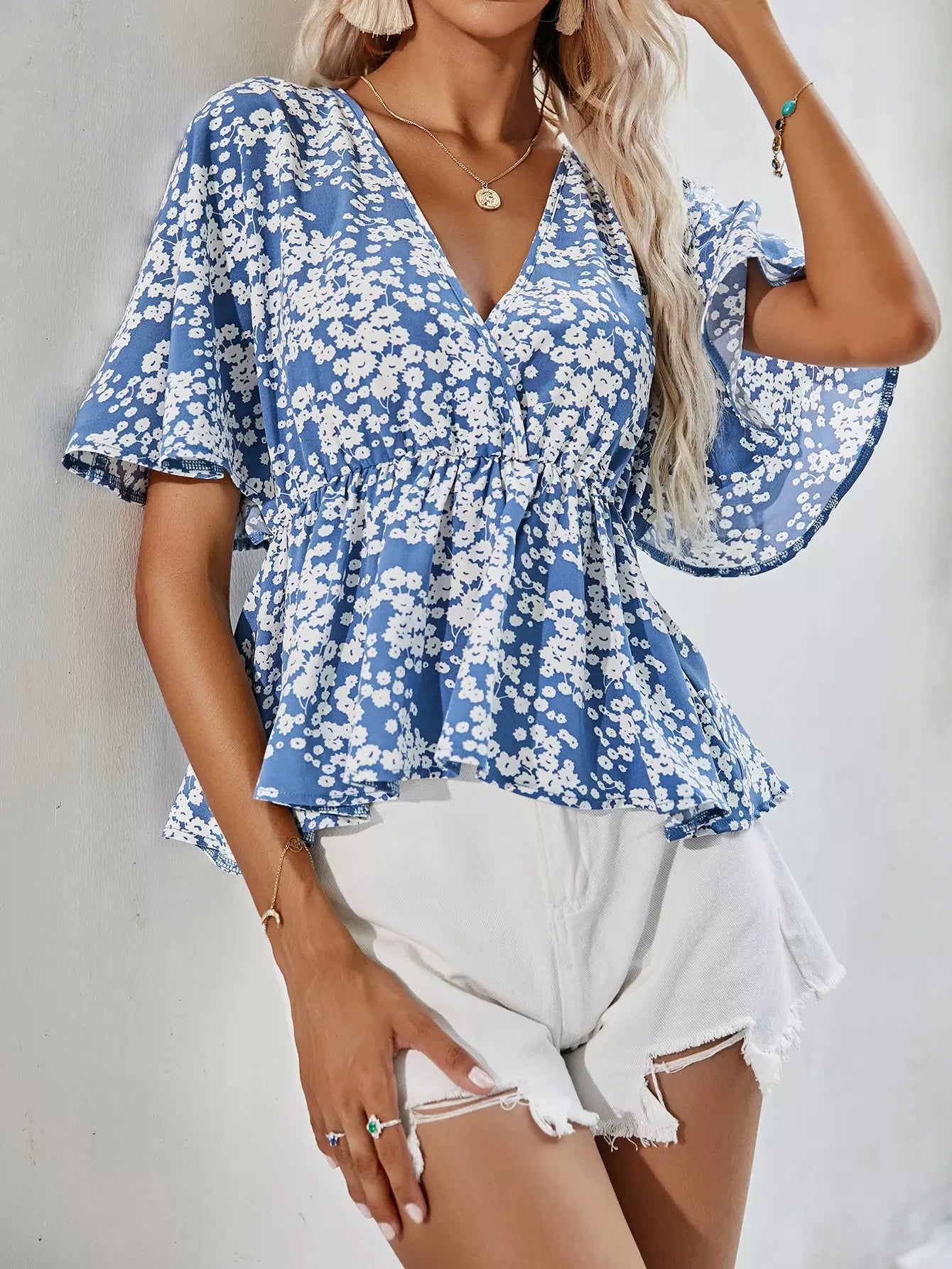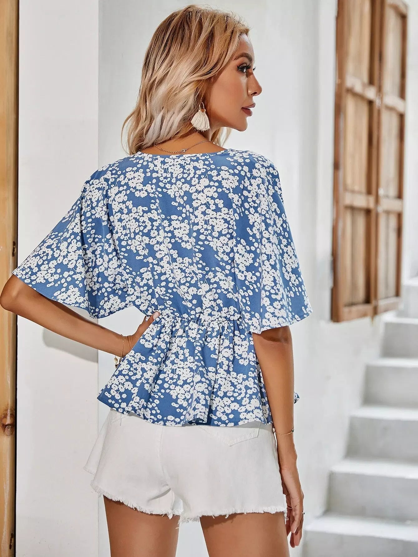 Ditsy Floral Surplice Front Flutter Sleeve Peplum Blouse