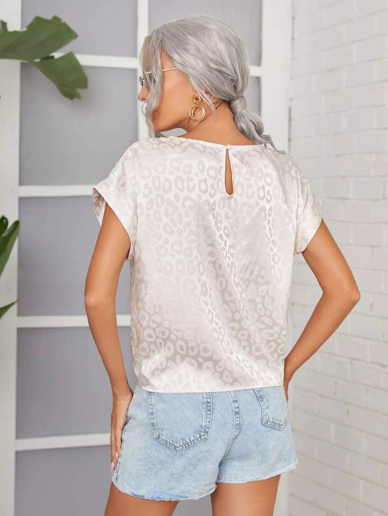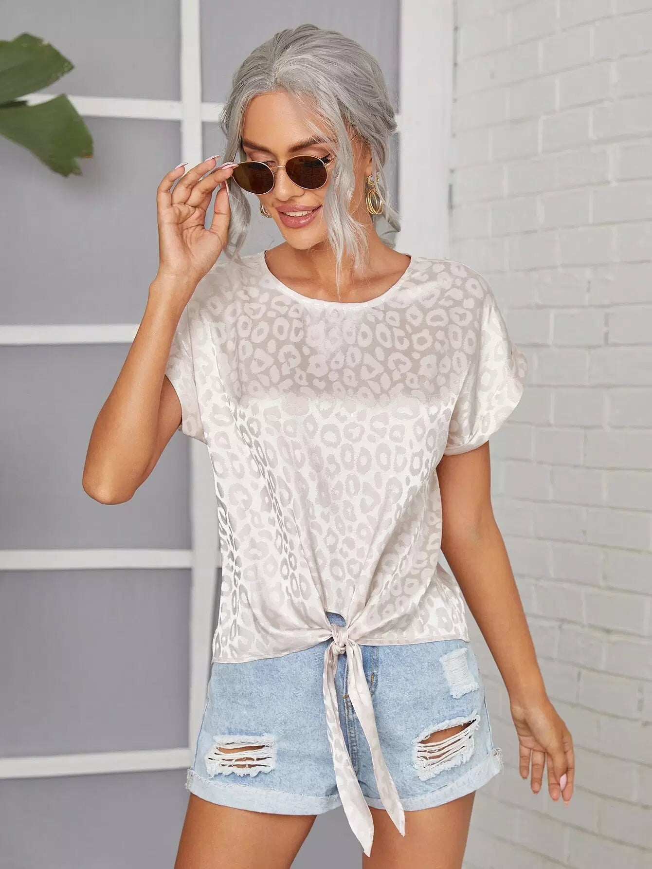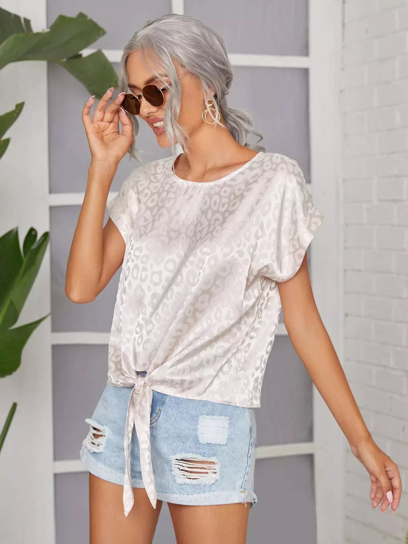 Dolman Sleeve Tie Hem Leopard Jacquard Satin Top