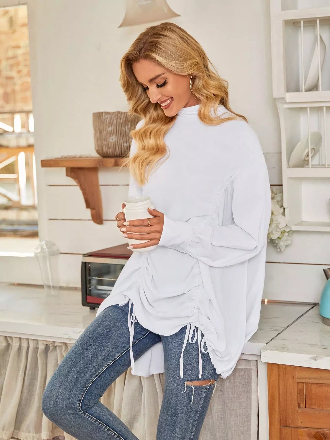 Drawstring Front Bishop Sleeve Tunic Blouse