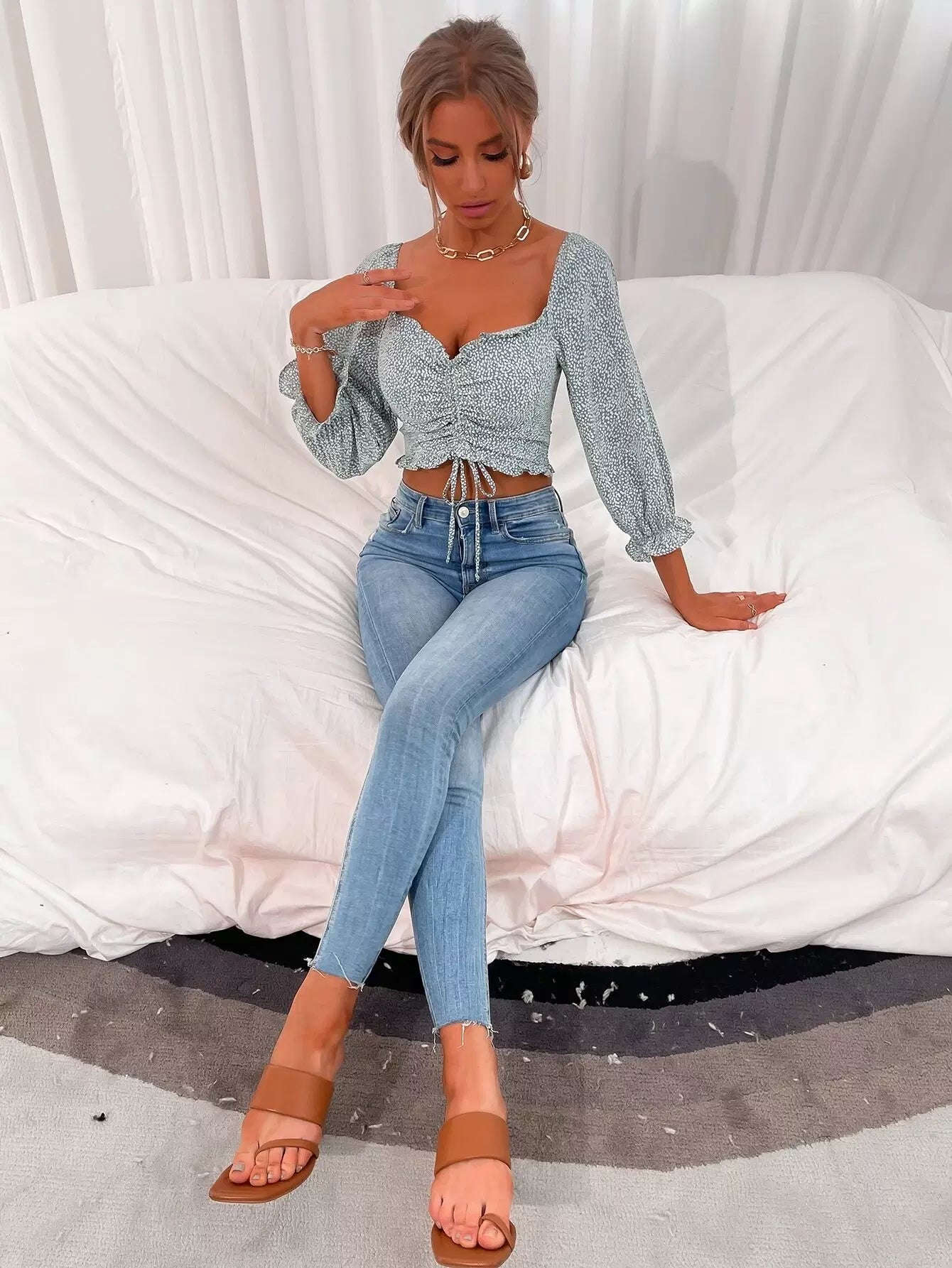 Drawstring Front Flounce Sleeve Milkmaid Top