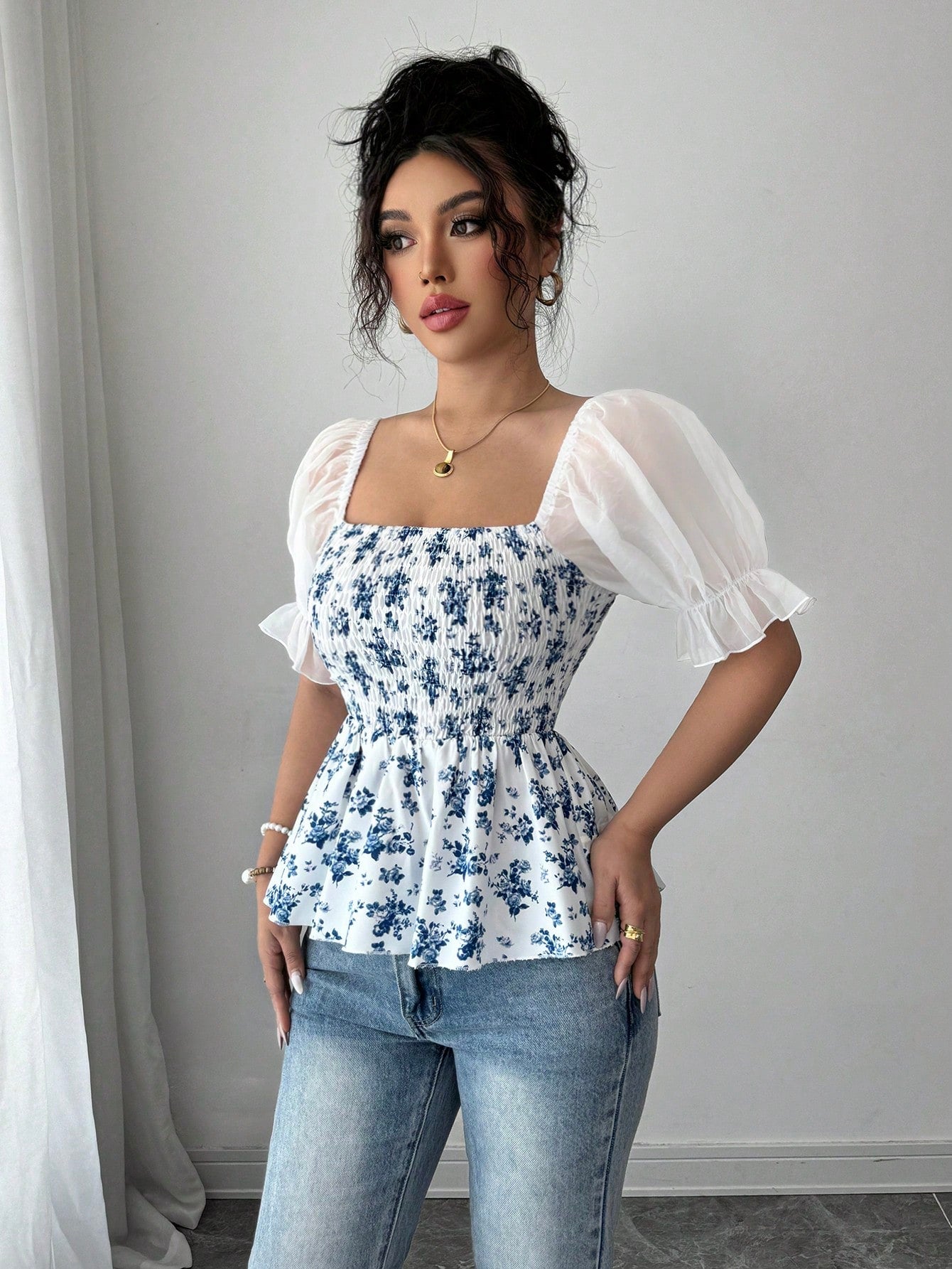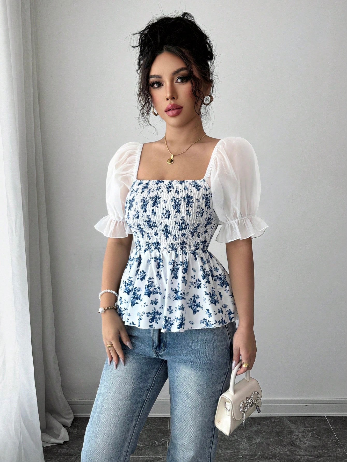 Elenzga Women's Square Neck Pleated Short Sleeve Ruffle Hem Net Yoke Patchwork Blouse With Ditsy Ditsy