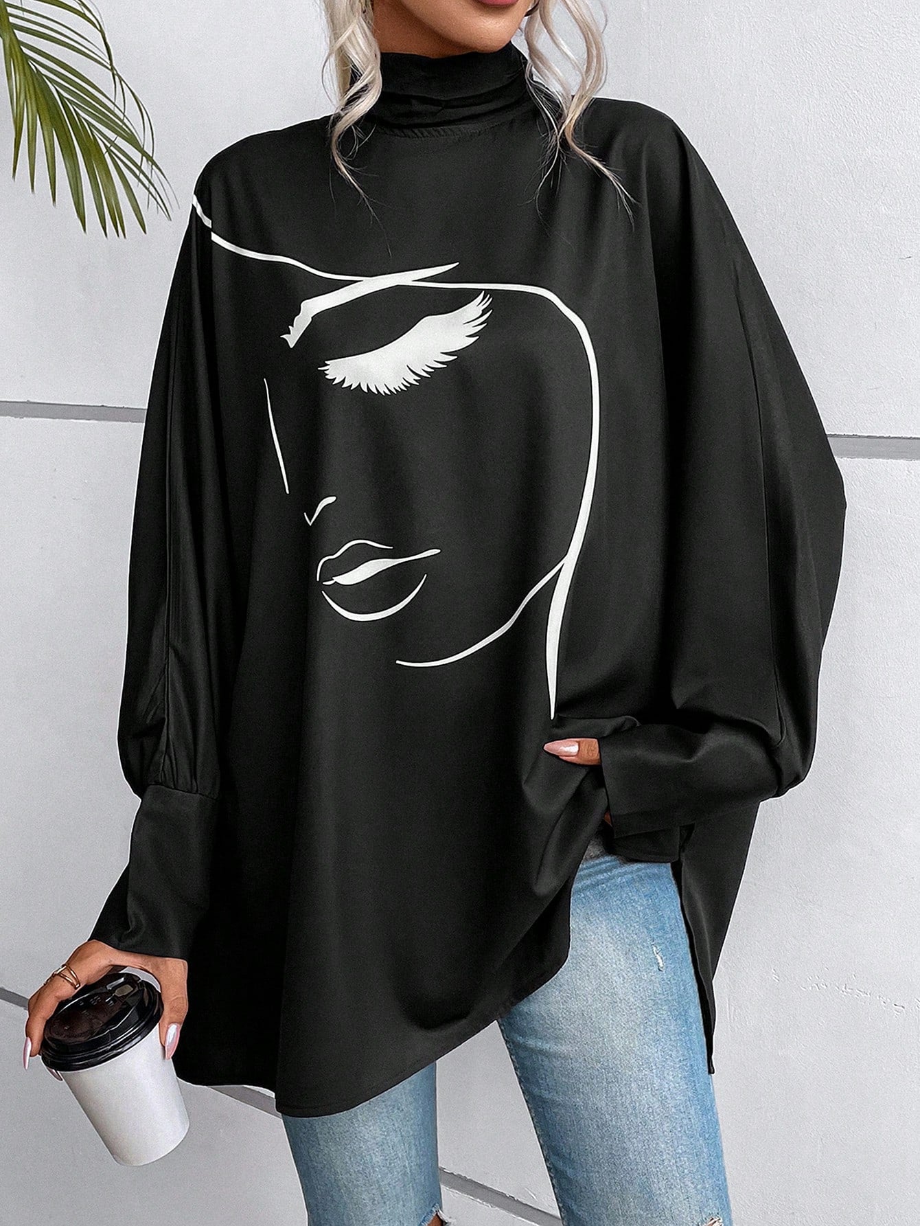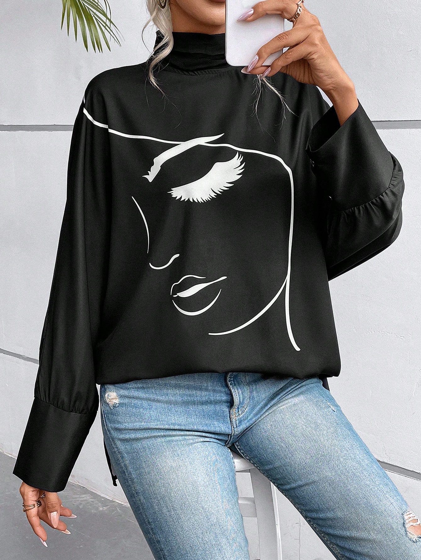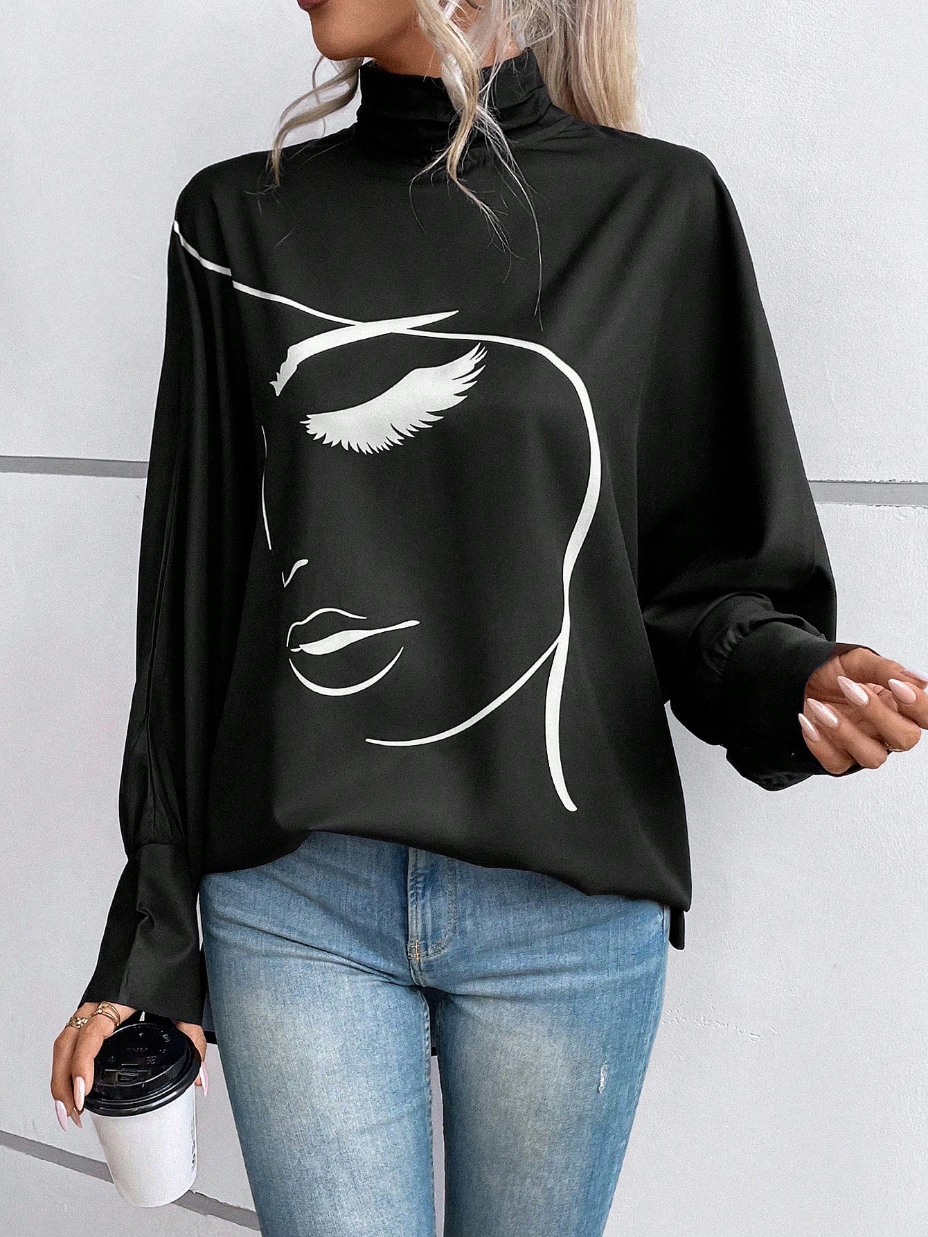 EMERY ROSE Figure Graphic Batwing Sleeve Mock Neck Blouse Fall Cloth For Women