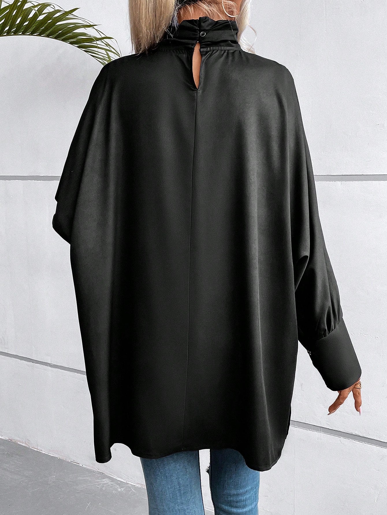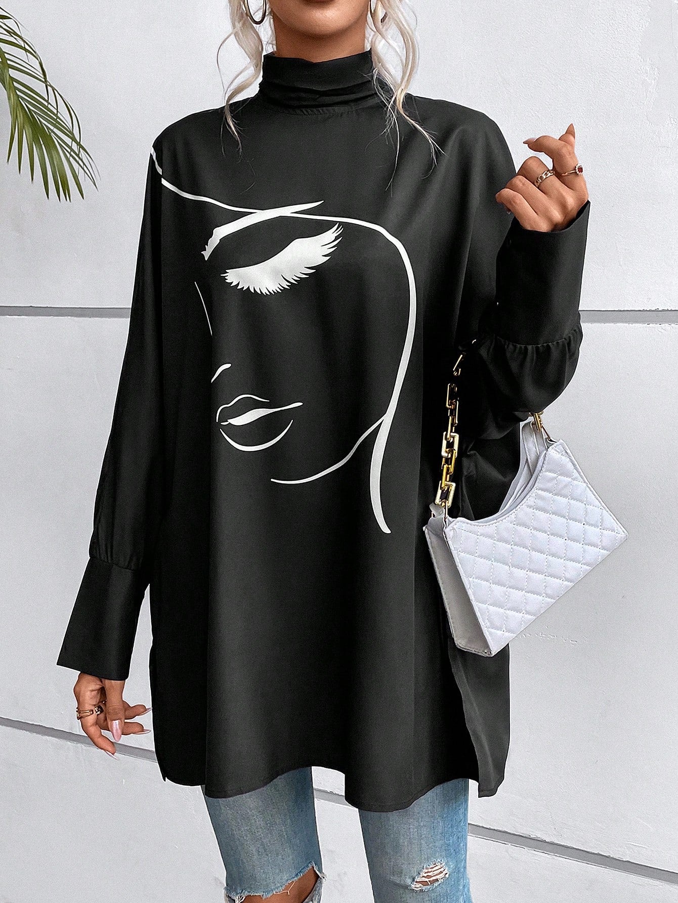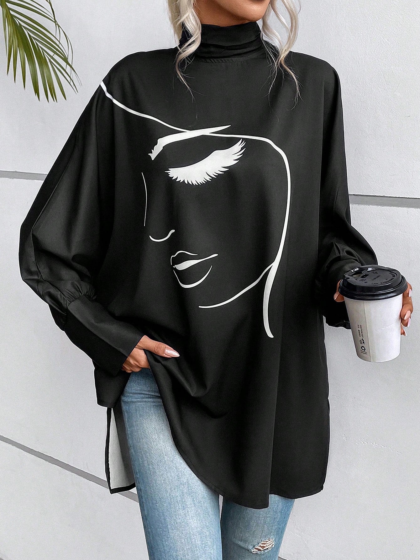 EMERY ROSE Figure Graphic Batwing Sleeve Mock Neck Blouse Fall Cloth For Women