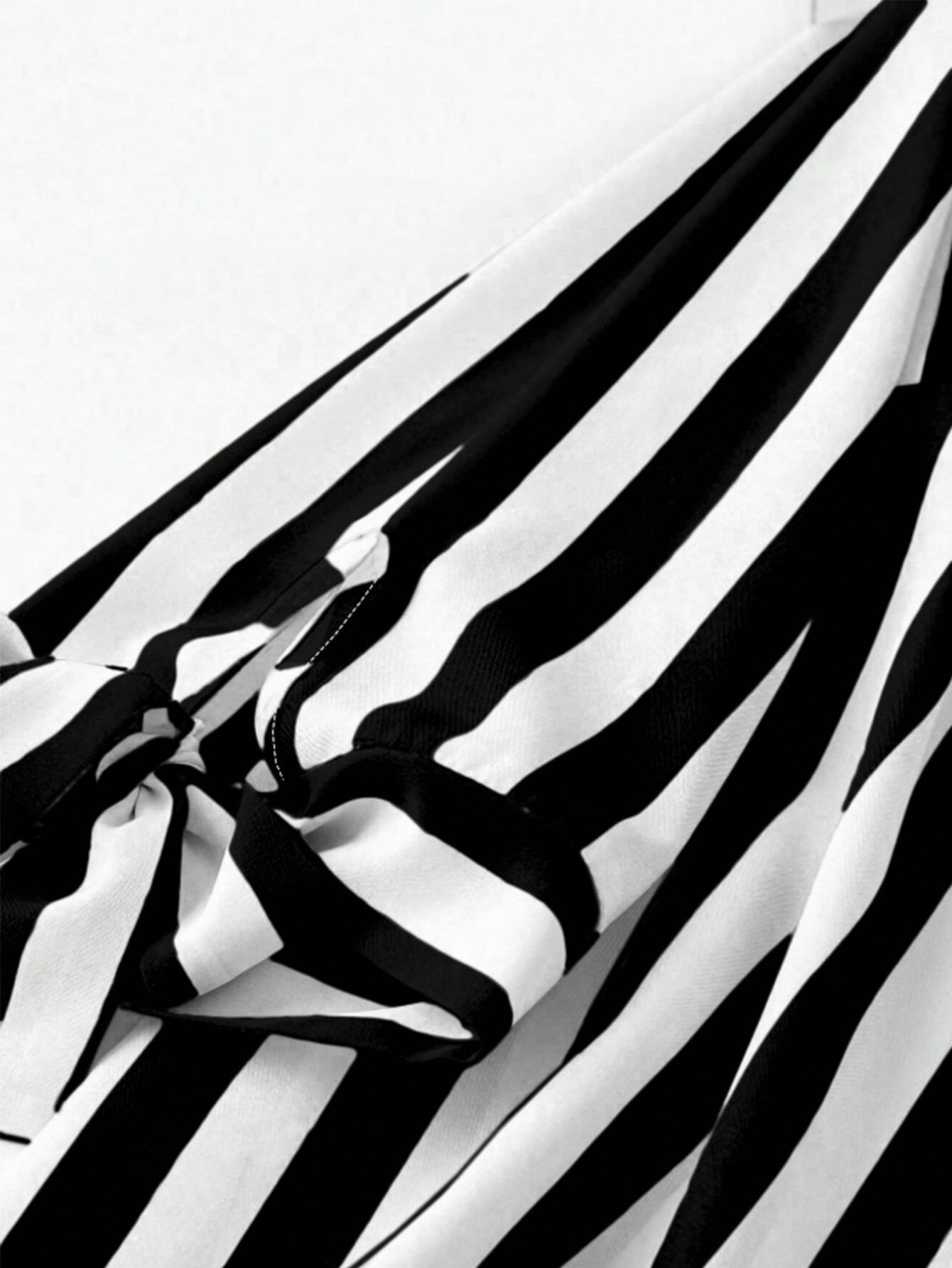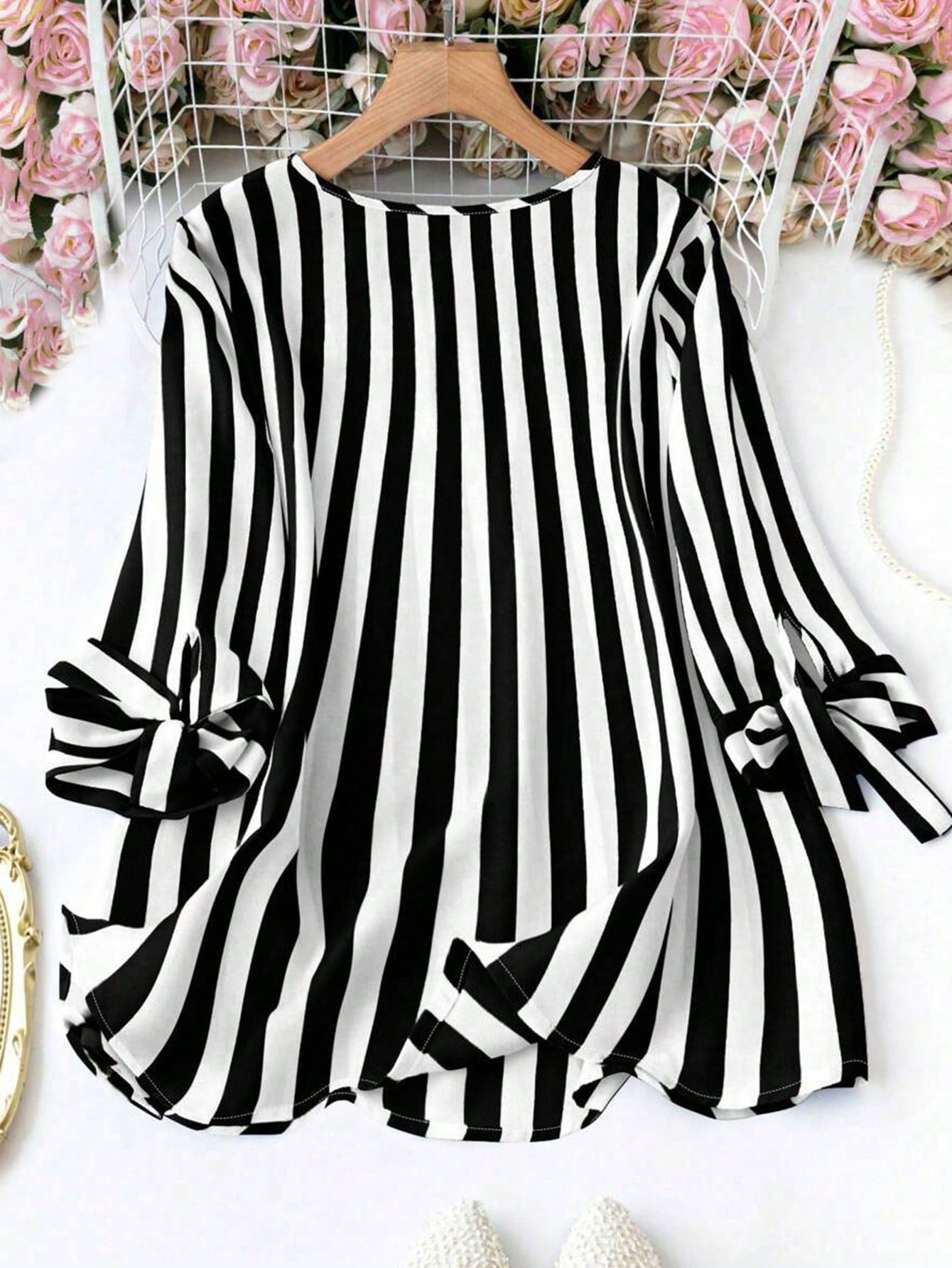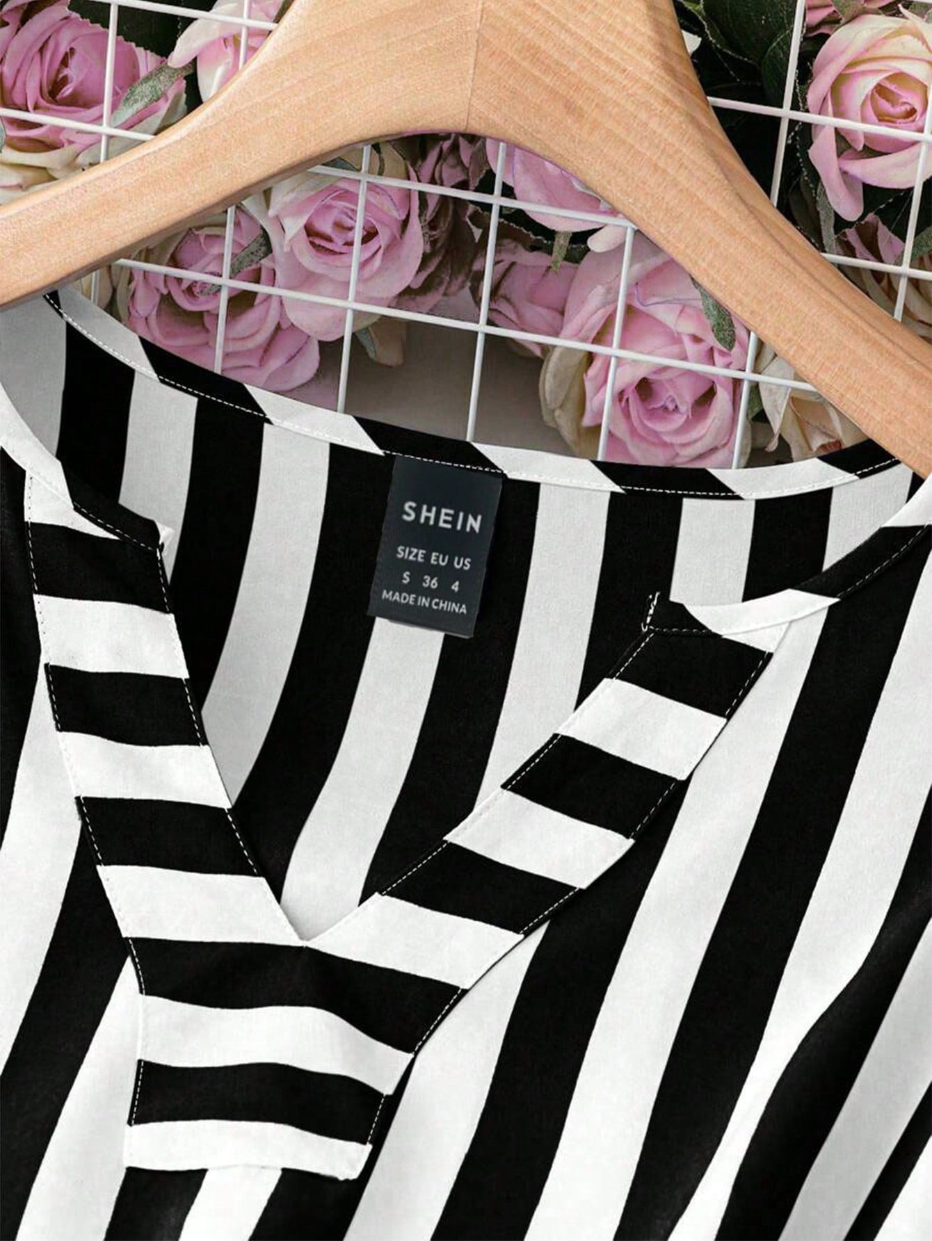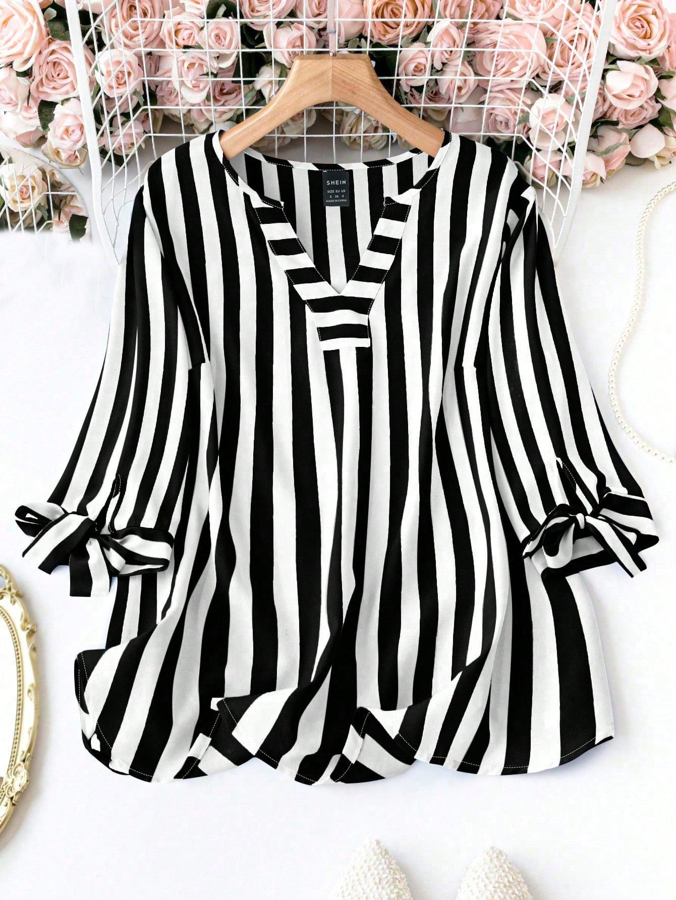 EMERY ROSE Summer Small V-Neck Striped Tie 3/4 Sleeve Casual Holiday Shirt,Three Quarter Sleeve Tops