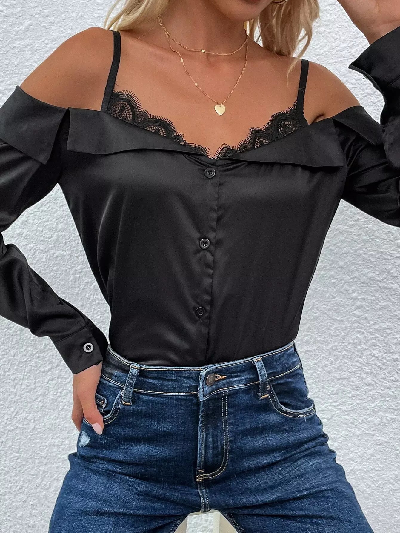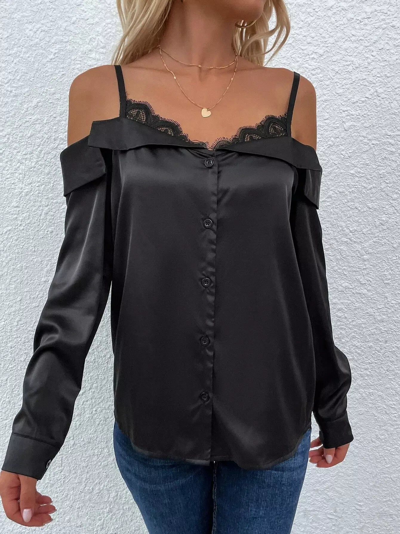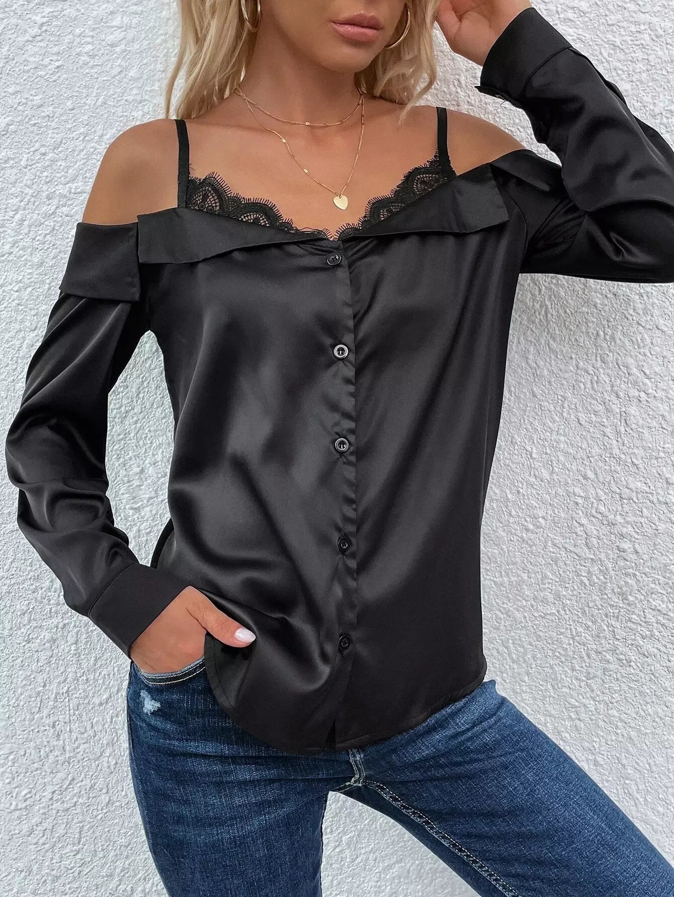 Eyelash Lace Detail Cold Shoulder Satin Blouse
