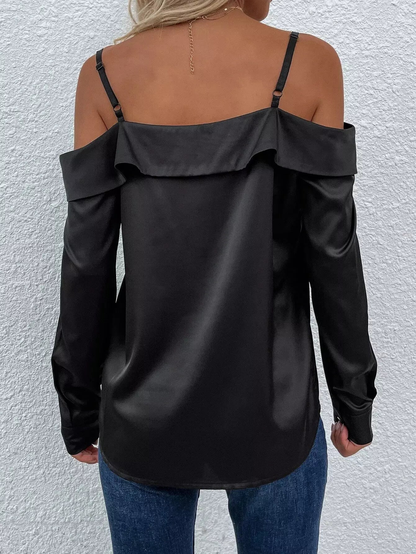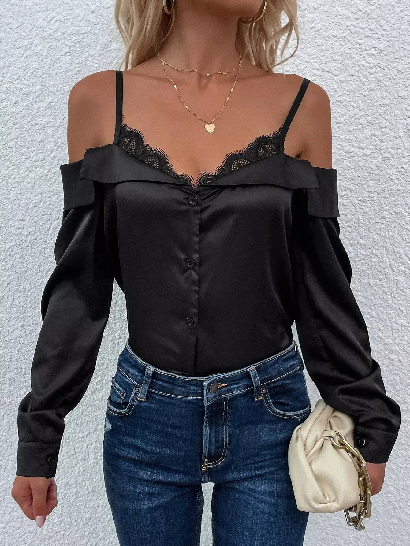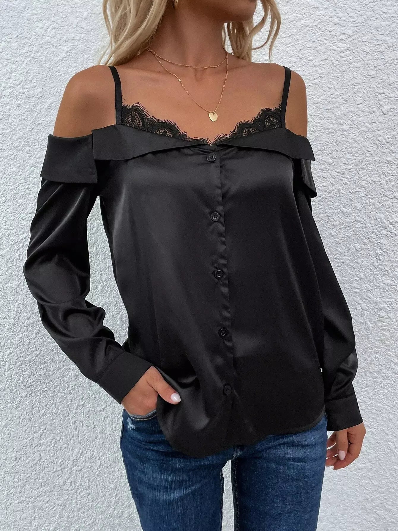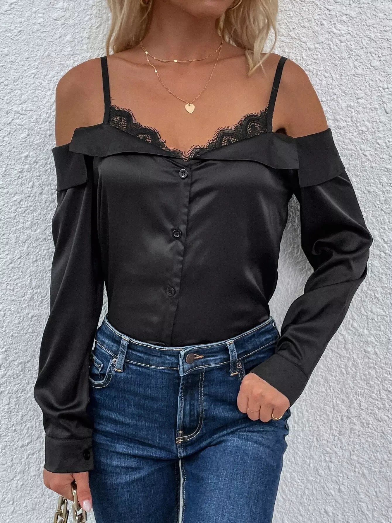 Eyelash Lace Detail Cold Shoulder Satin Blouse