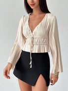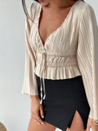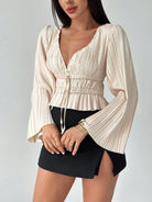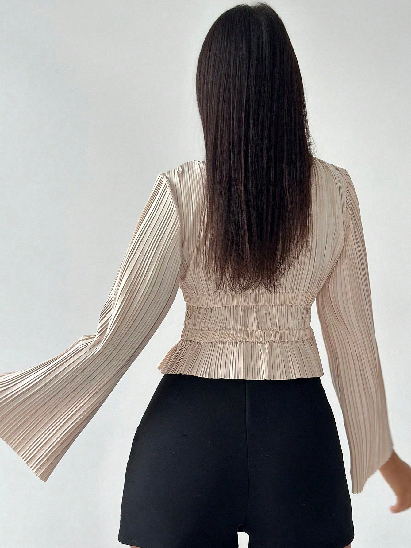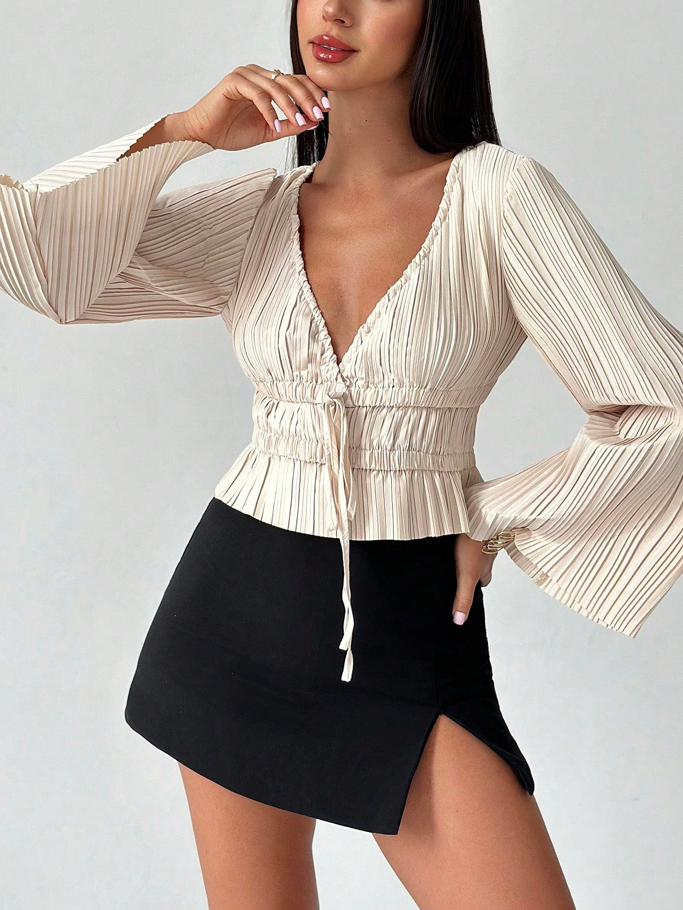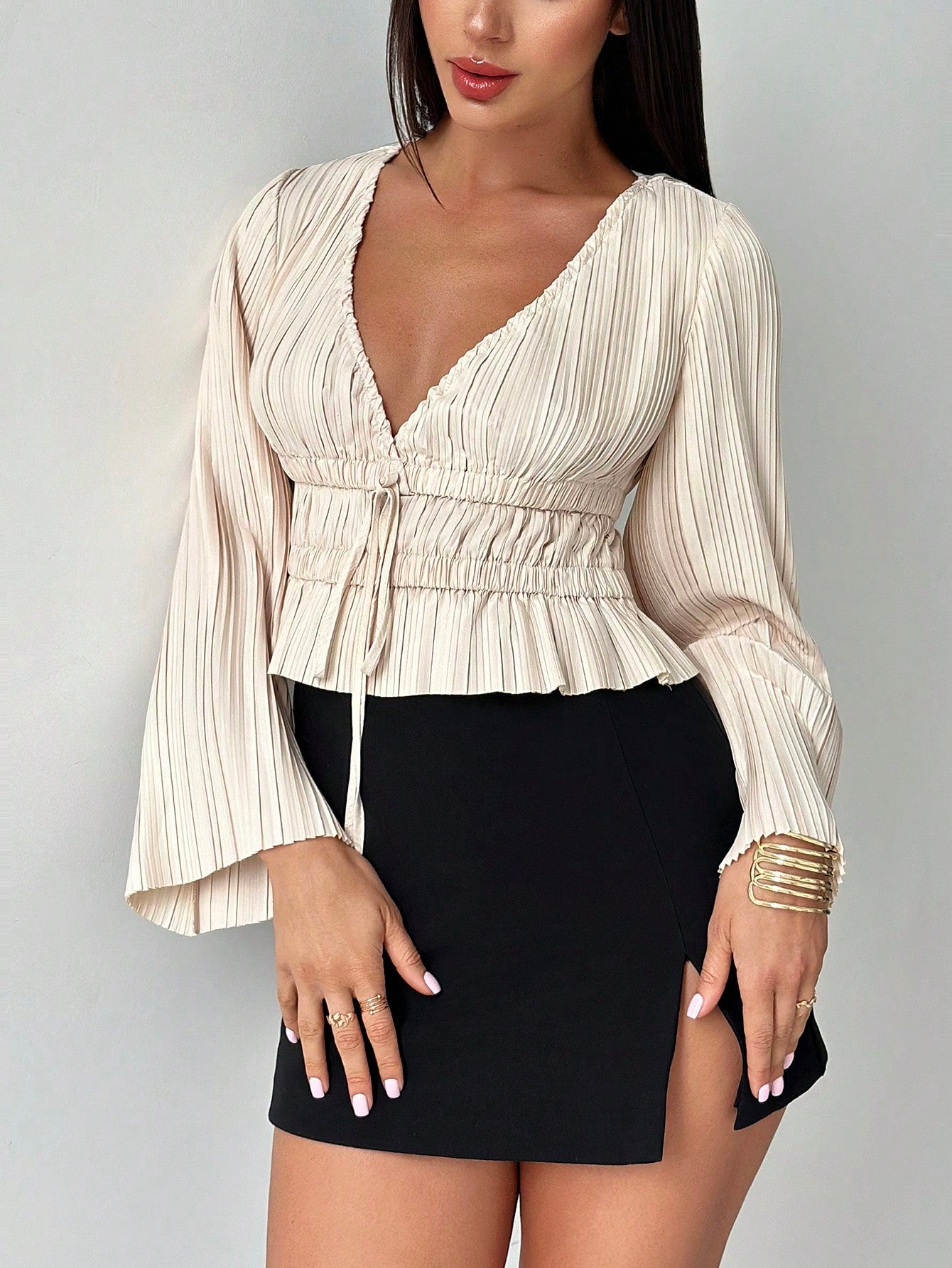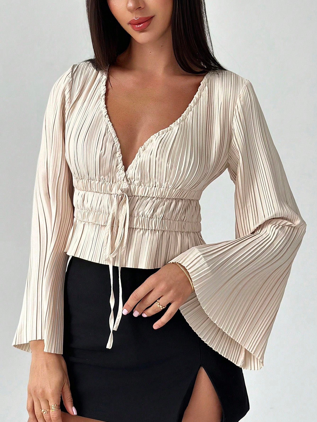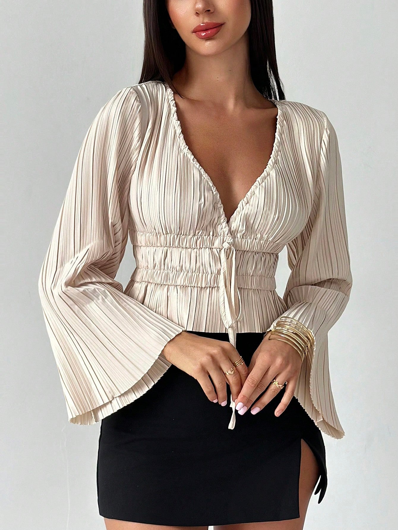 Firerie Women's Elegant Minimalist Stylish Romantic V-Neck Tie-Waist Pleated Flare Sleeve Beige Blouse,