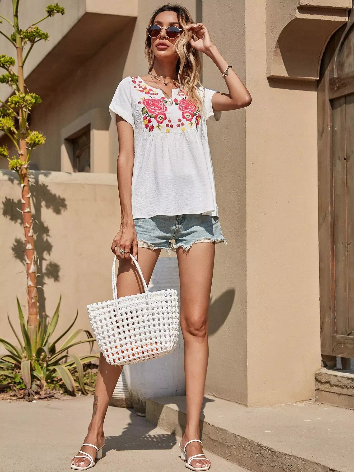 Floral Embroidery Notched Blouse