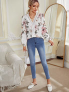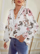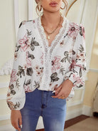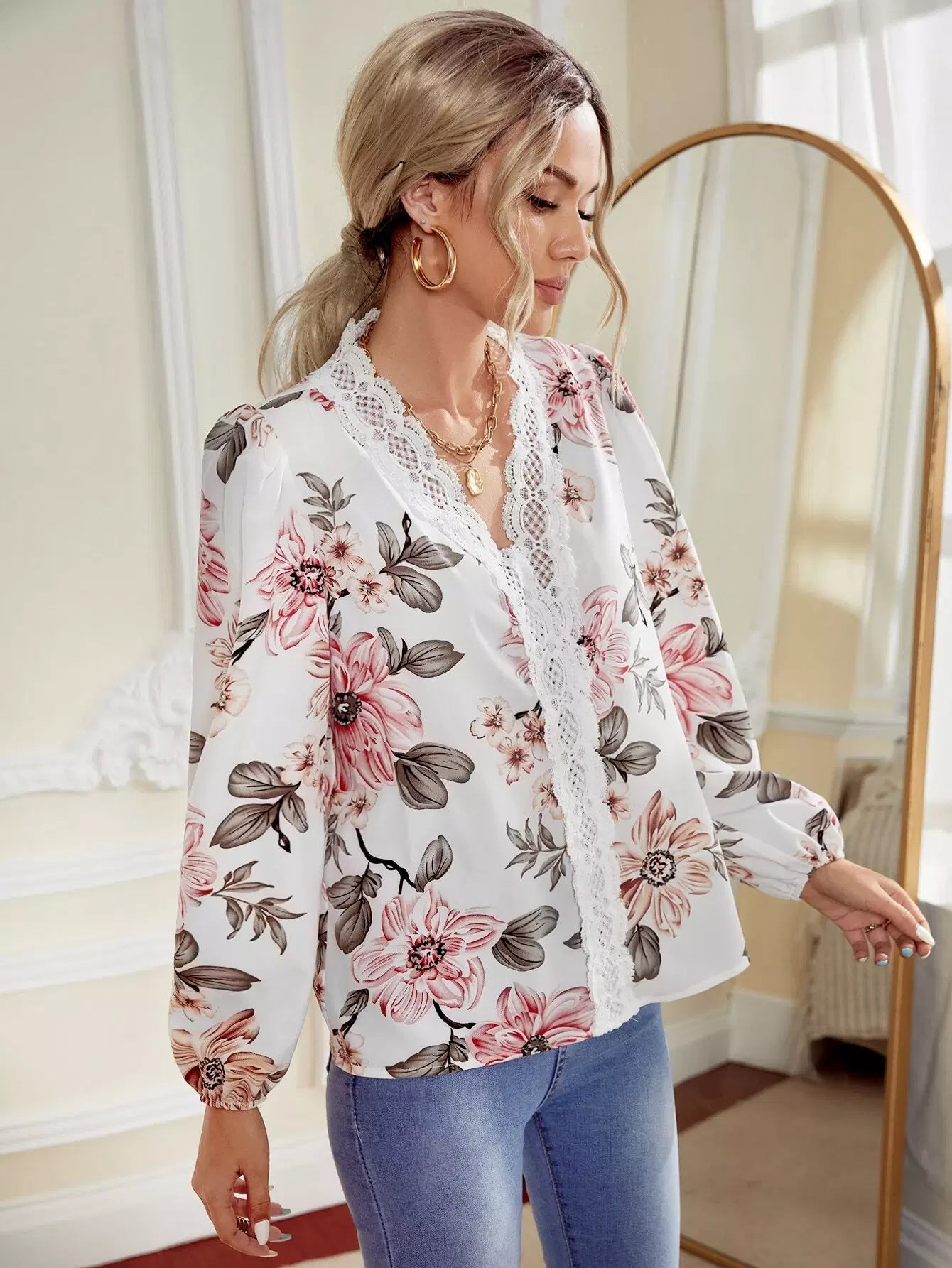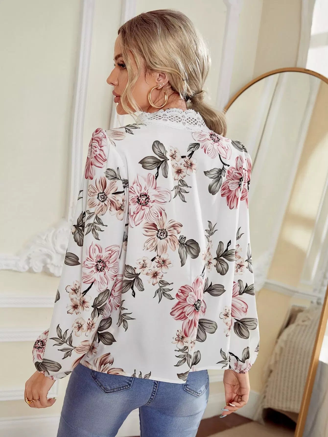 Floral Print Guipure Lace Insert Lantern Sleeve Blouse