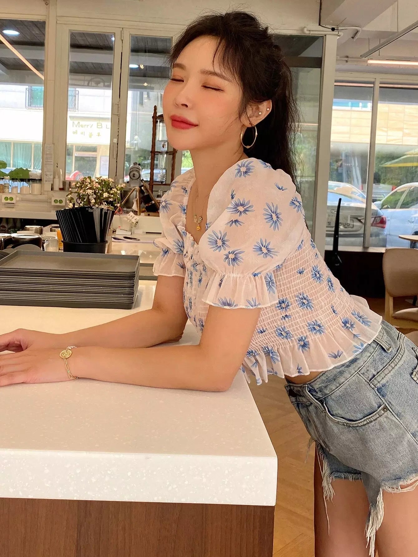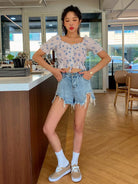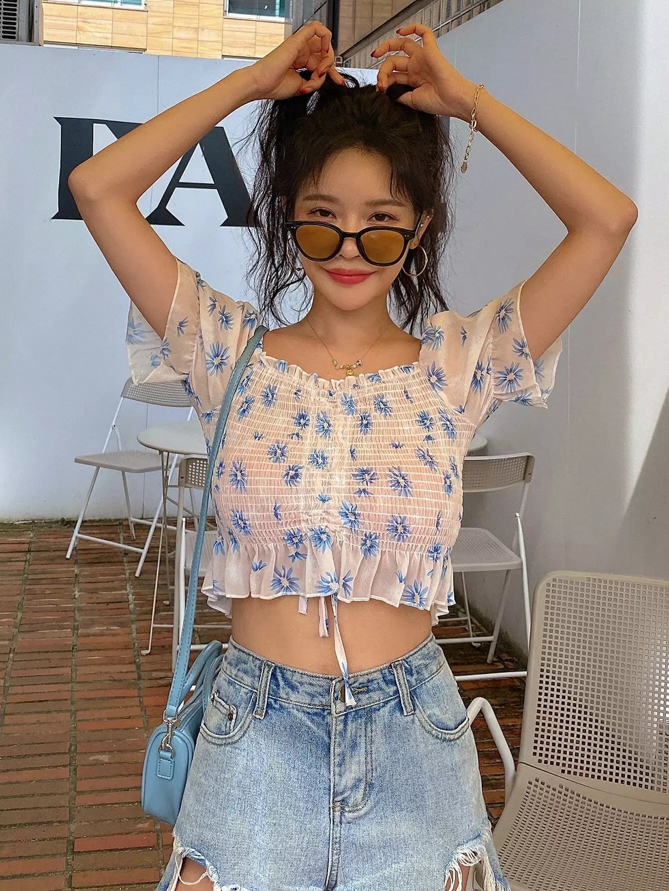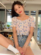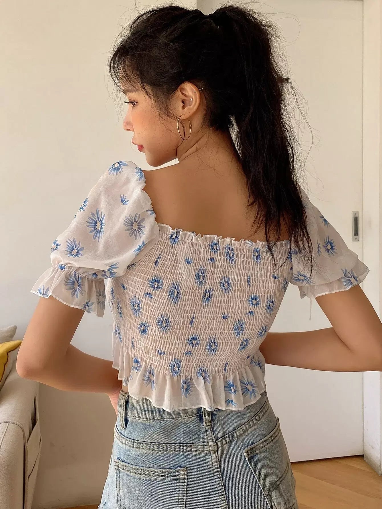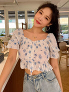 Floral Print Ruffle Detail Drawstring Blouse