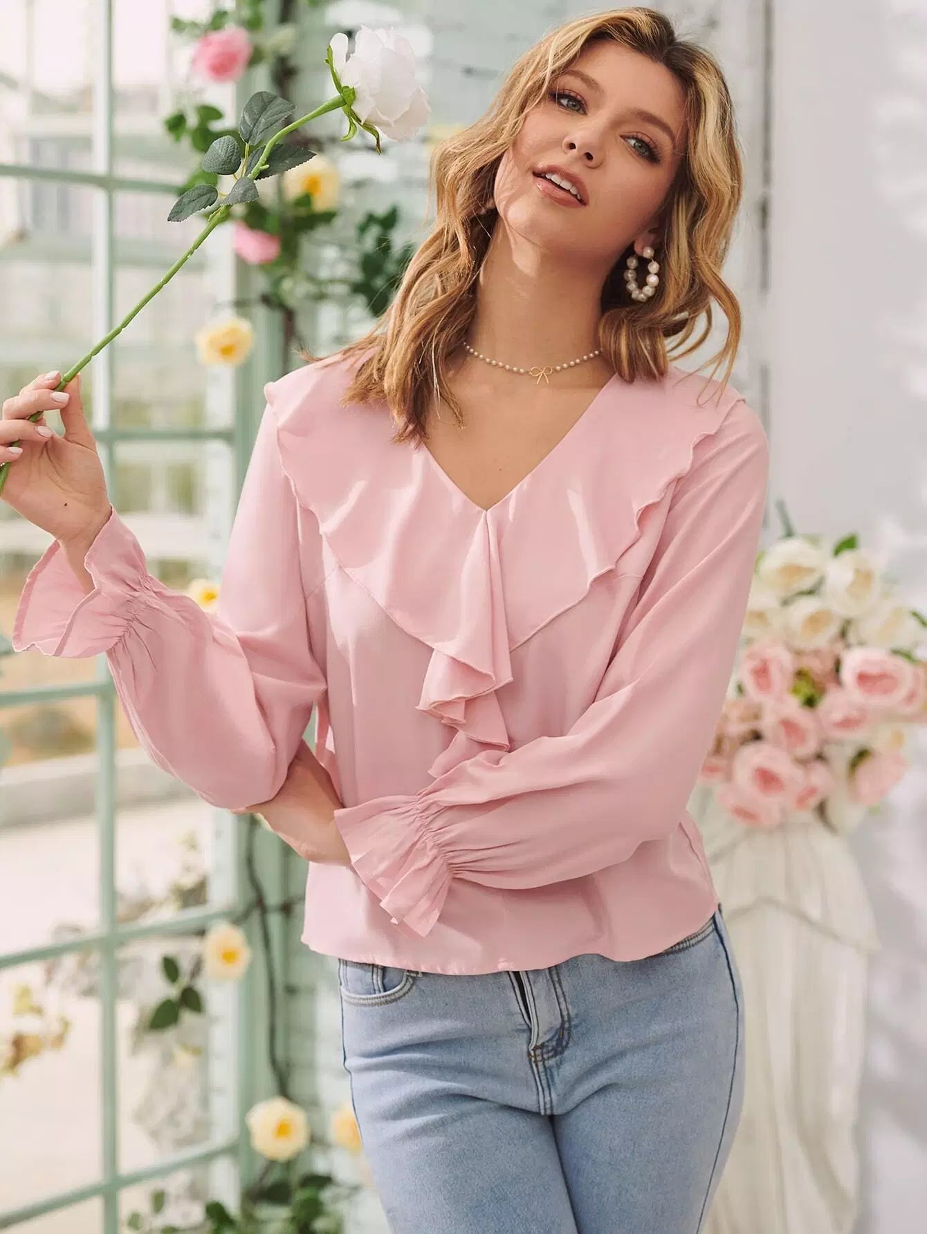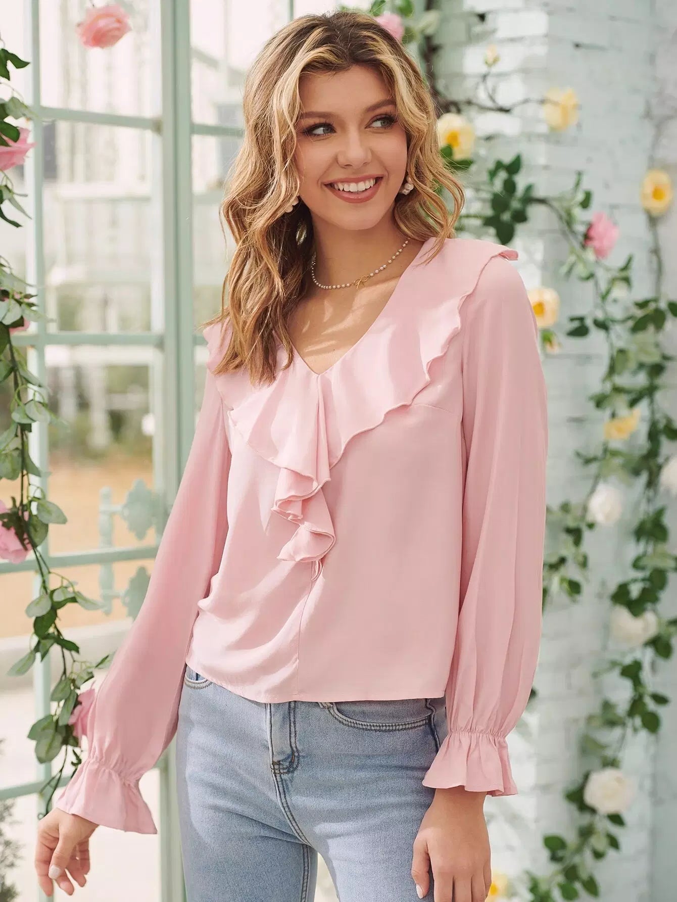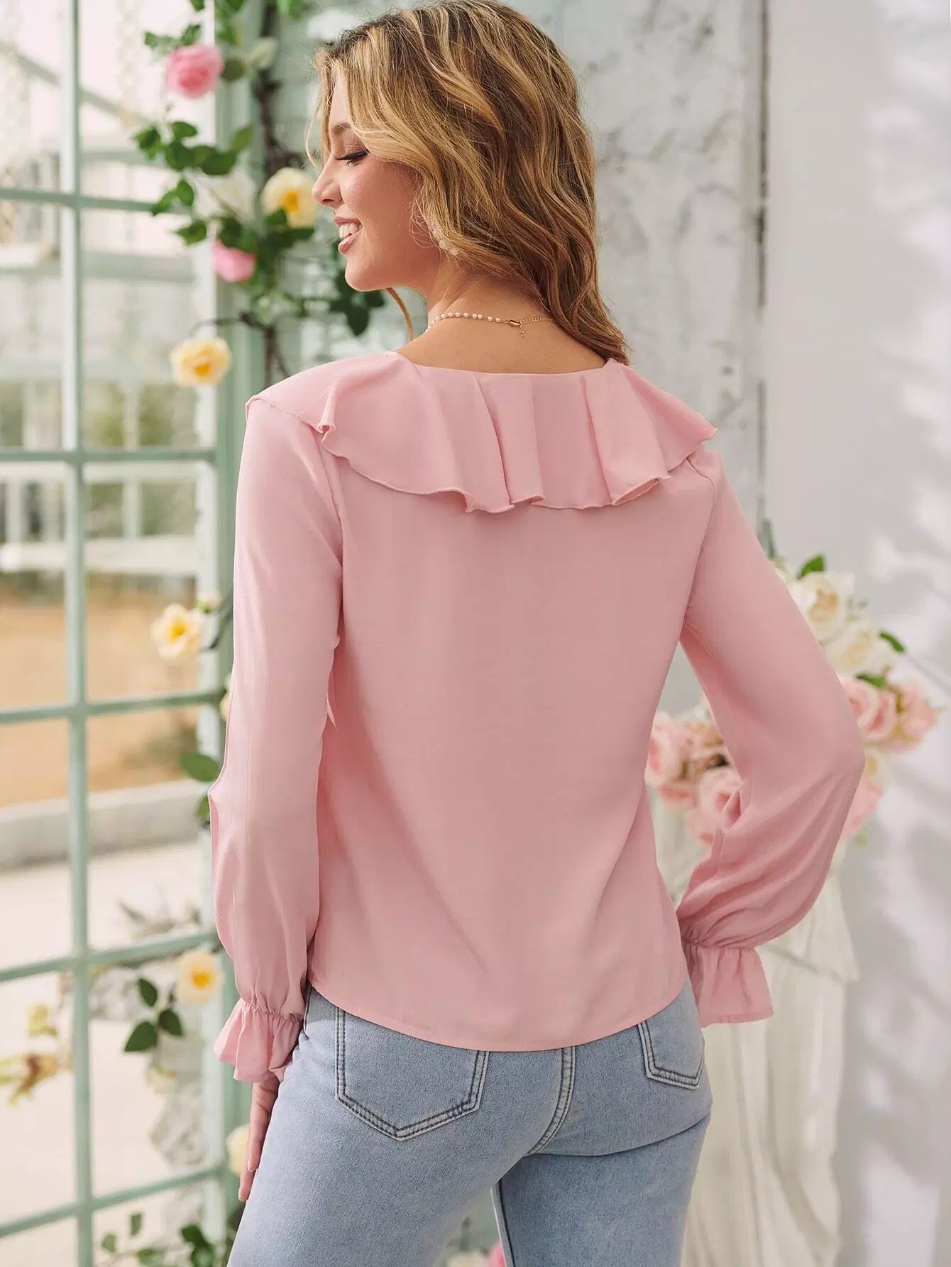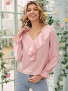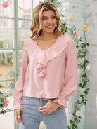 Flounce Sleeve Ruffle Trim Blouse
