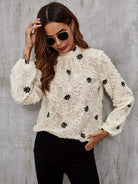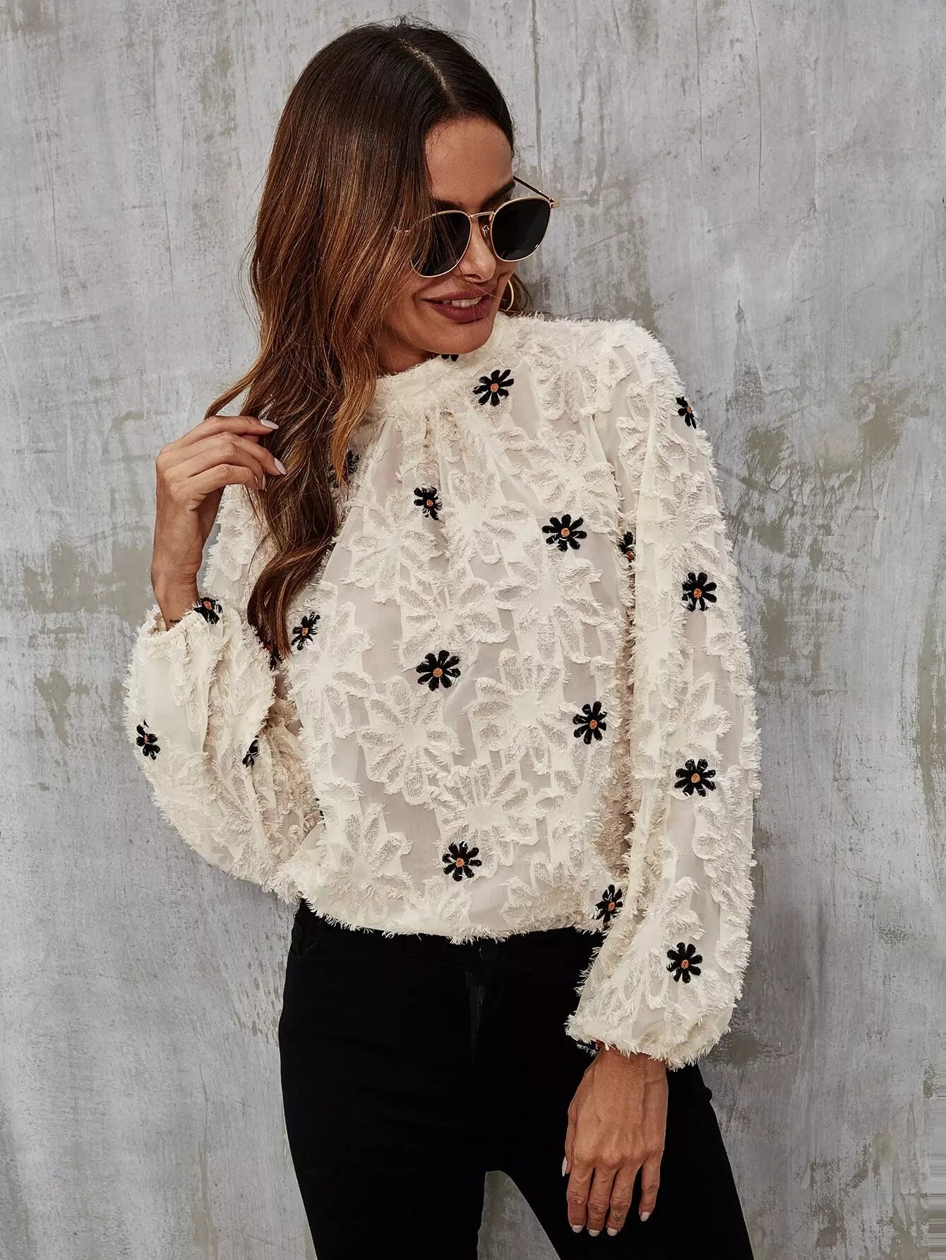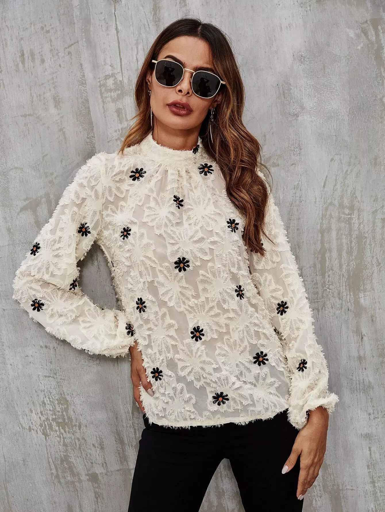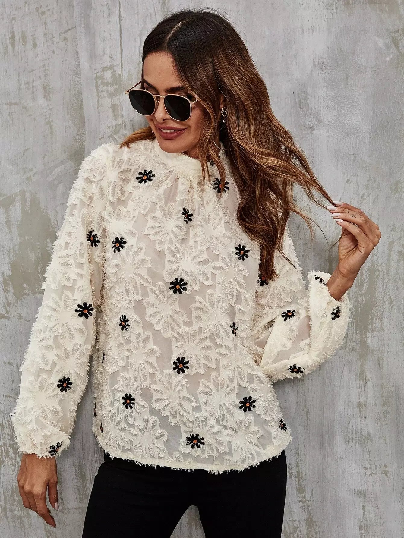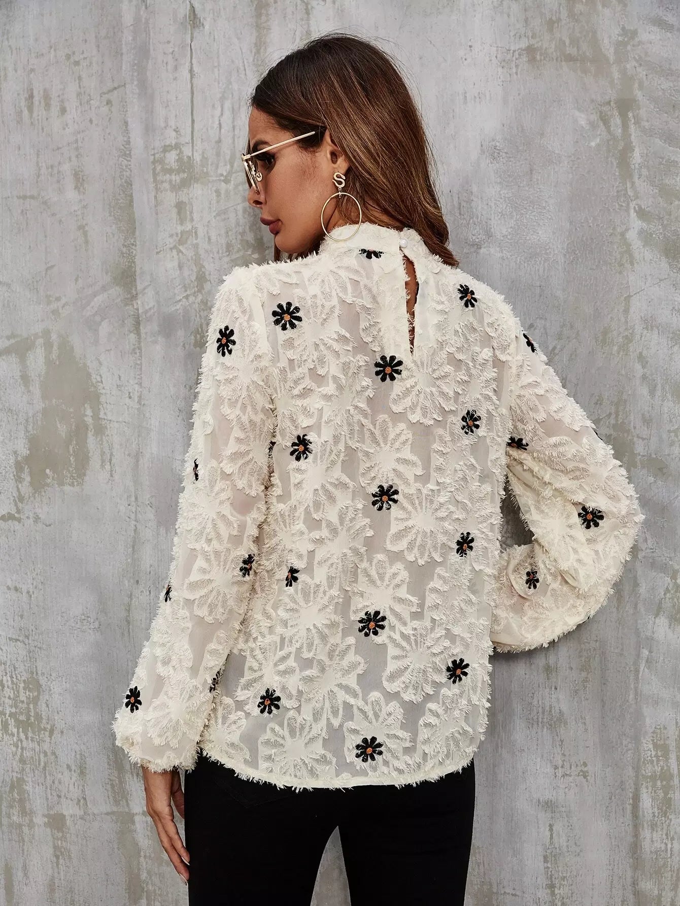Flower Embroidery Fuzzy Keyhole Back Blouse