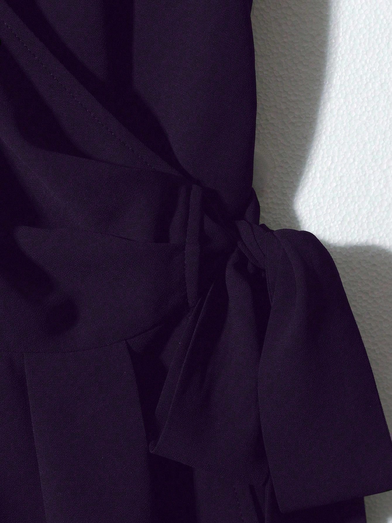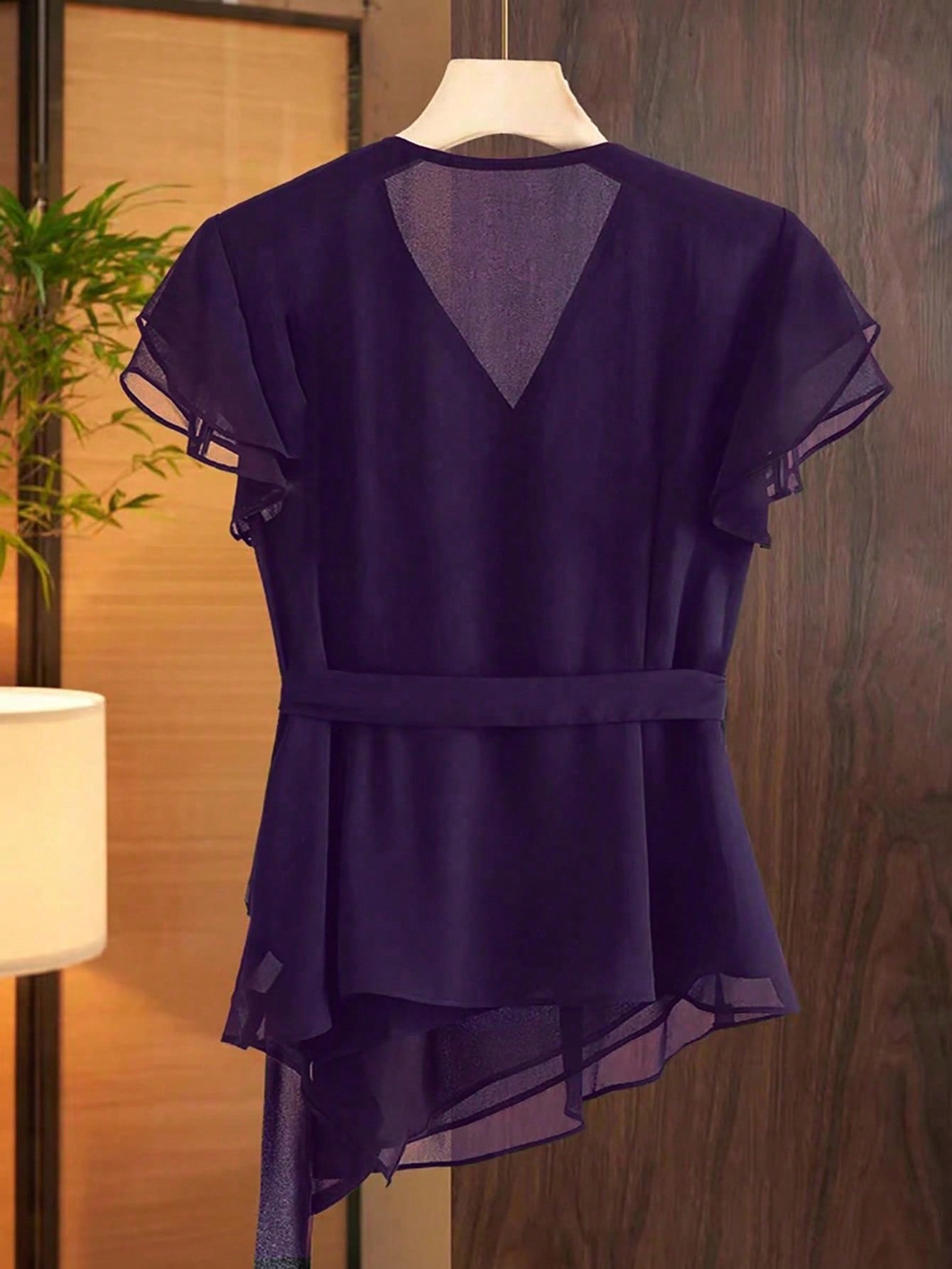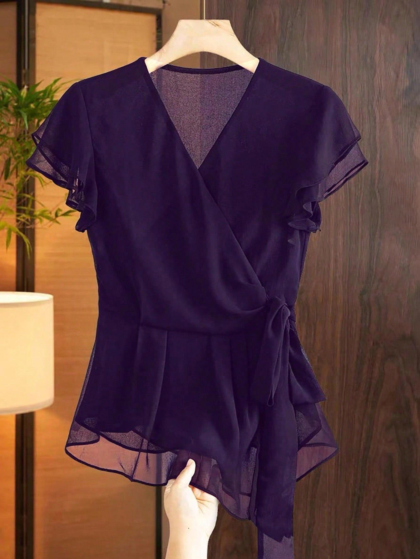 Franclia V-Neck Ruffled Trim Tied Waist Flared Cuff Chiffon Blouse