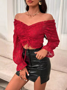 Frilled Off Shoulder Flounce Sleeve Drawstring Front Mesh Crop Blouse