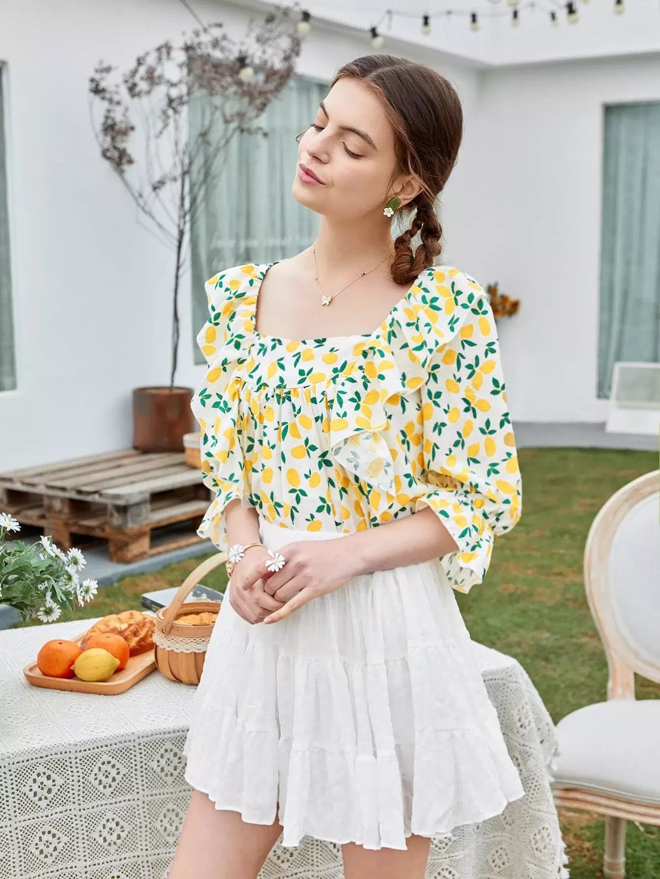 Fruit & Leaf Print Ruffle Trimed Blouse