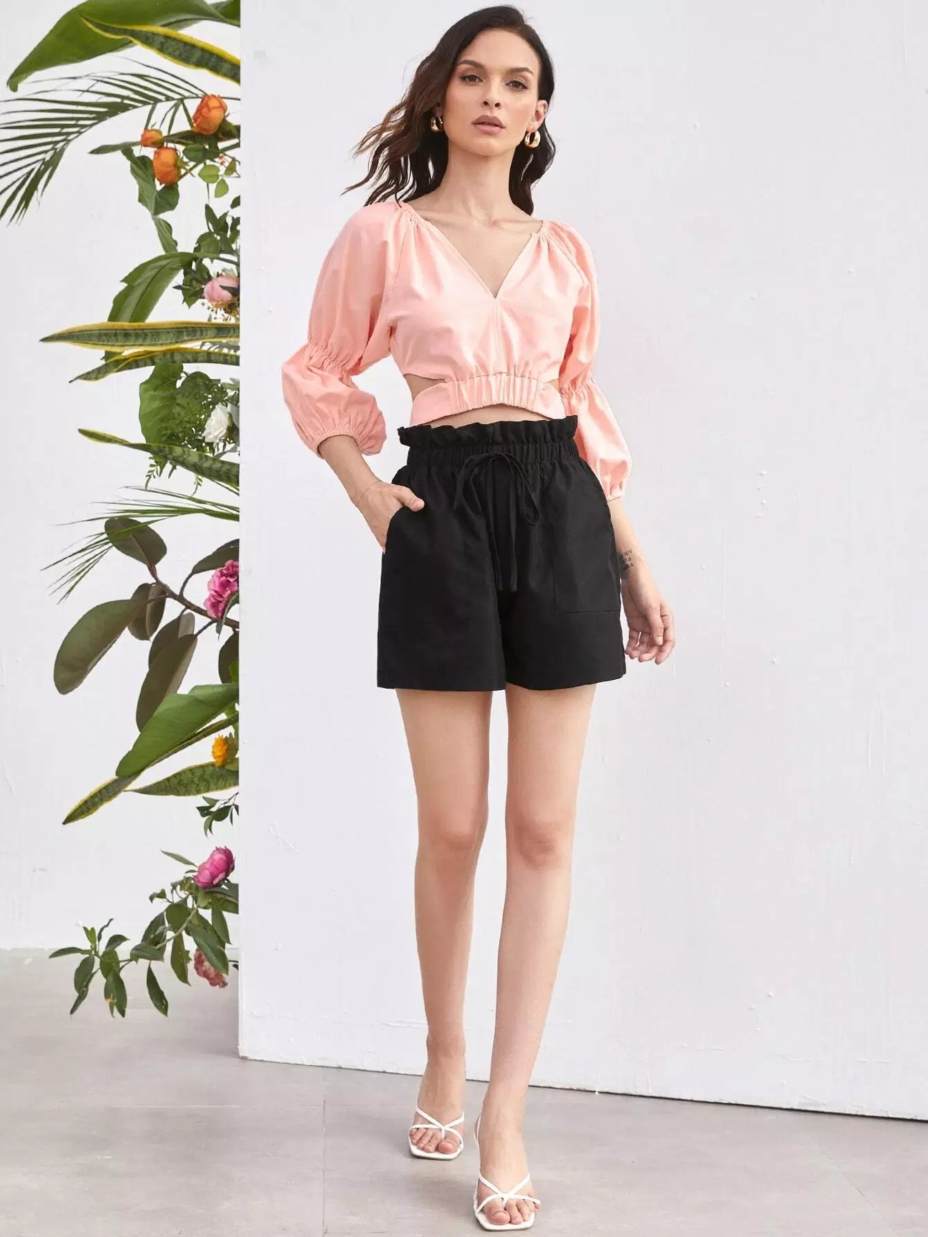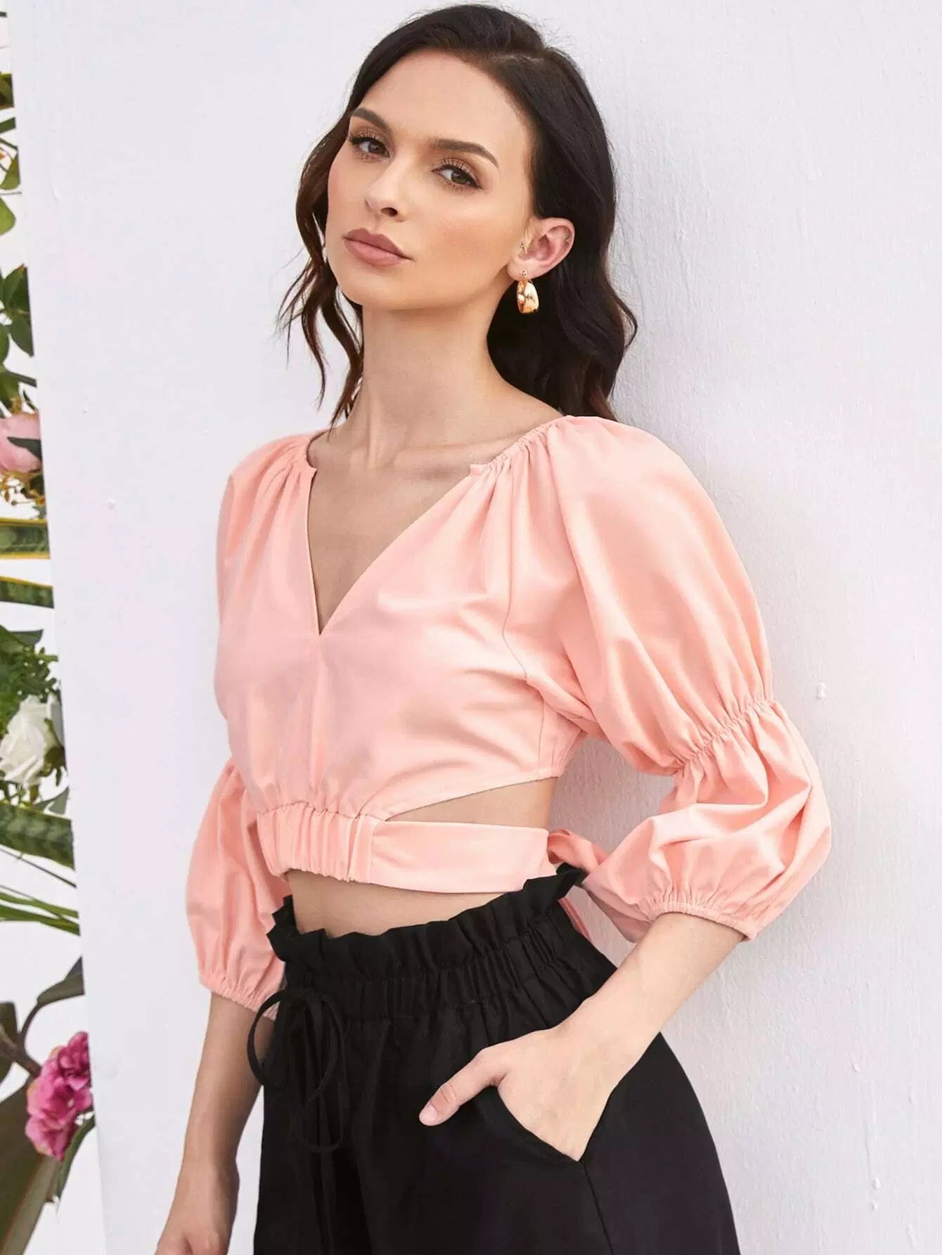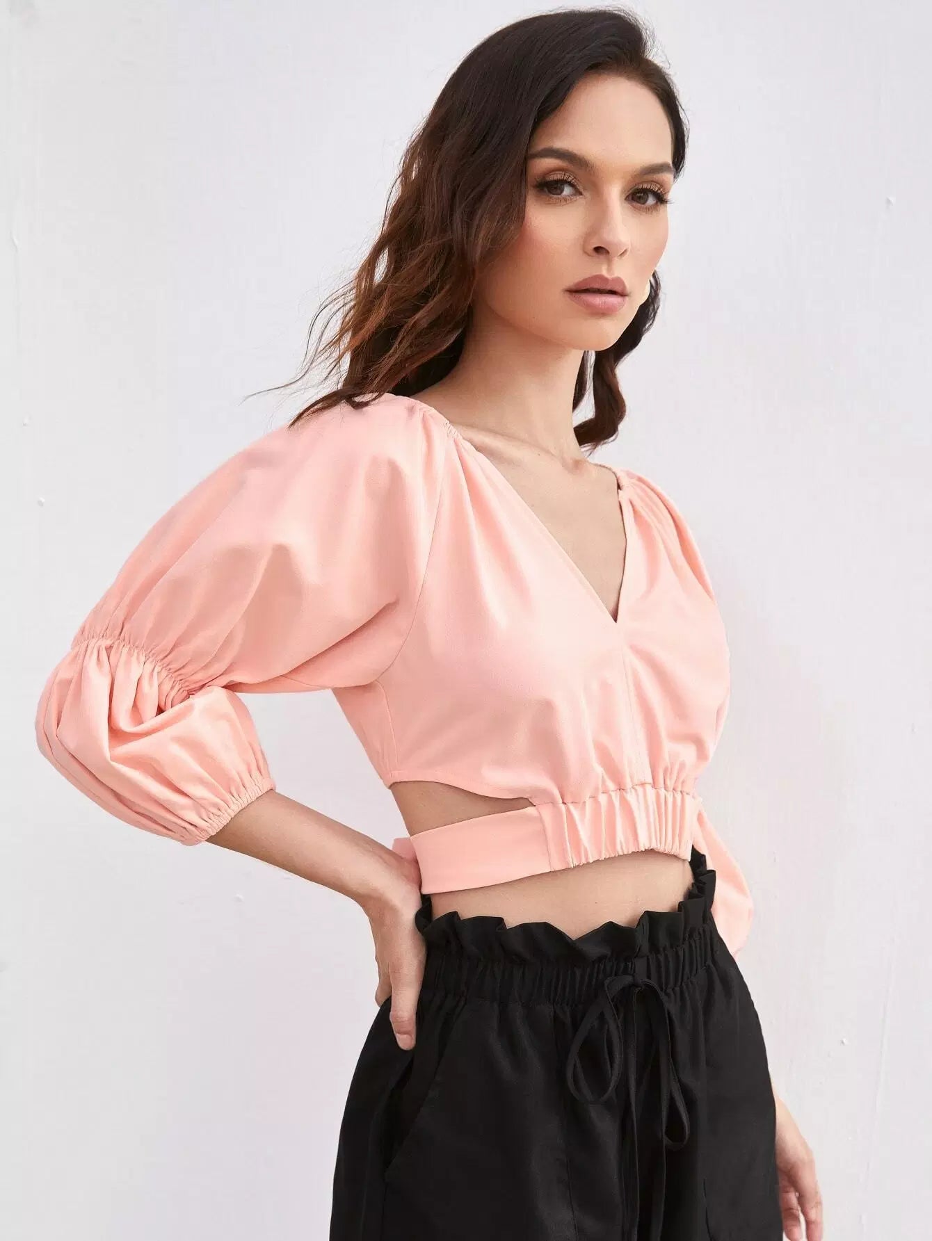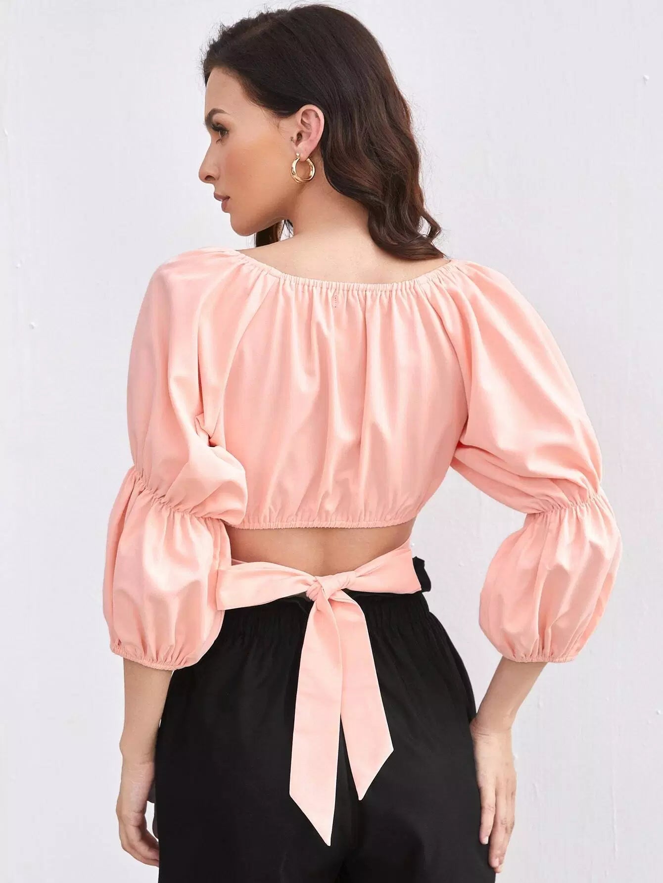 Gather Sleeve Notch Neck Tie Back Crop Top