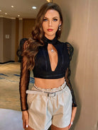 Gigot Sleeve Cut Out Glitter Mesh Top