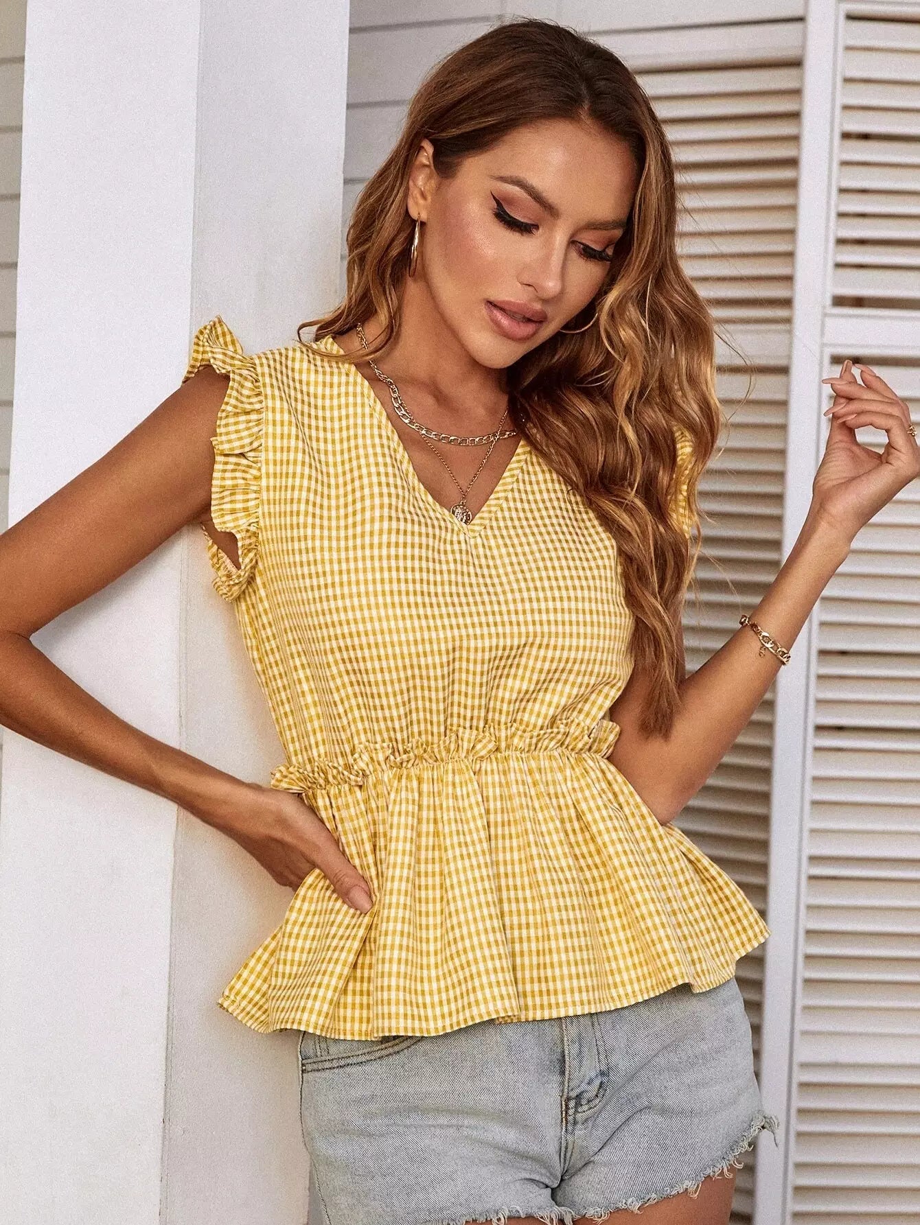 Gingham Frill Trim Peplum Blouse