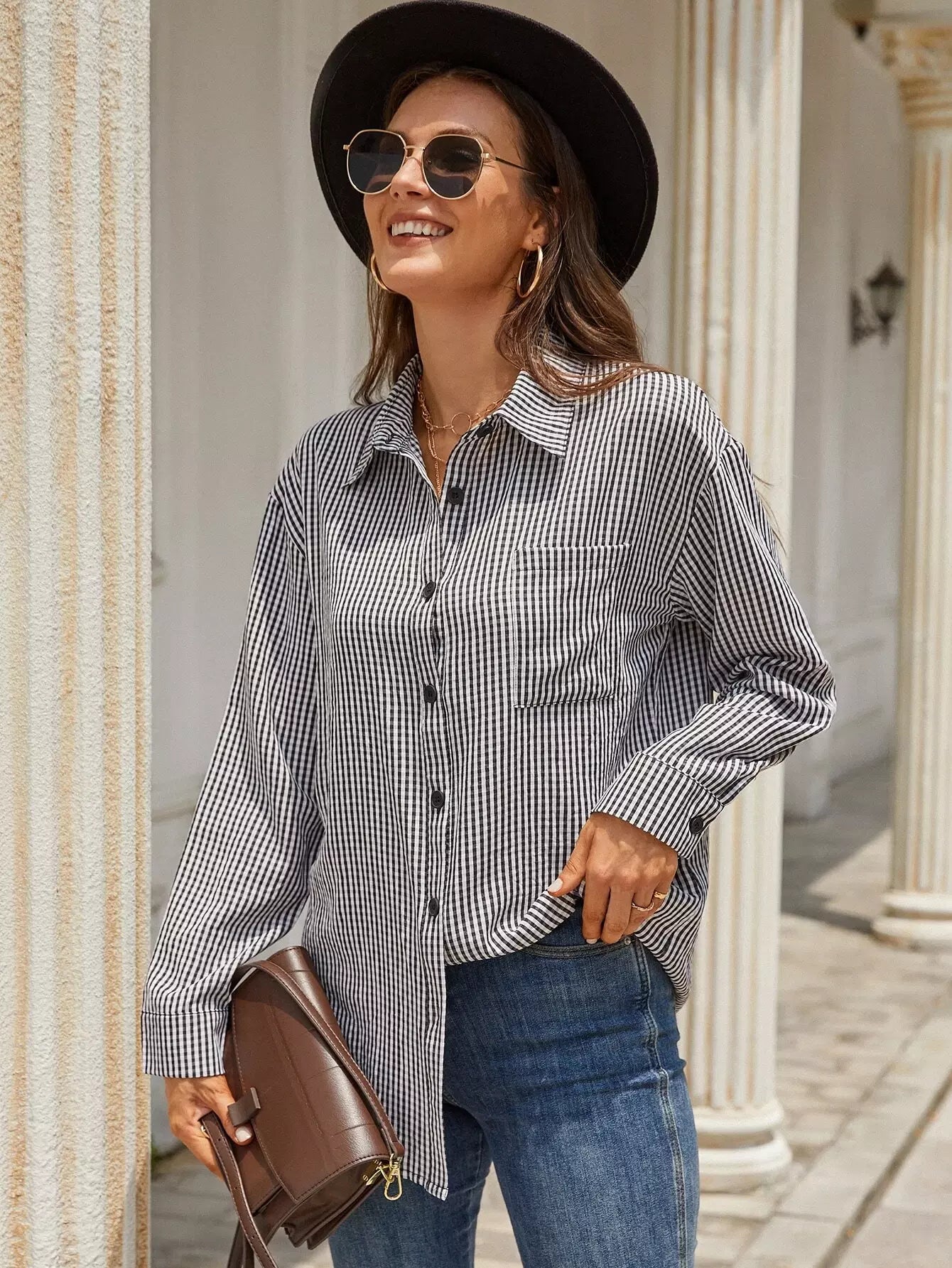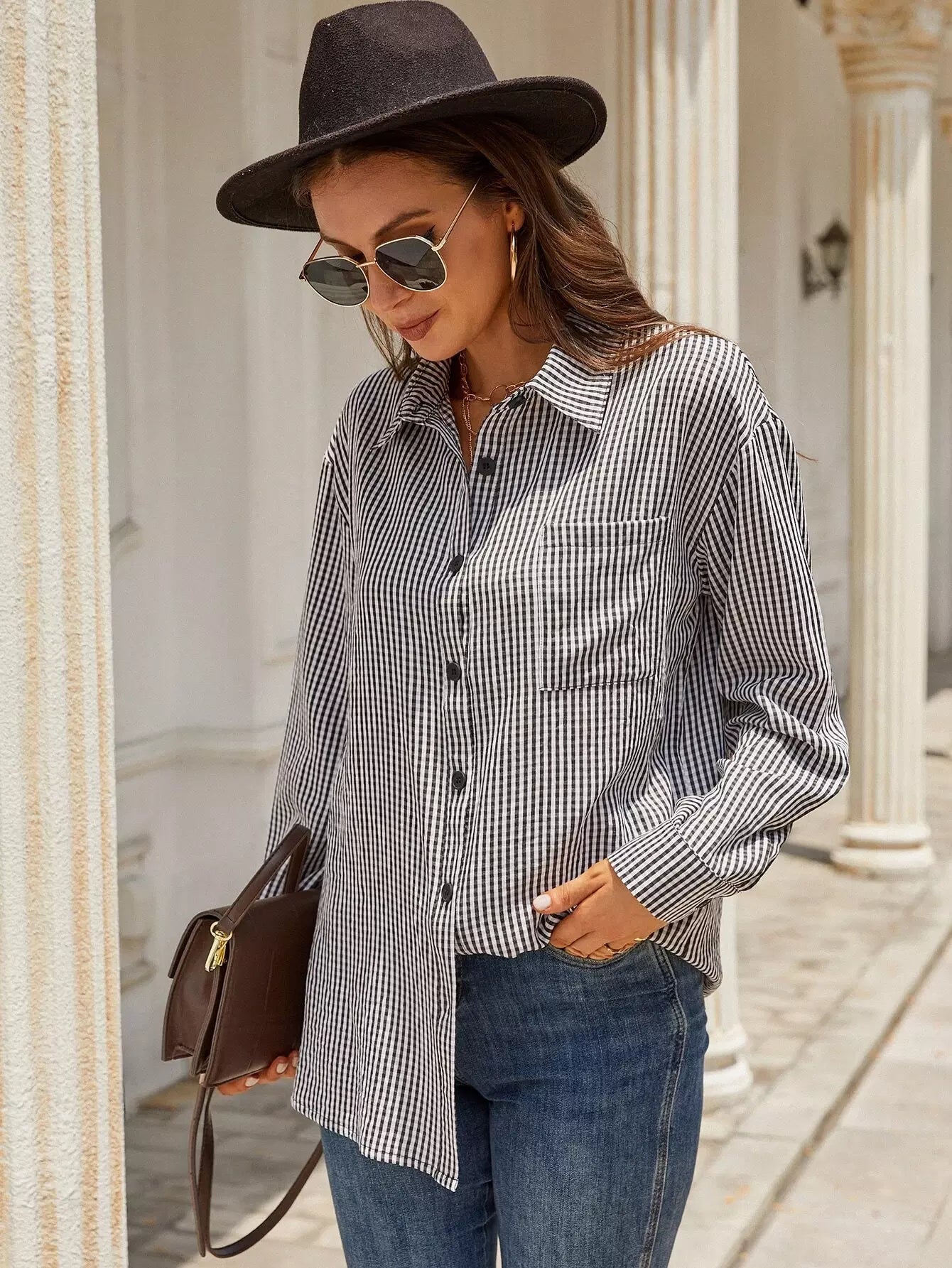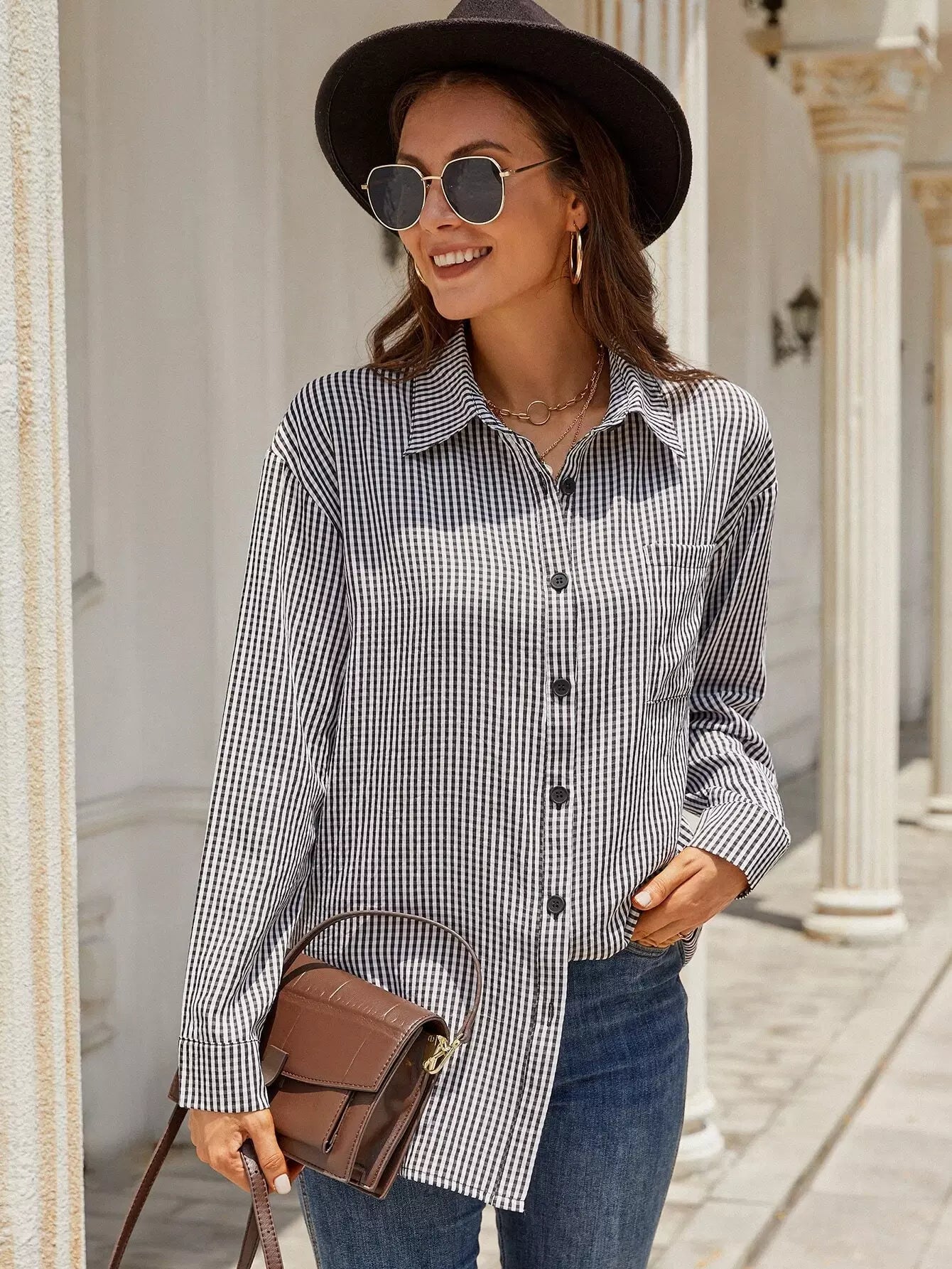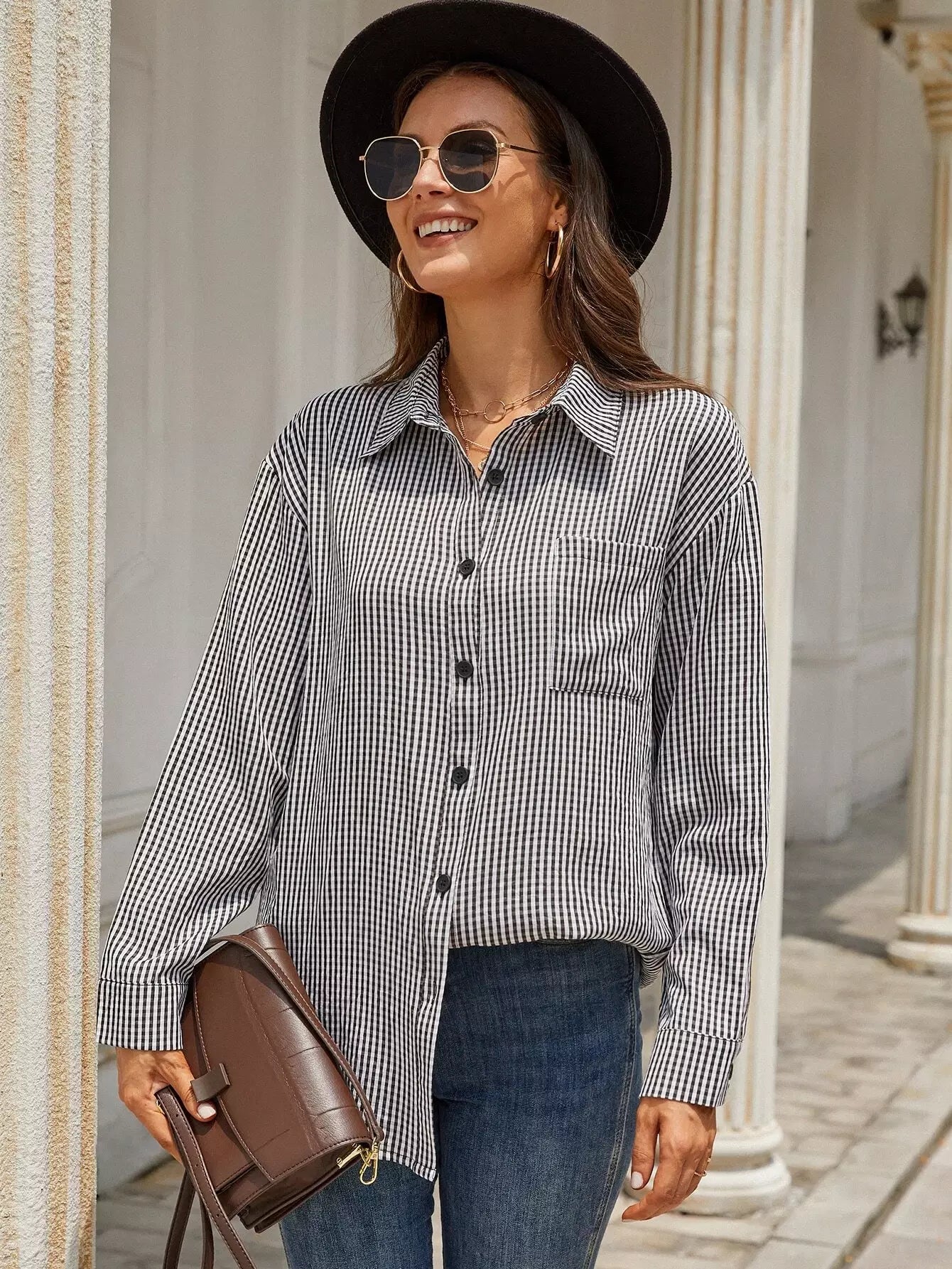 Women - Gingham Patched Pocket Blouse