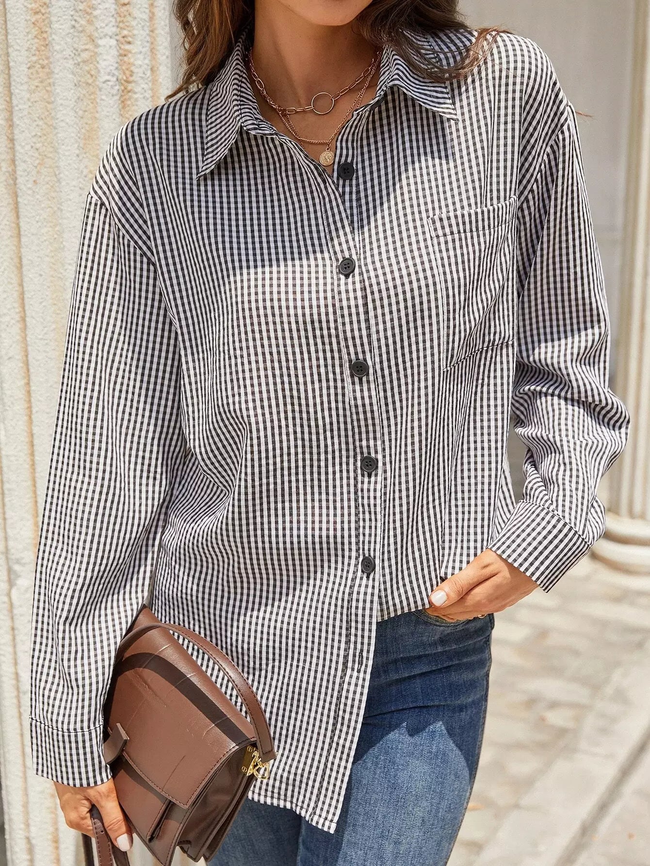 Gingham Patched Pocket Blouse