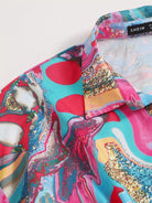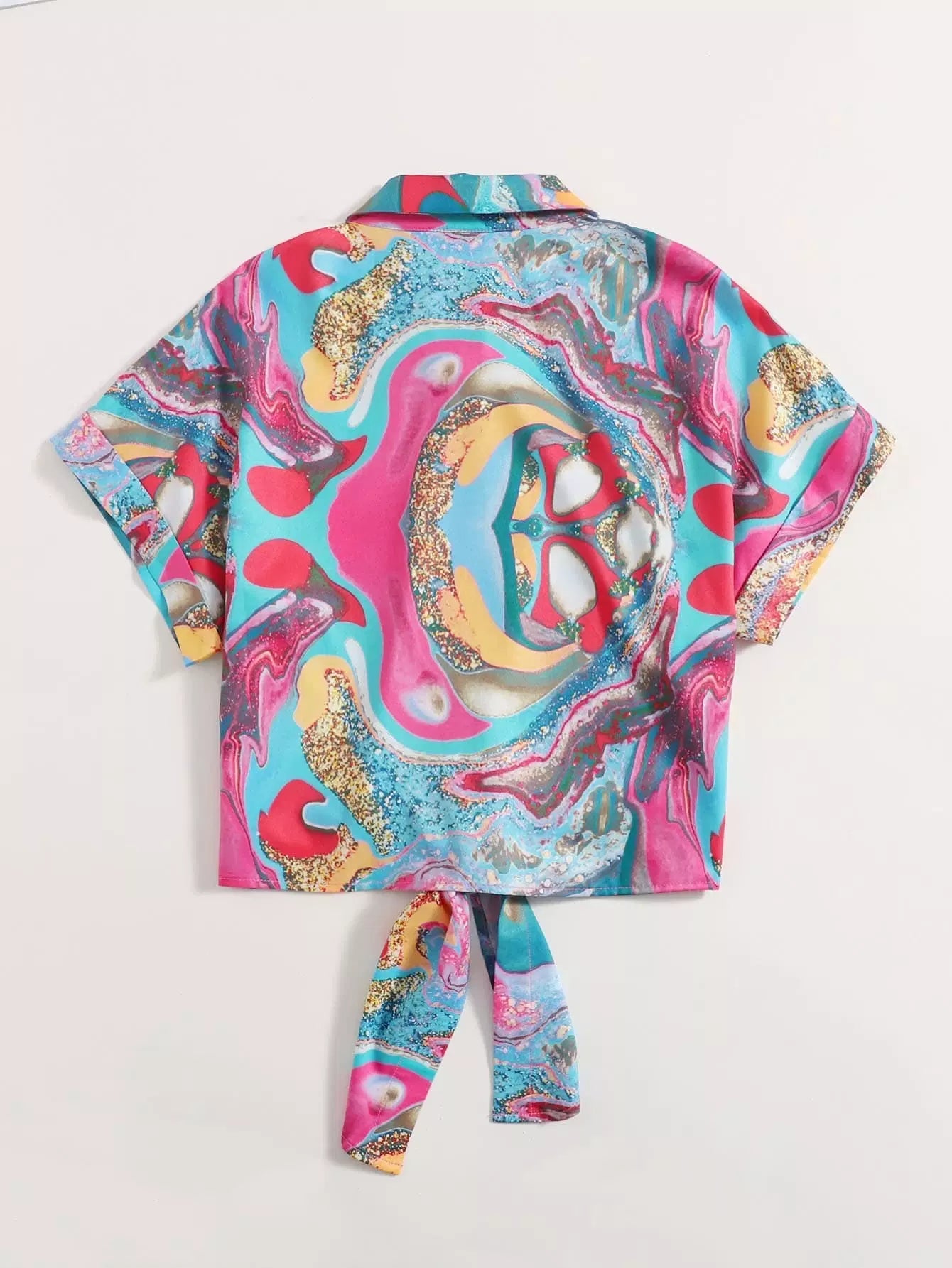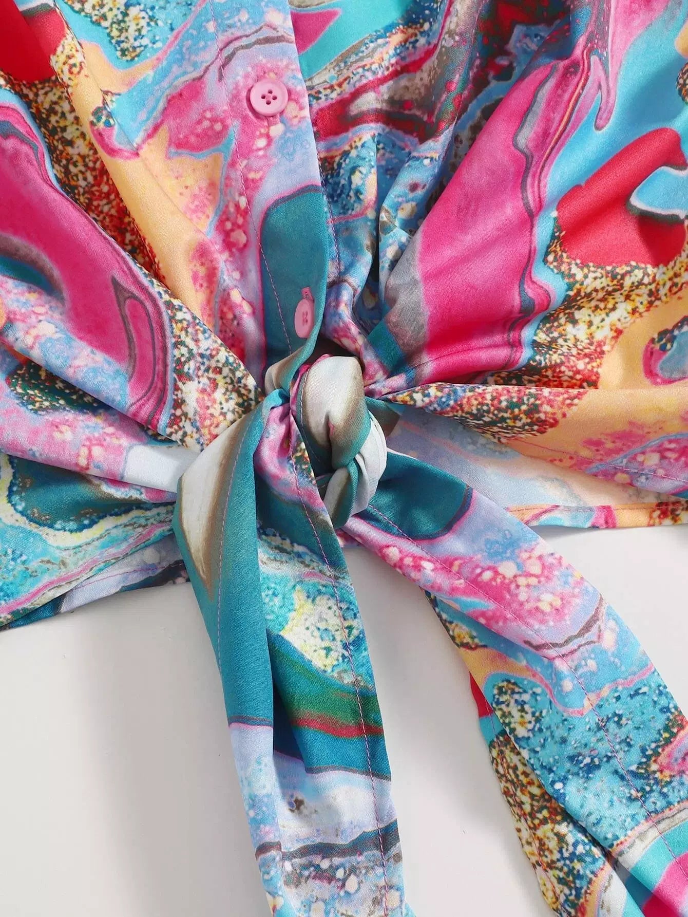 Graphic Print Cuffed Sleeve Knot Hem Blouse