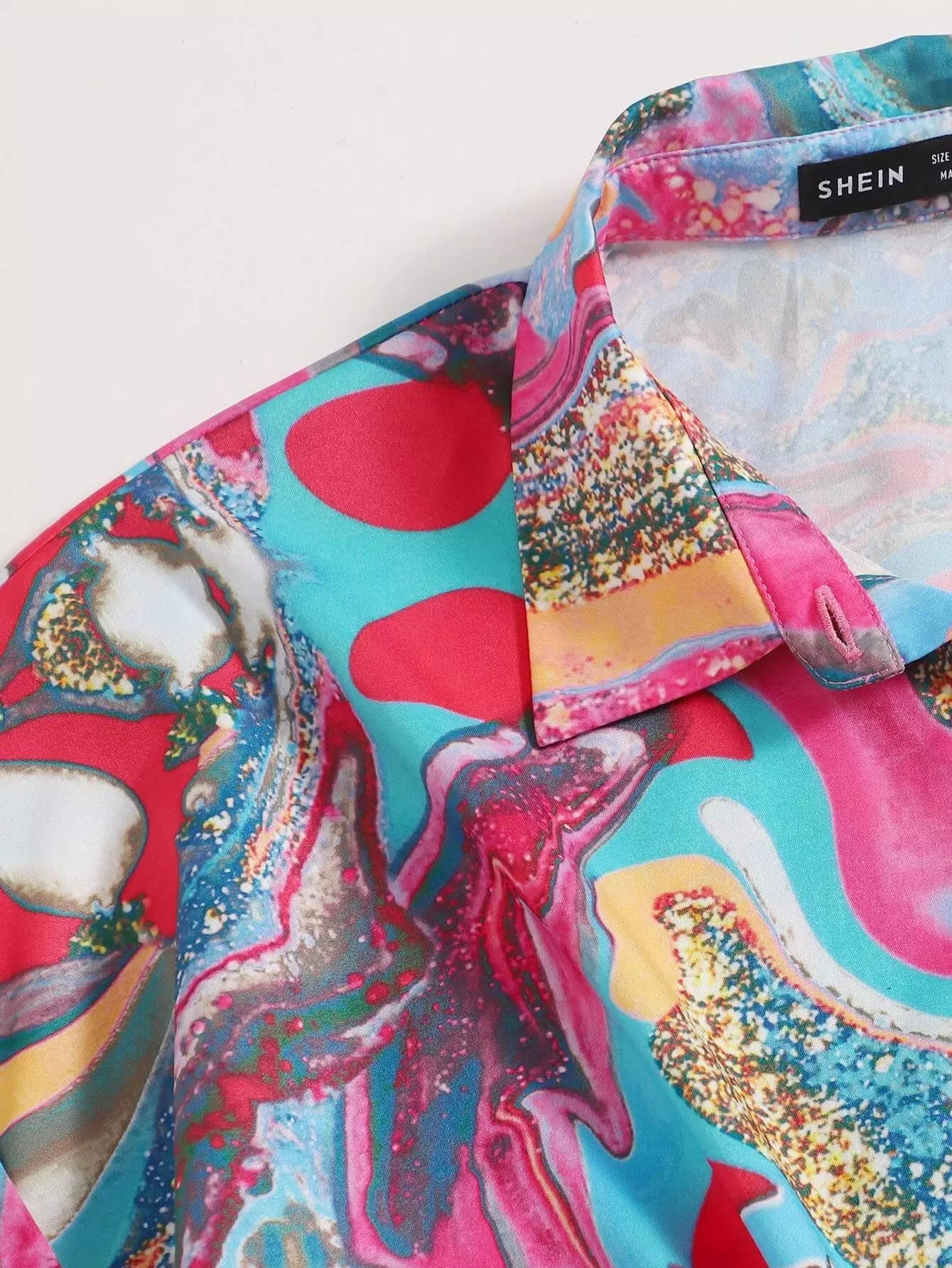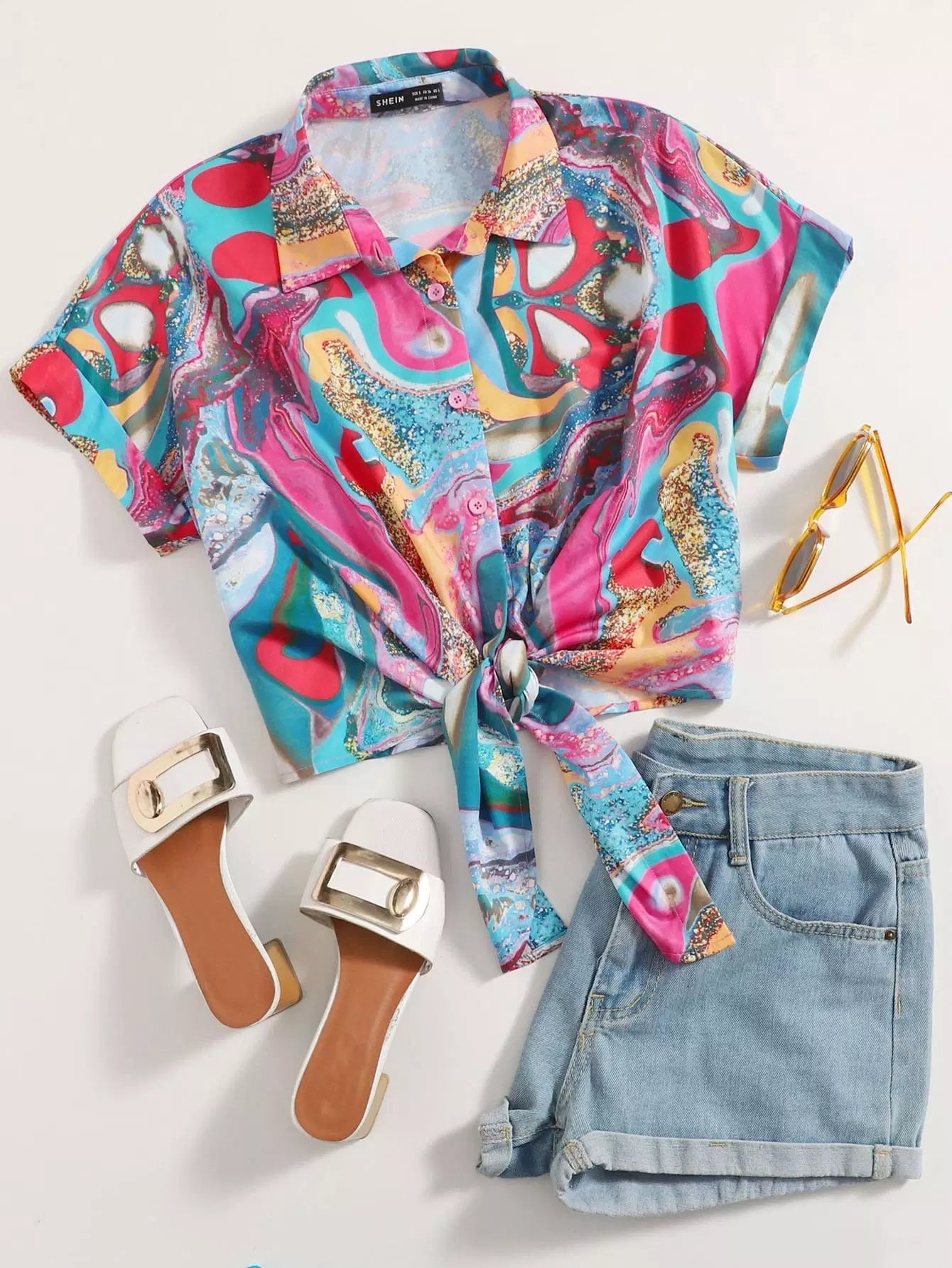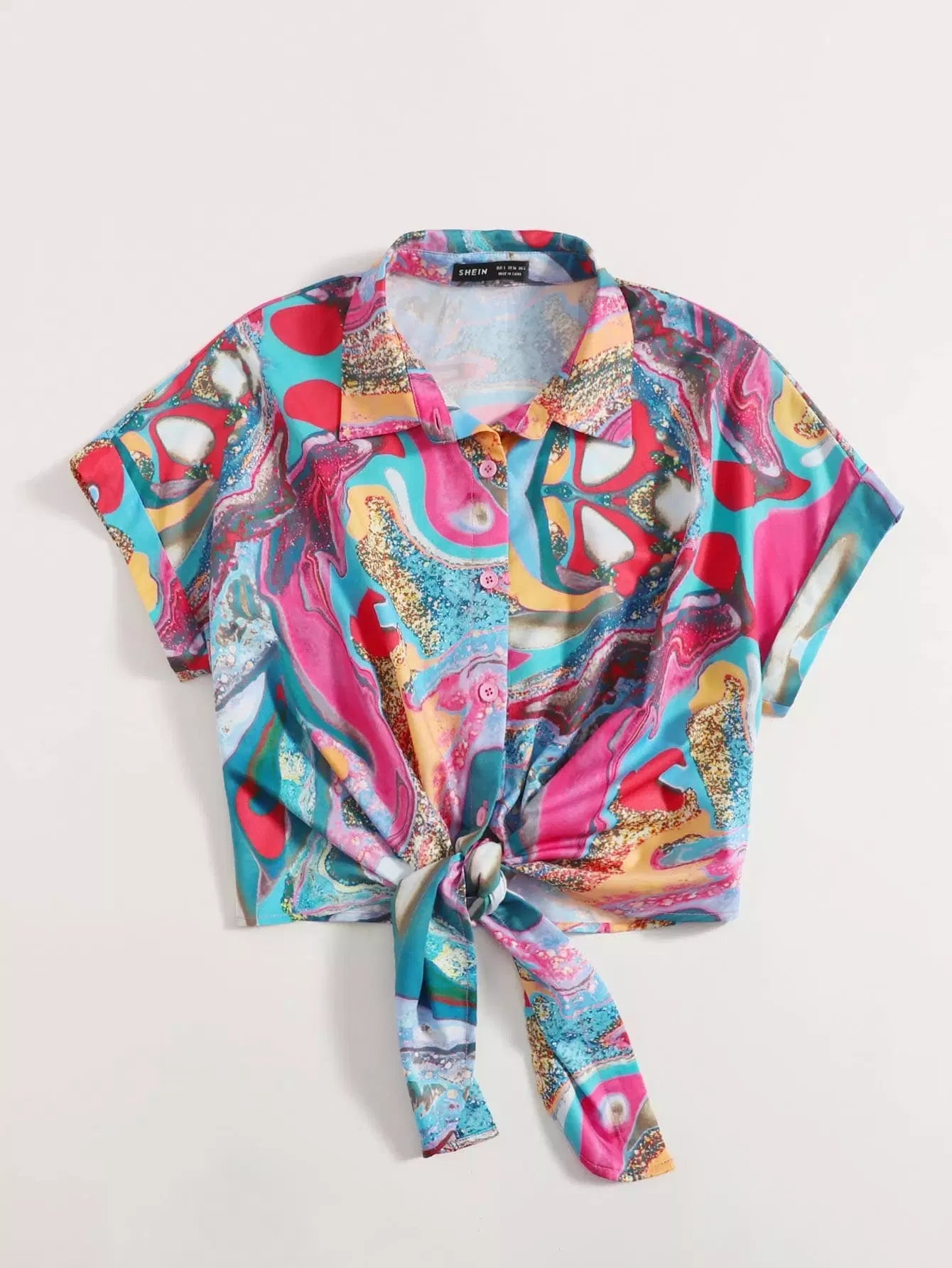 - Graphic Print Cuffed Sleeve Knot Hem Blouse