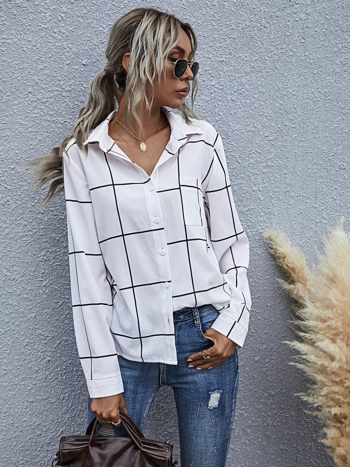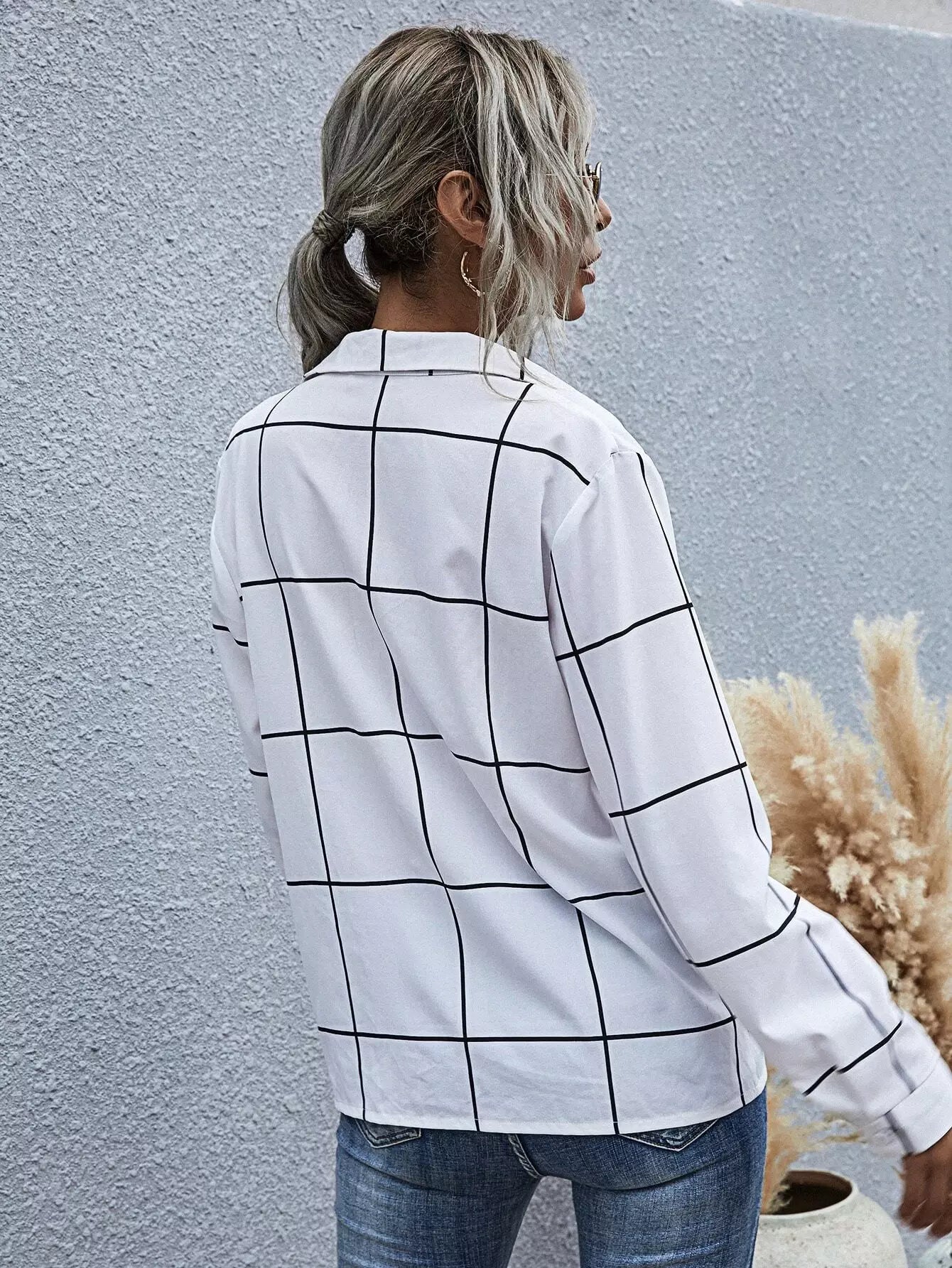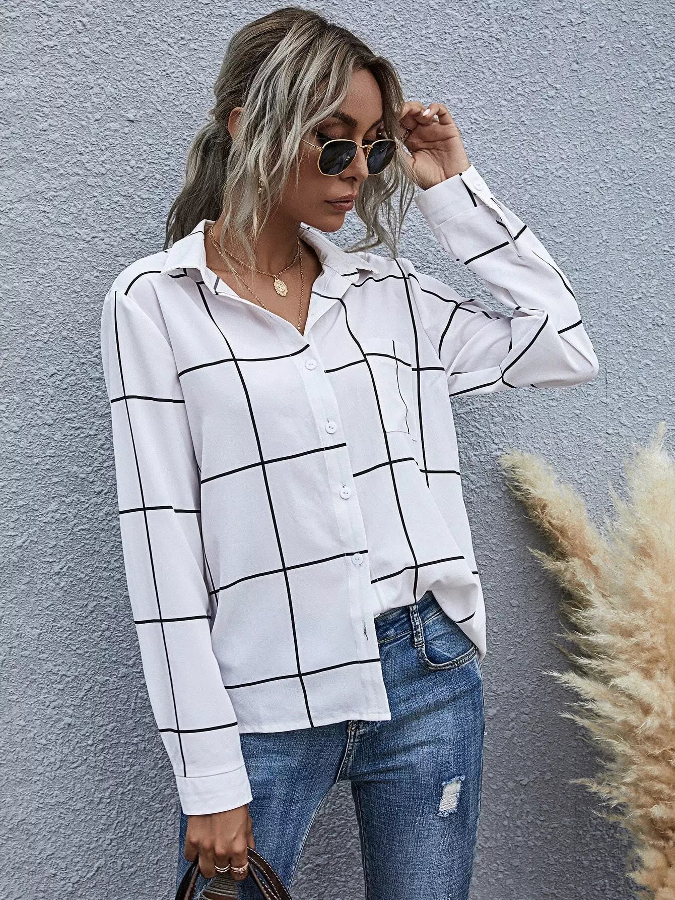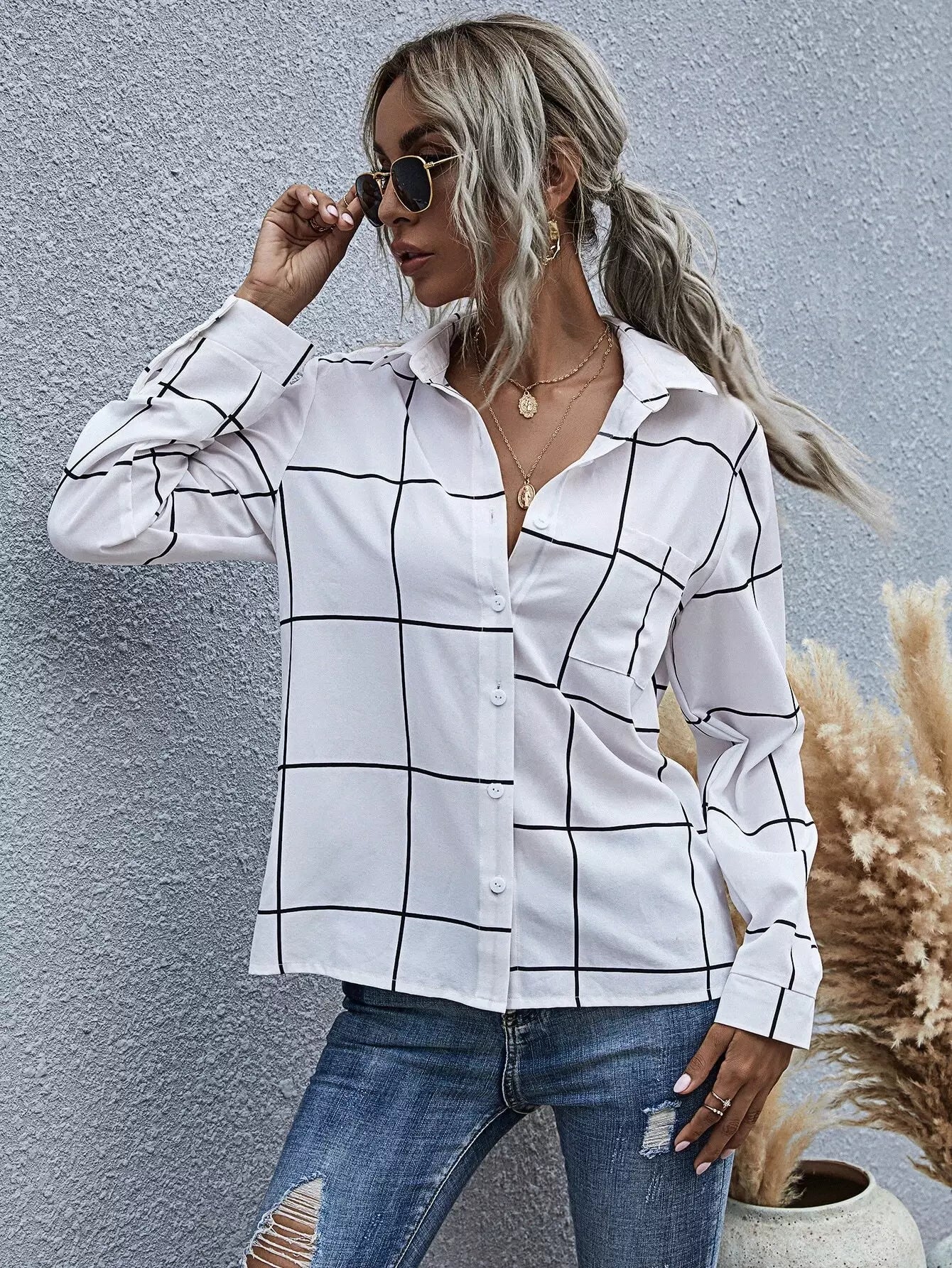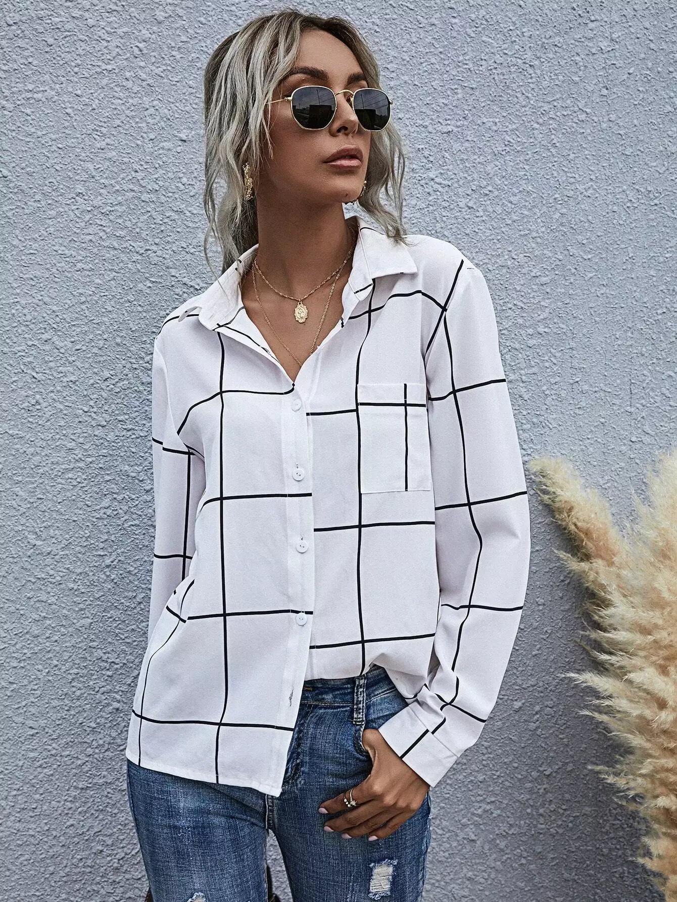 Grid Print Button Up Shirt