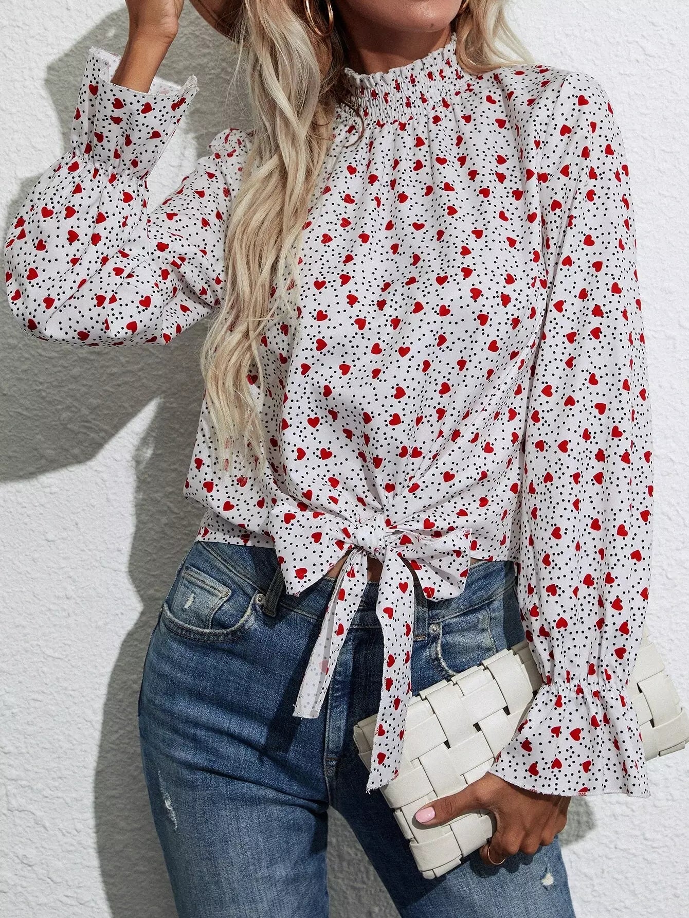 Heart & Polka Dot Print Knot Hem Blouse