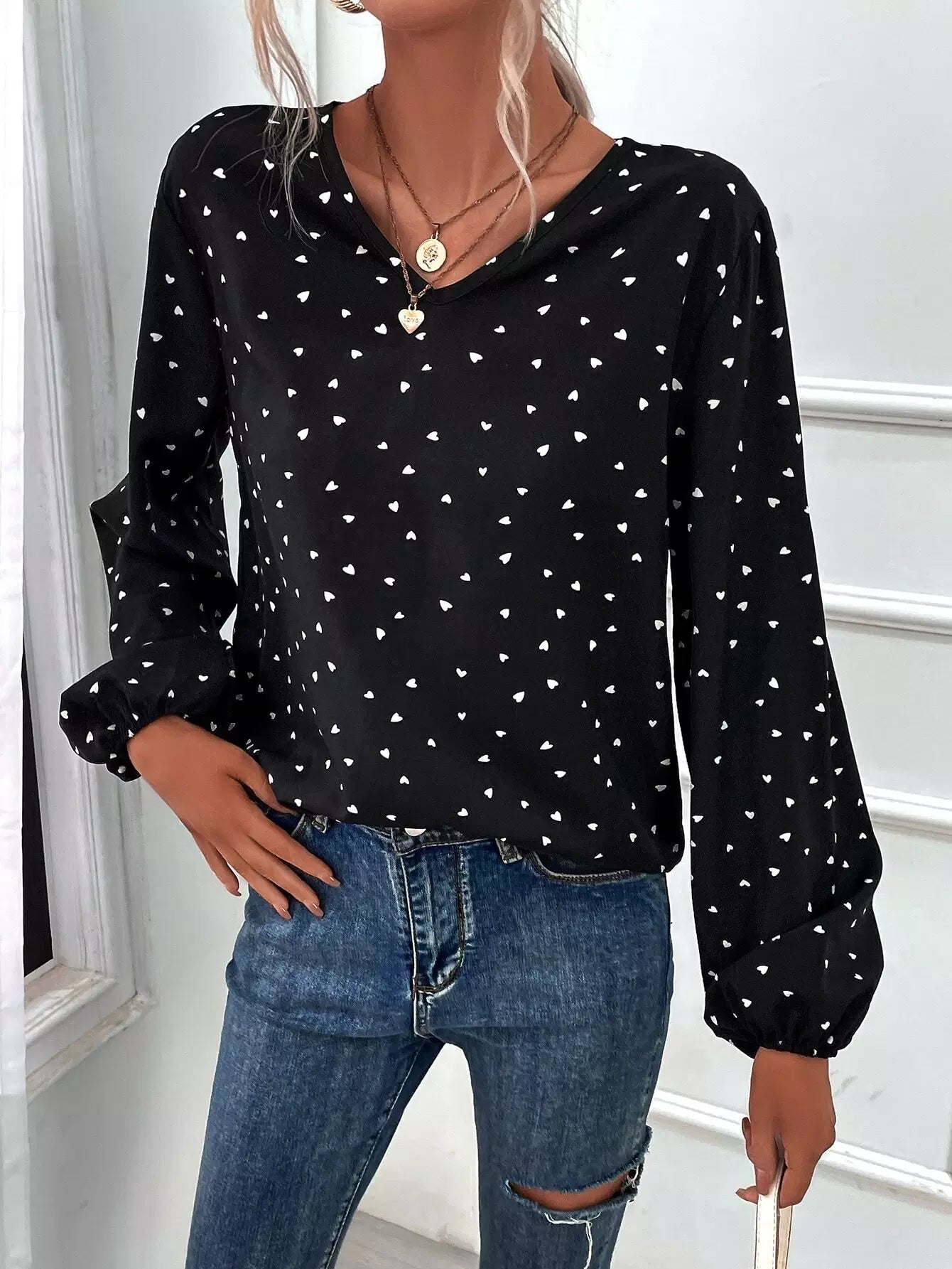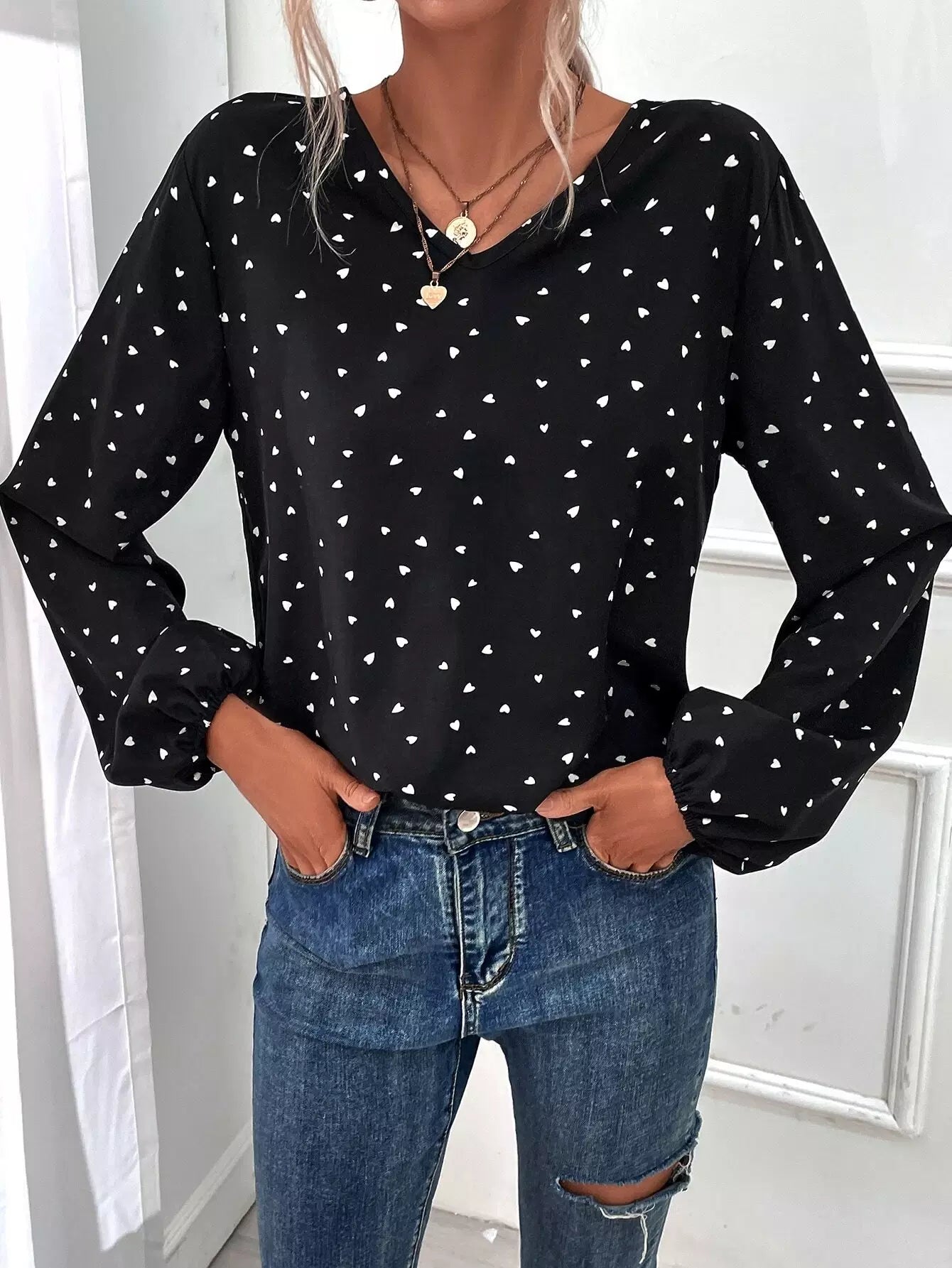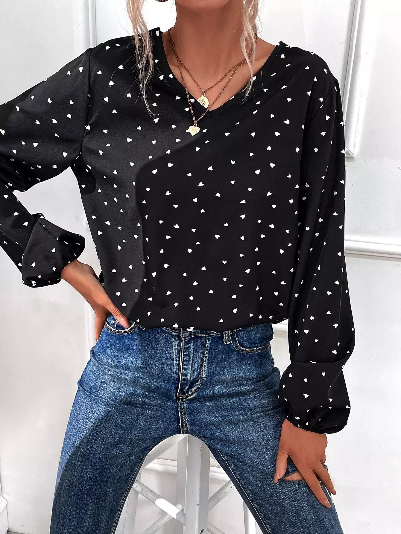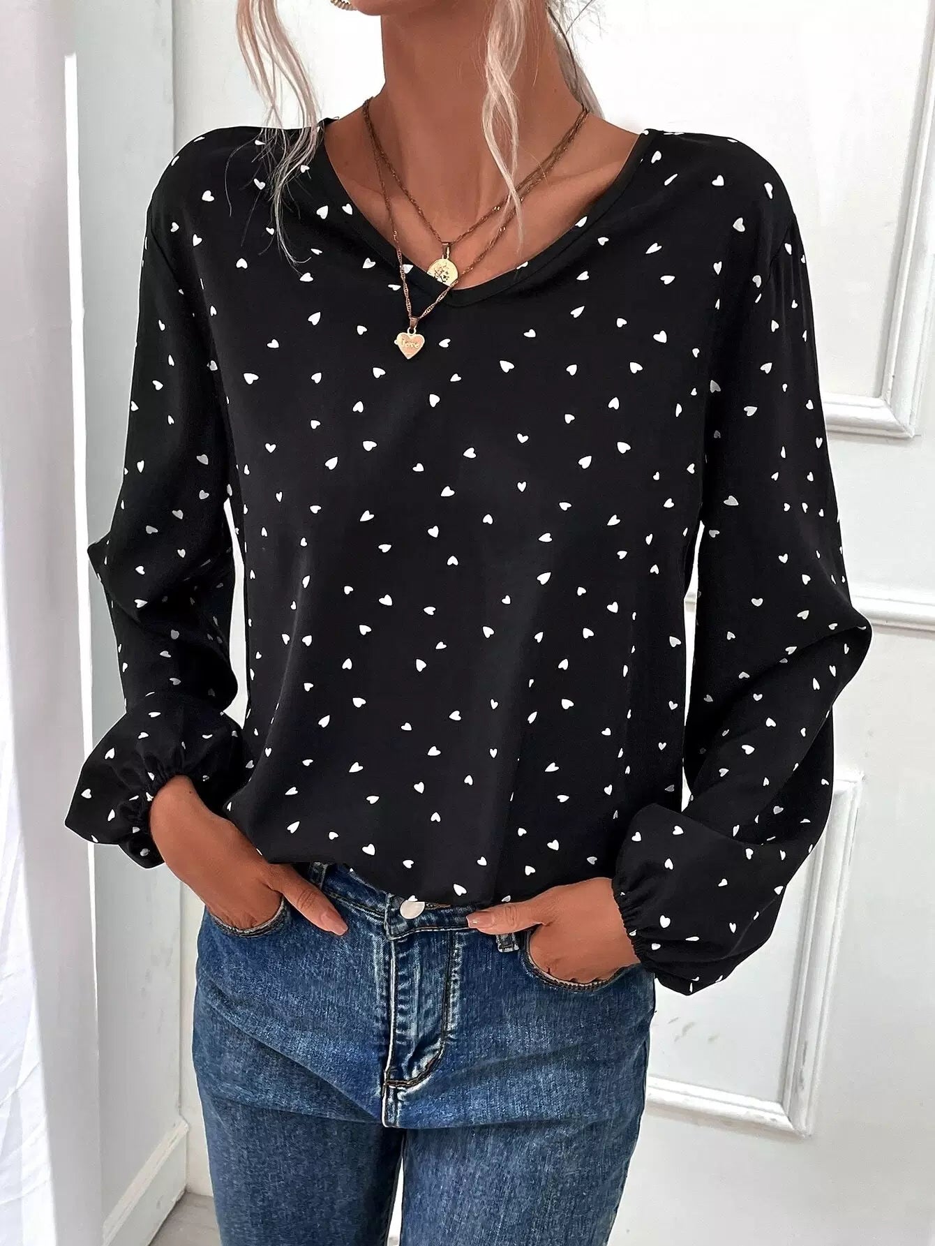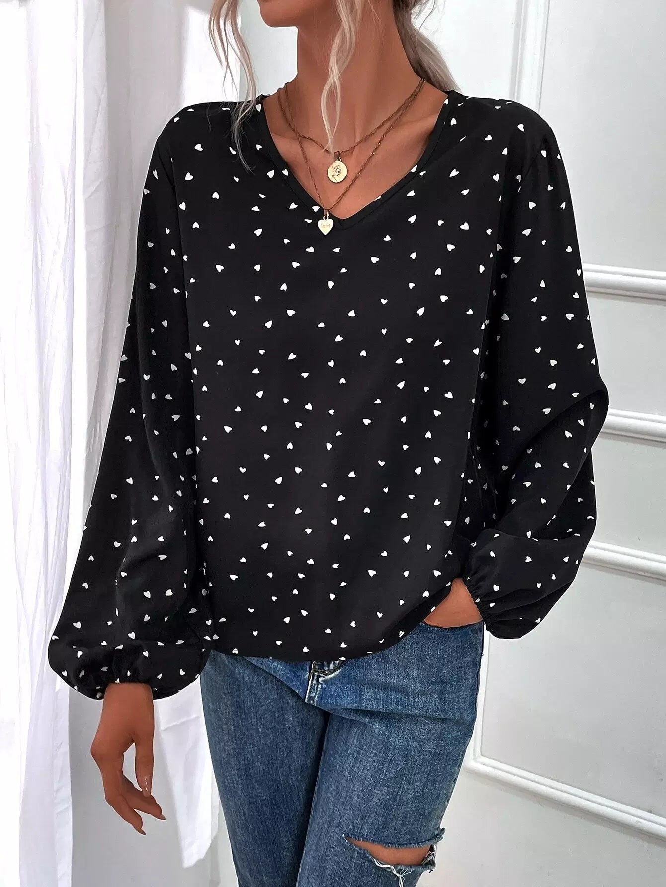 Heart Print Bishop Sleeve Blouse