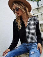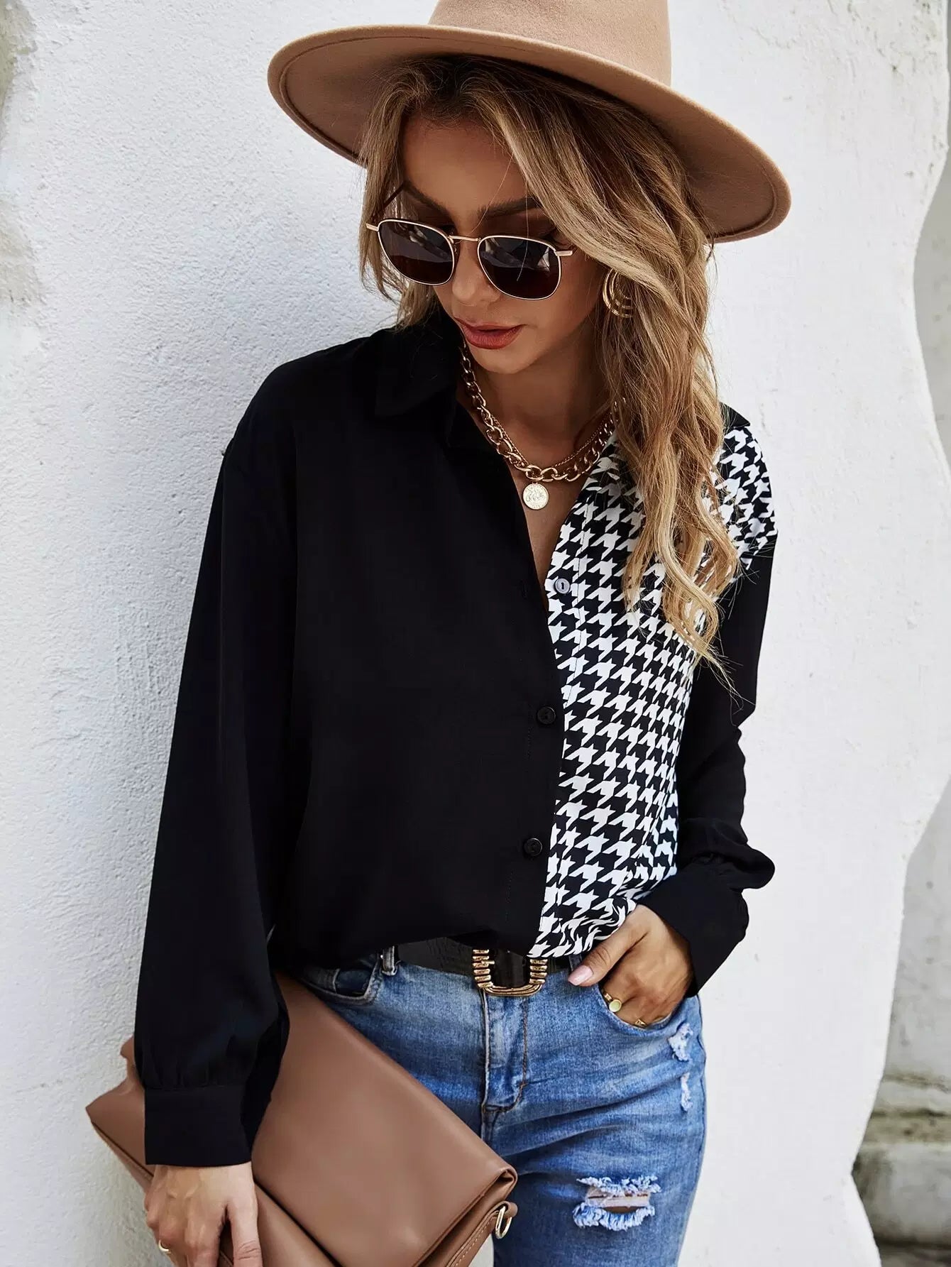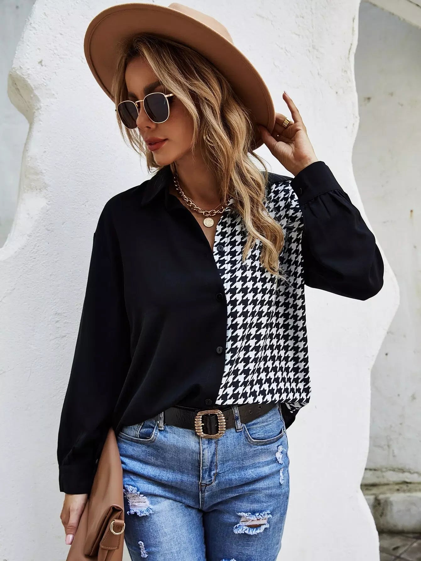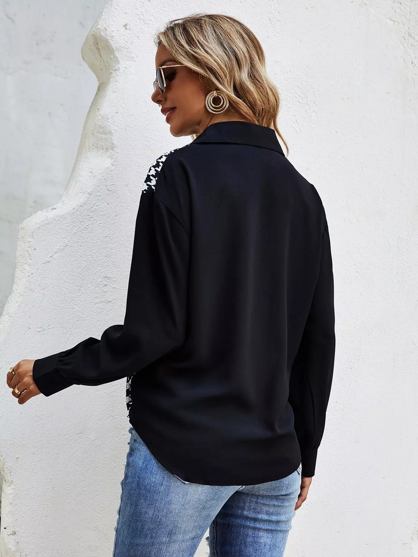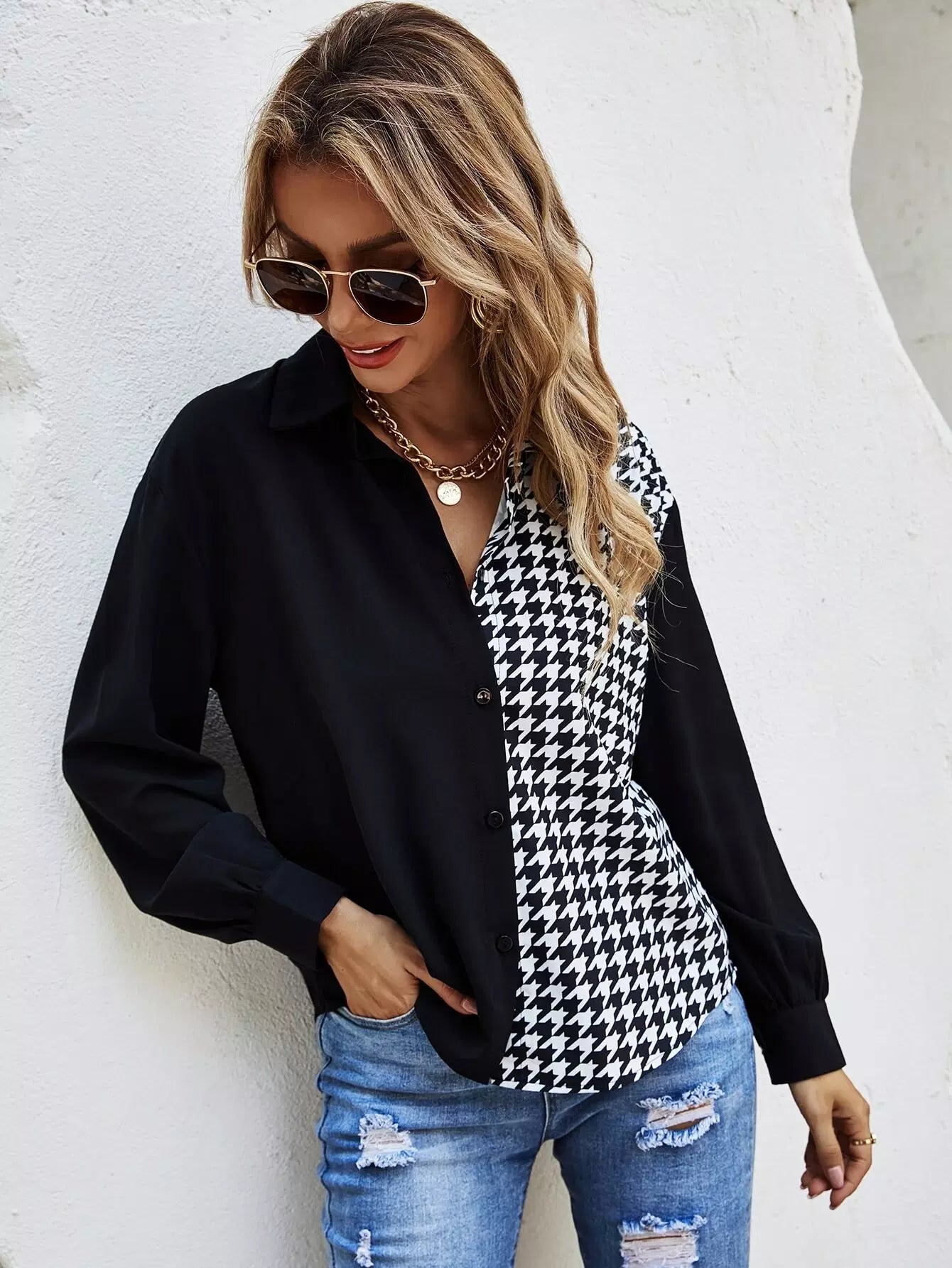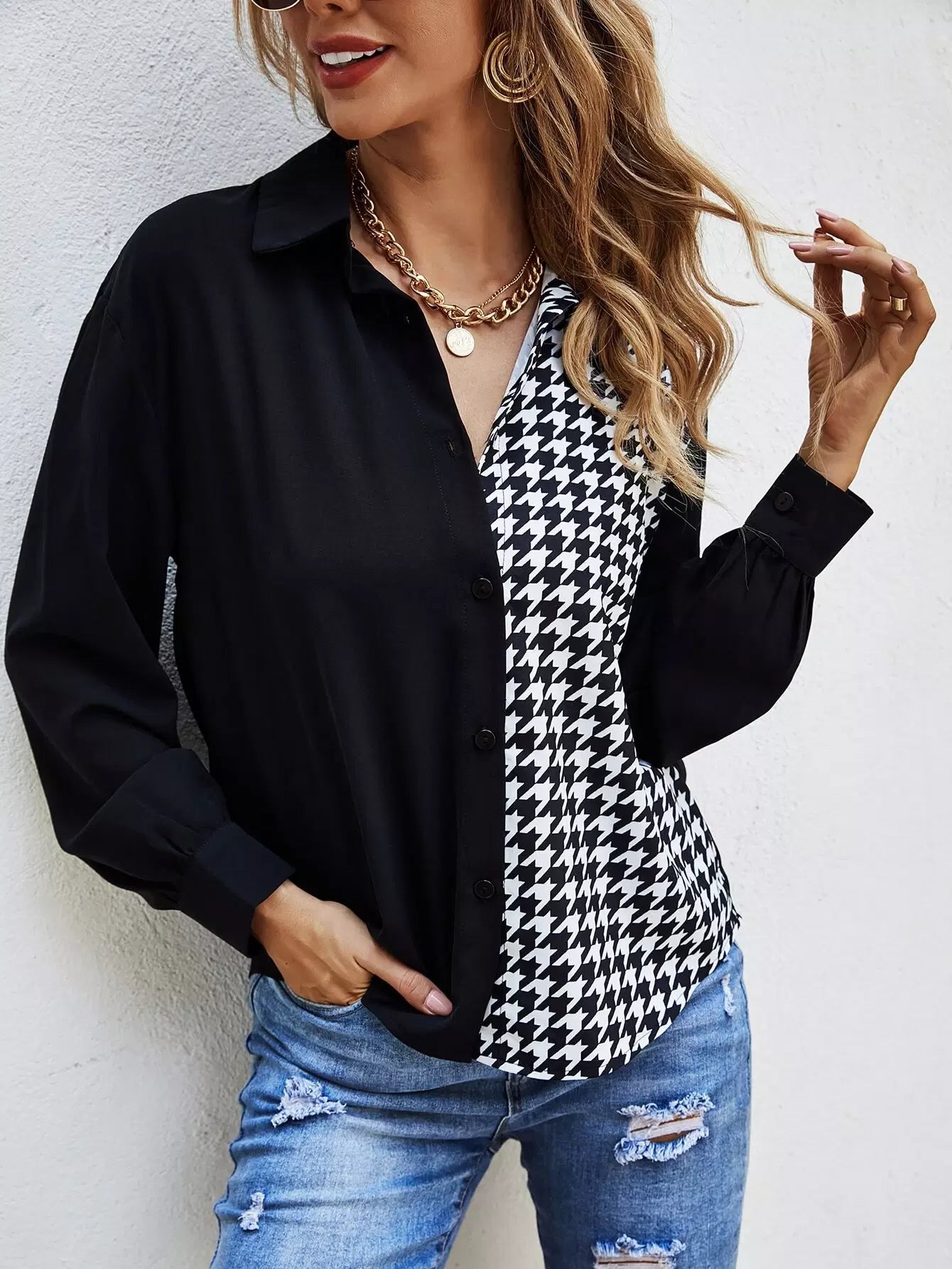 Houndstooth Panel Curved Hem Shirt