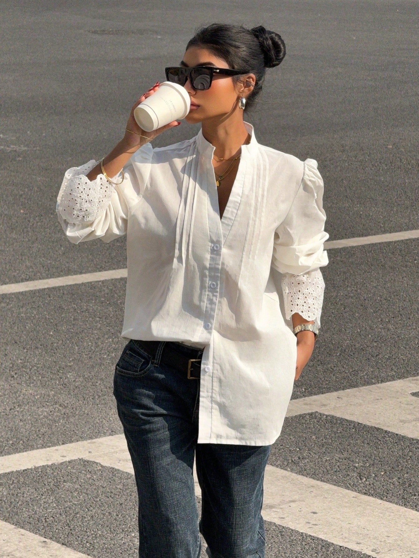 women INAWLY Solva Women's Plain Front Button Long Sleeve Lace Trim Casual Blouse