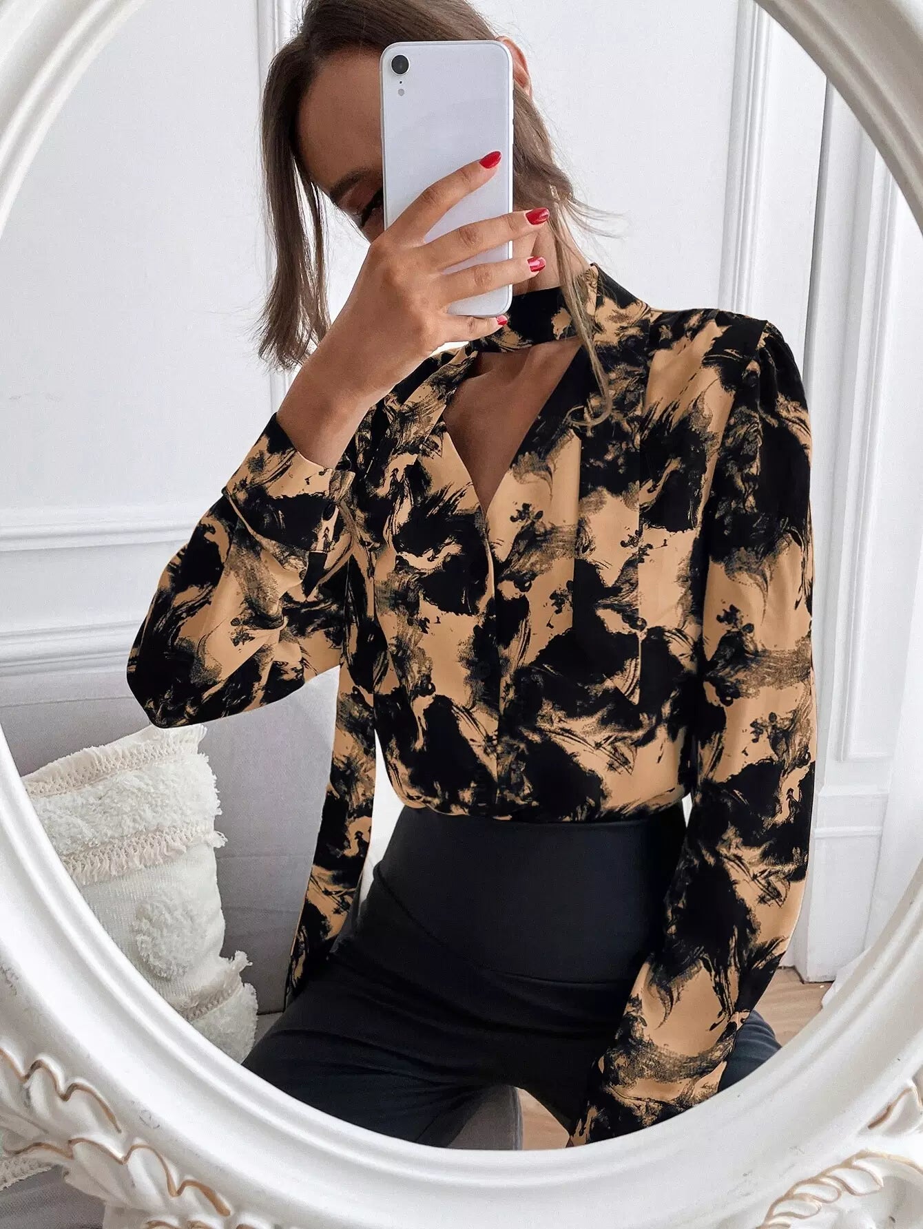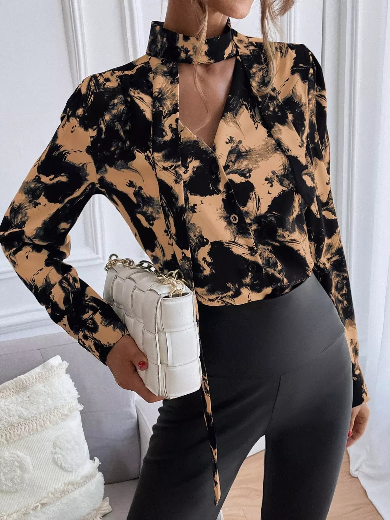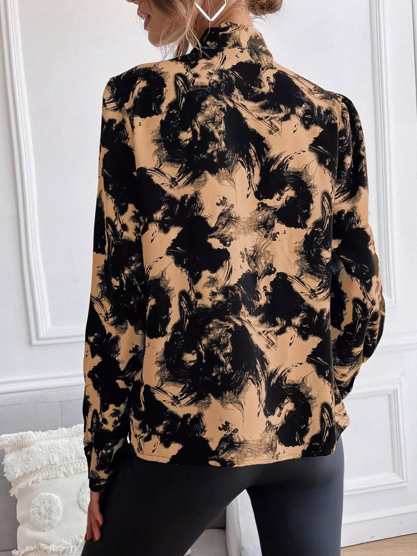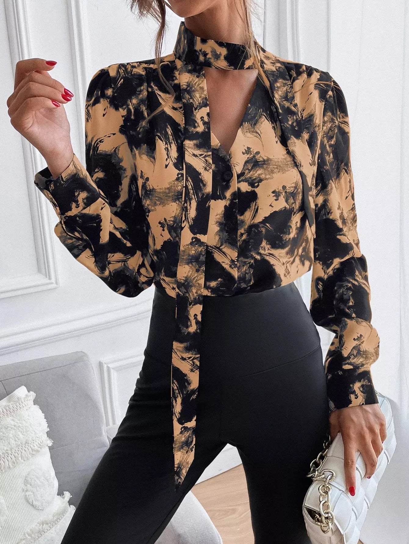 Ink Painting Tie Neck Button Up Blouse