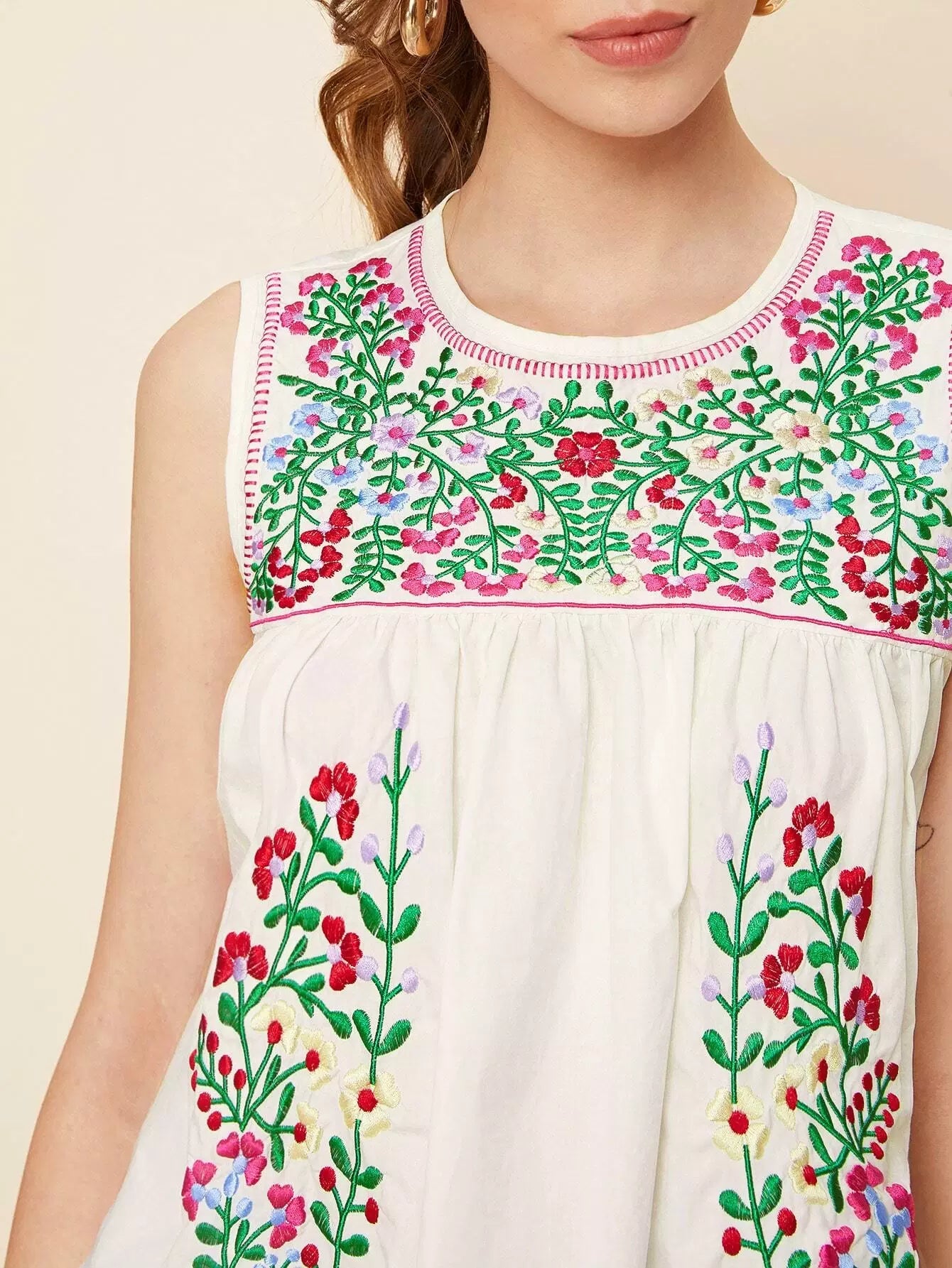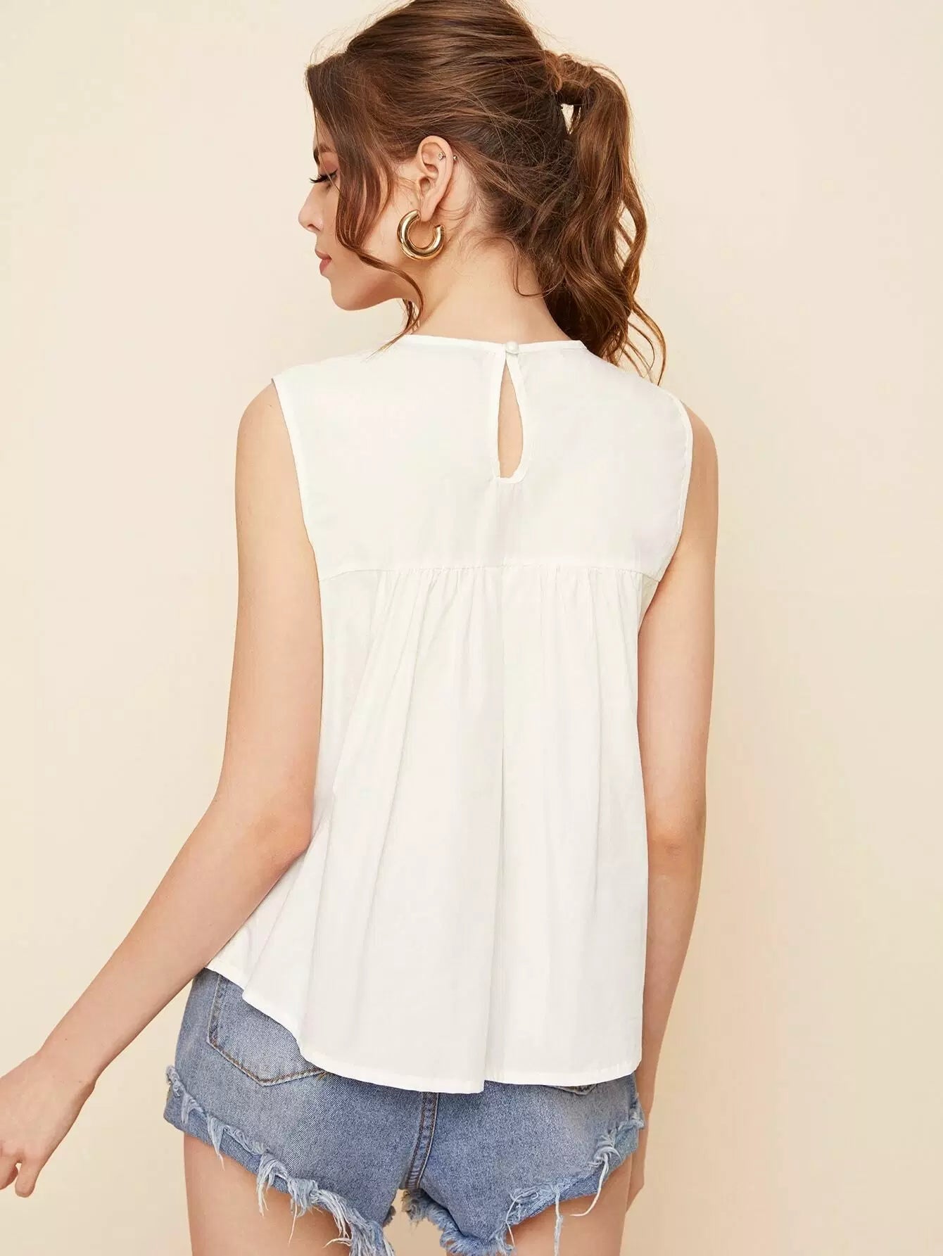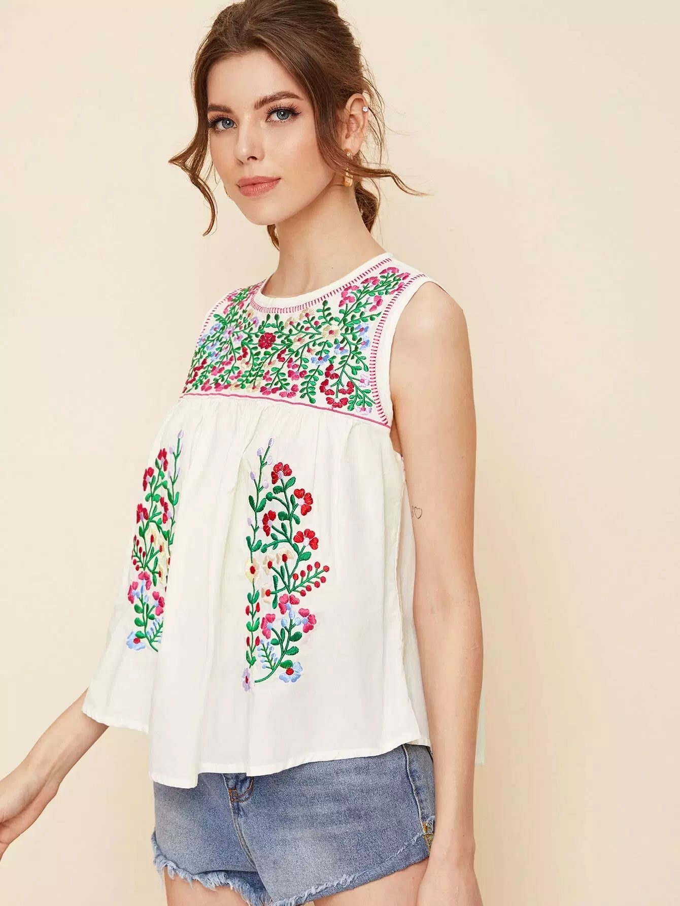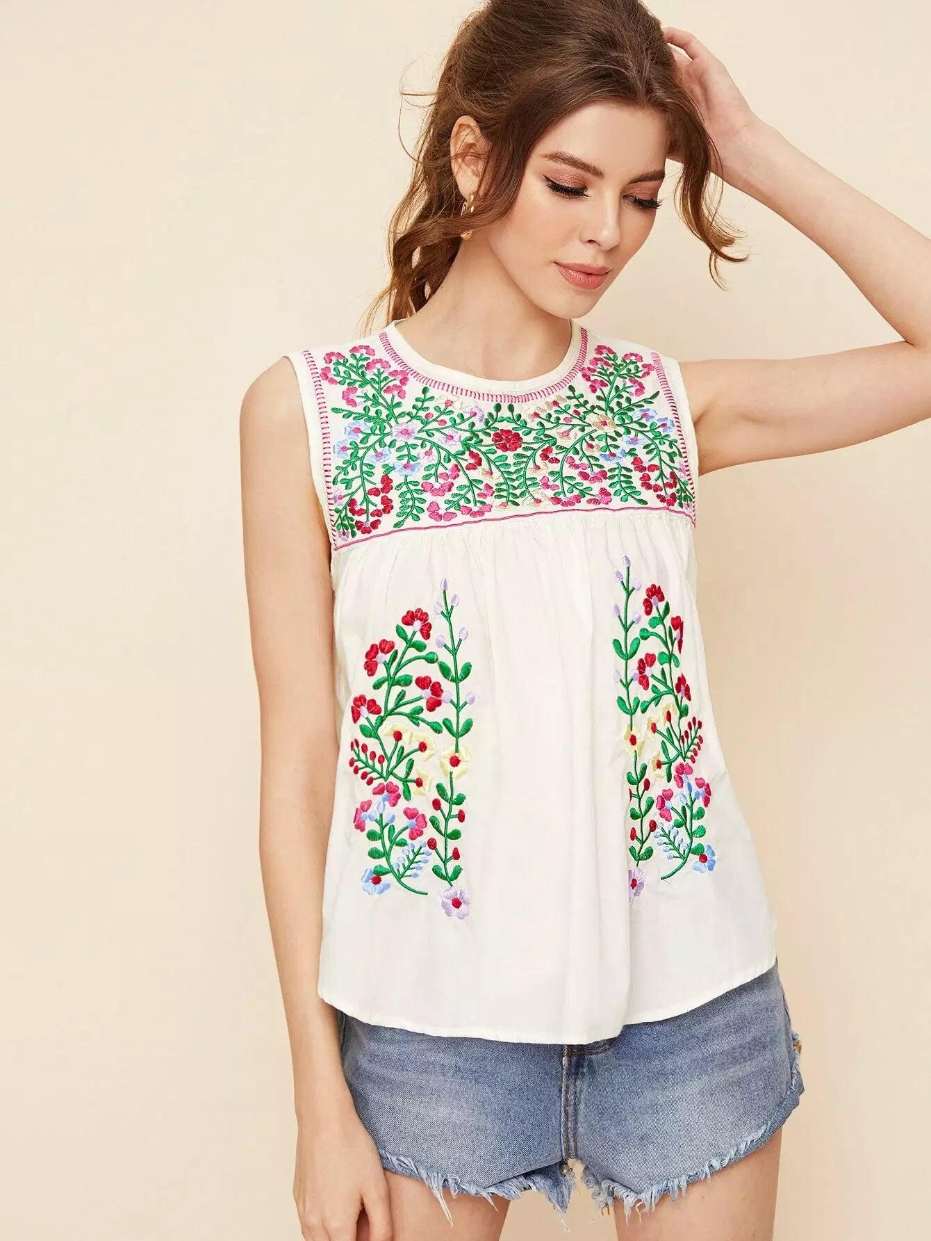 Keyhole Back Floral Embroidered Blouse
