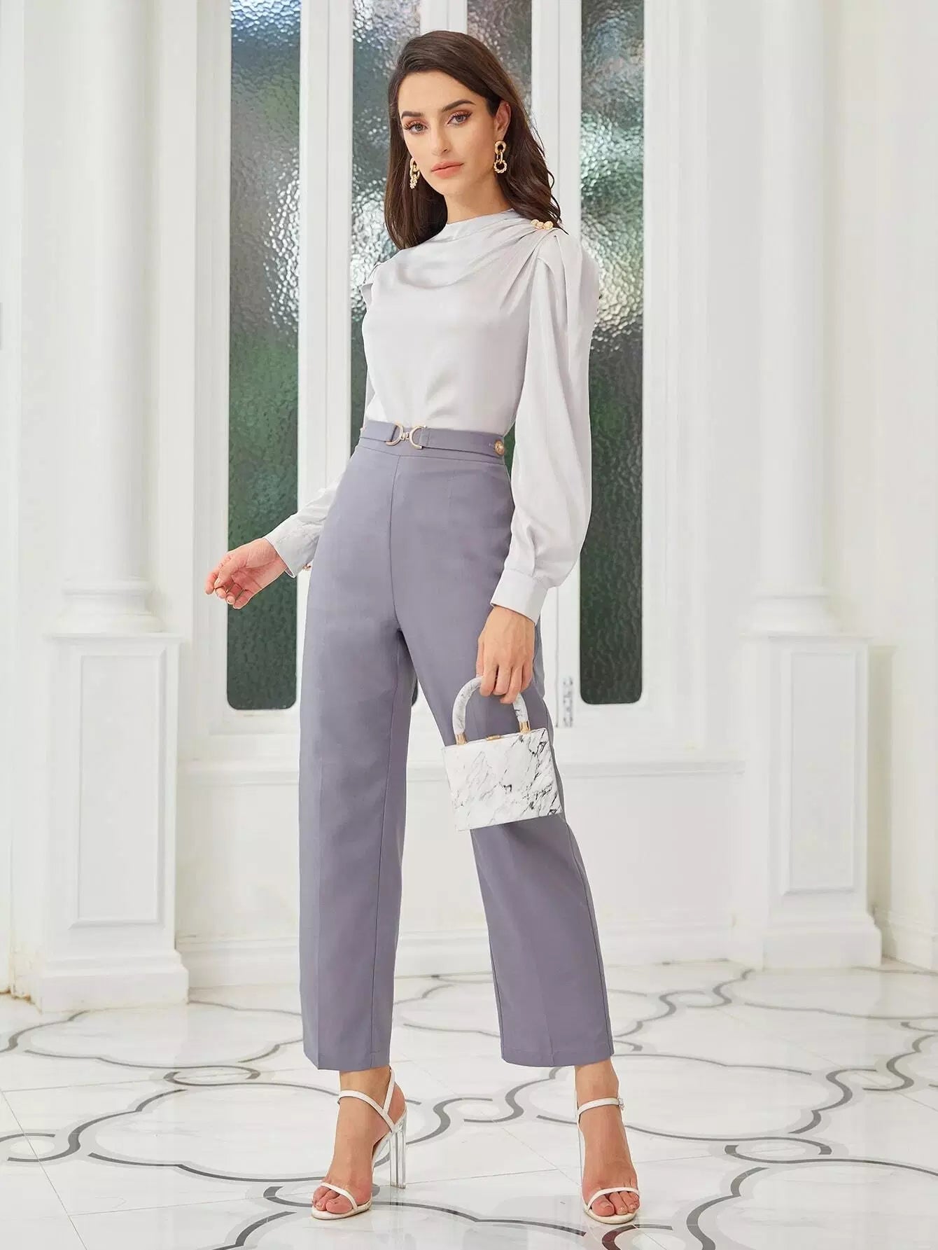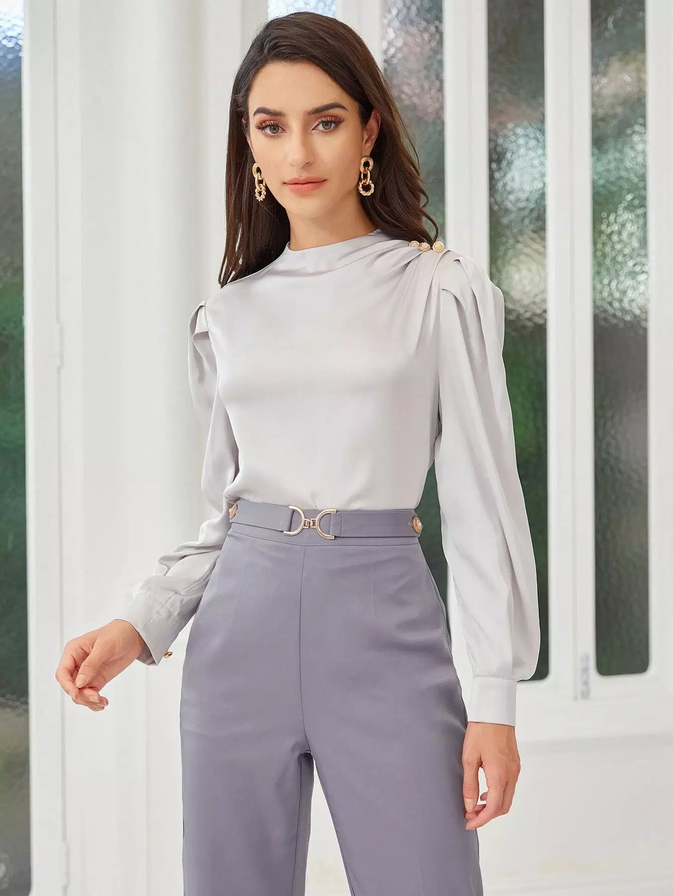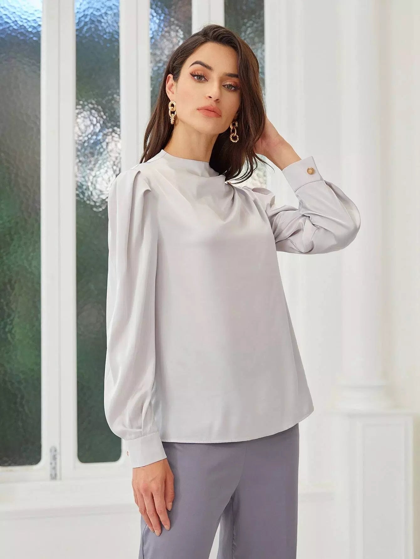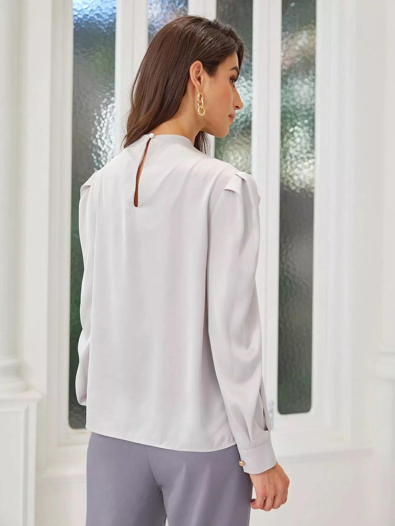 Keyhole Back Ruched Shoulder Lantern Sleeve Top
