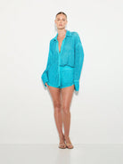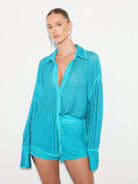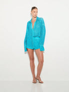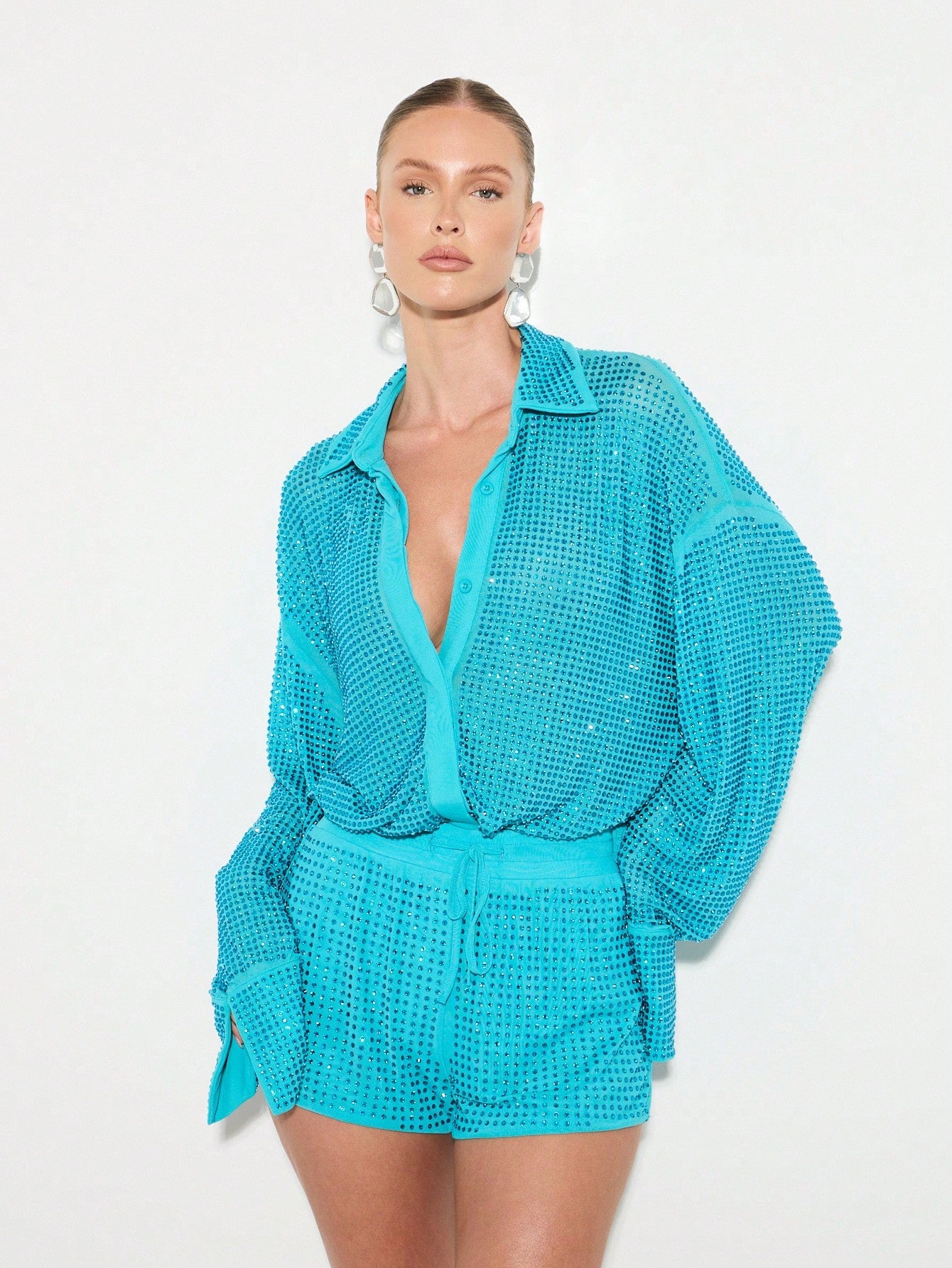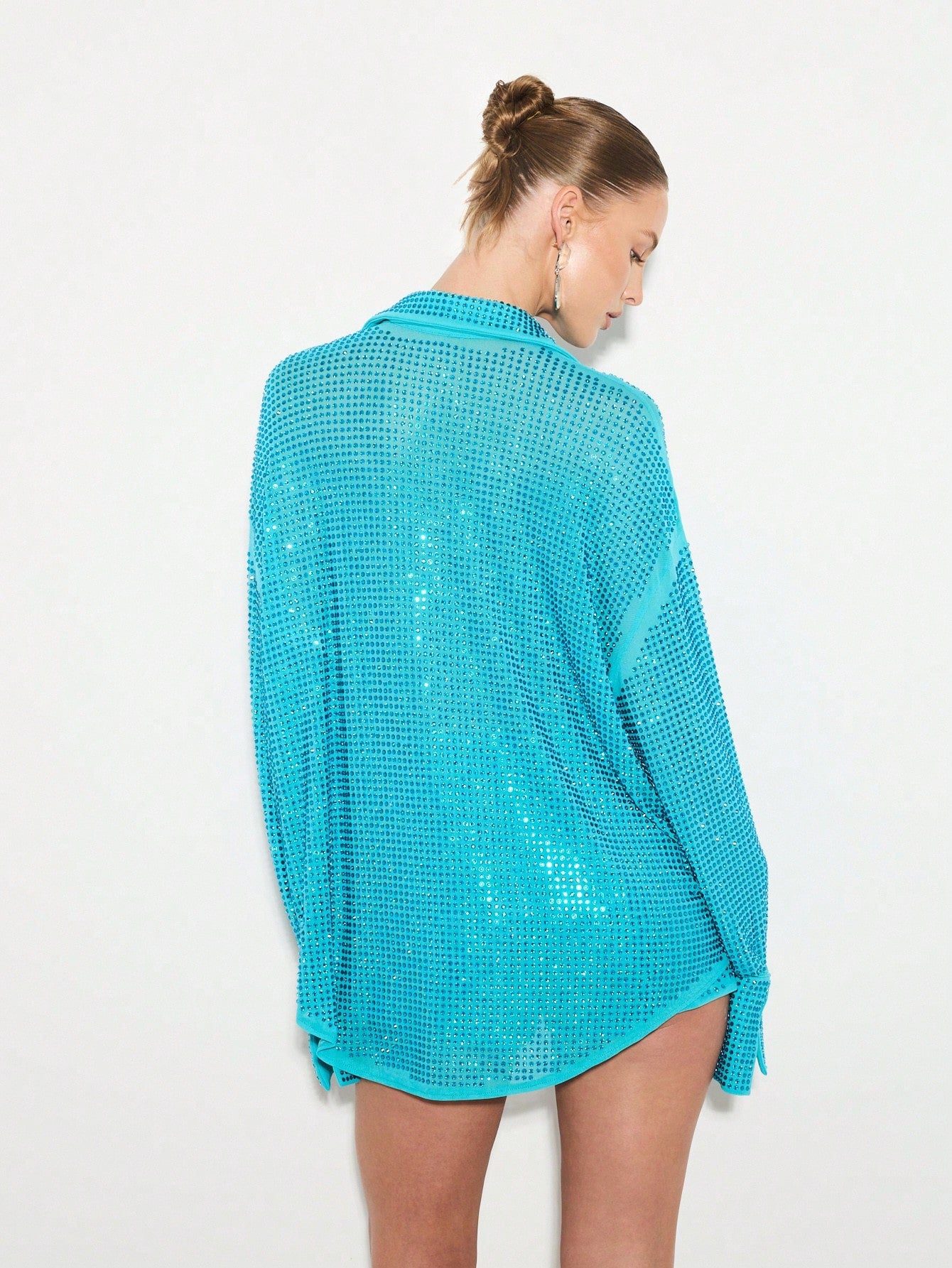 KIZN KIZN - F Sequined Hotfix Crystal Button Down Shirt Sparkly Glamour Club Party Night Out Occasion Long Sleeve Holiday Sheer Glitter Blouse