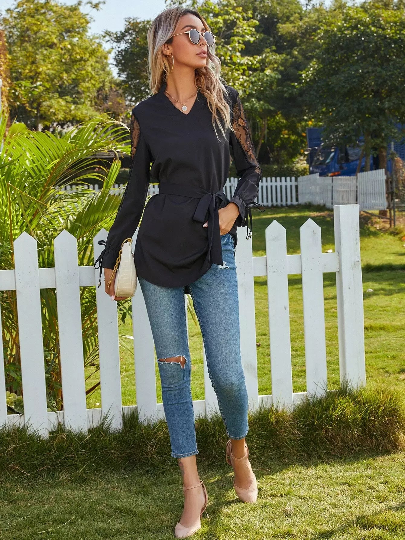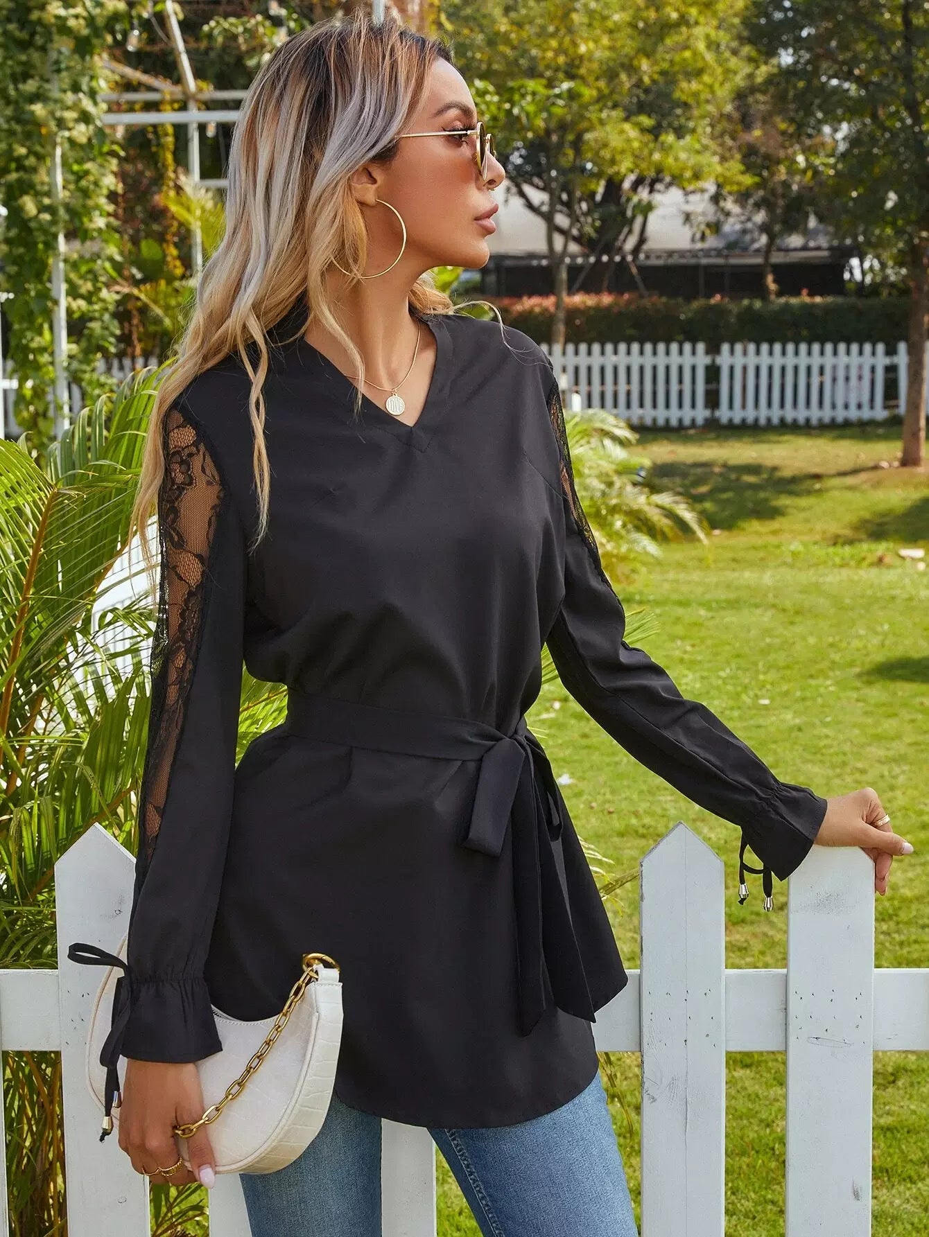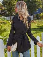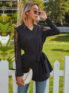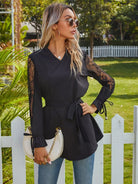Lace Panel Self Tie Flounce Sleeve Blouse