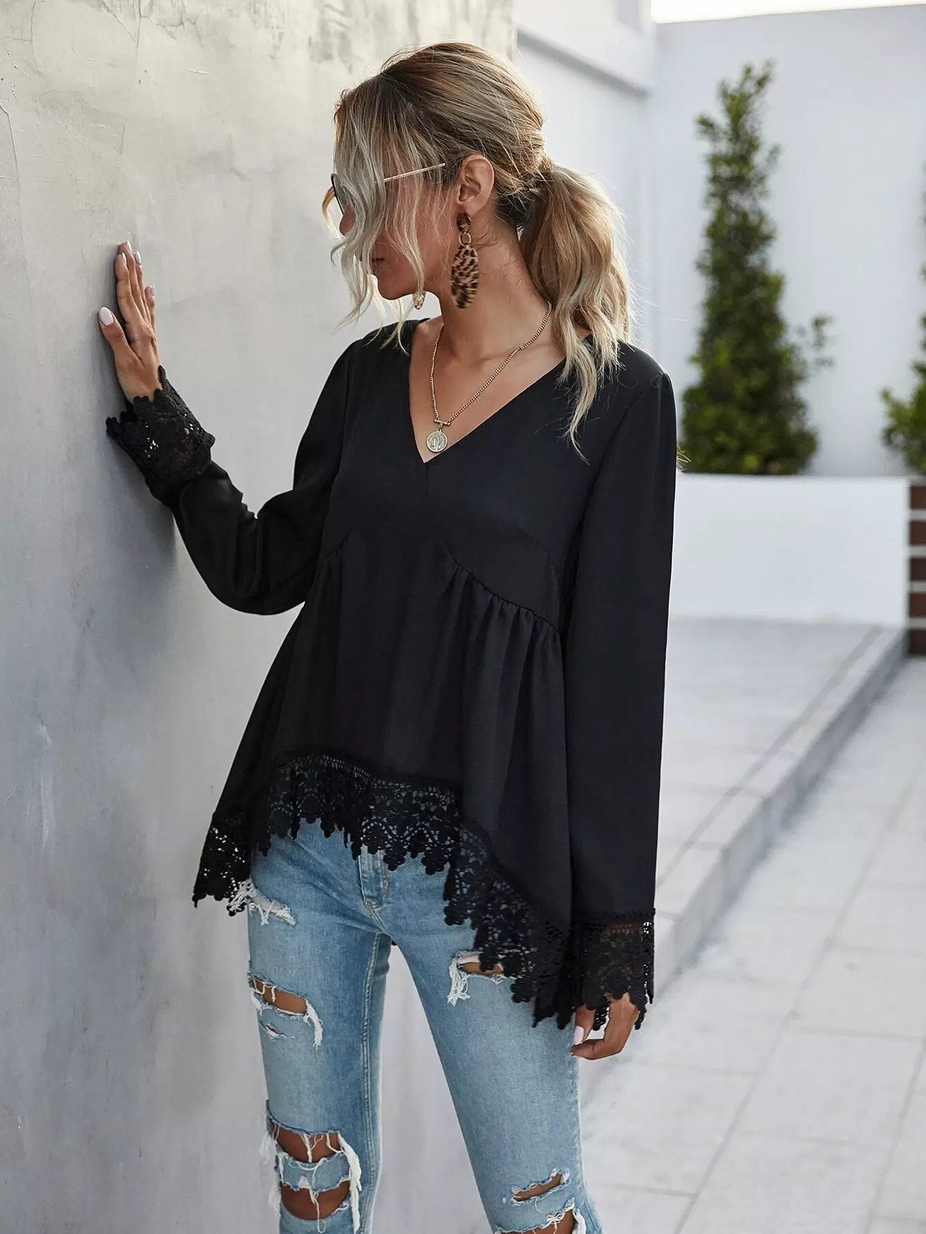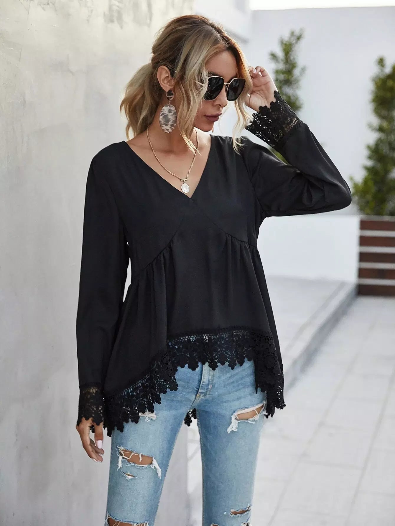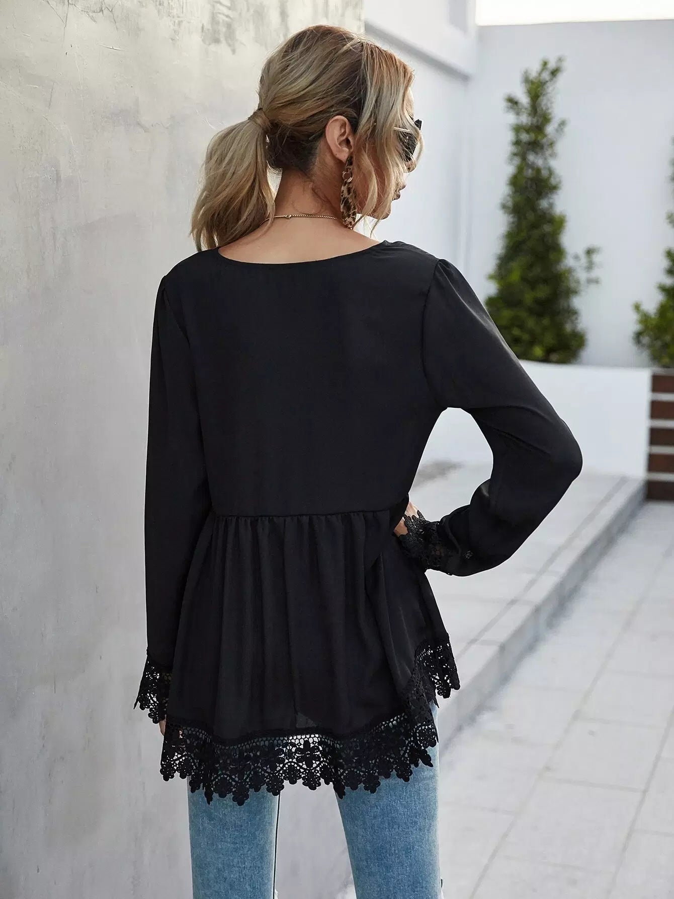 Lace Trim Long Sleeve High-Low Top