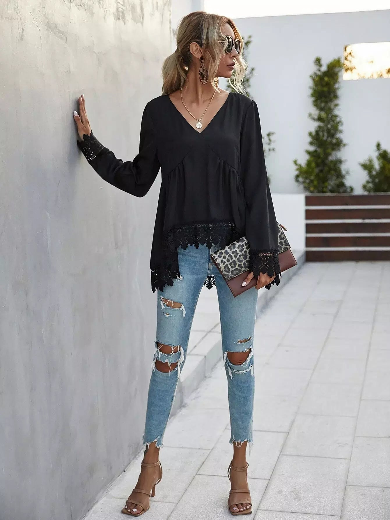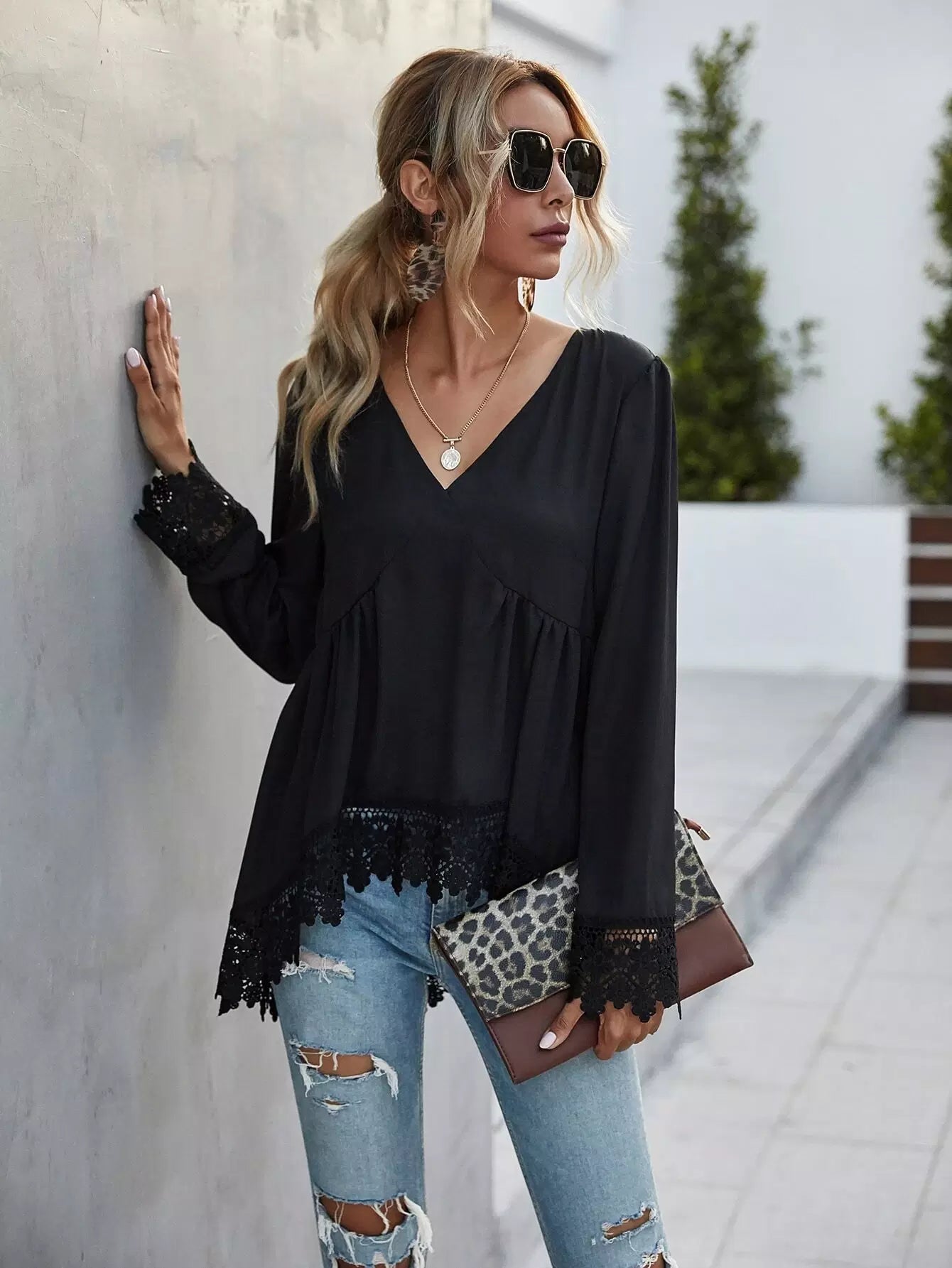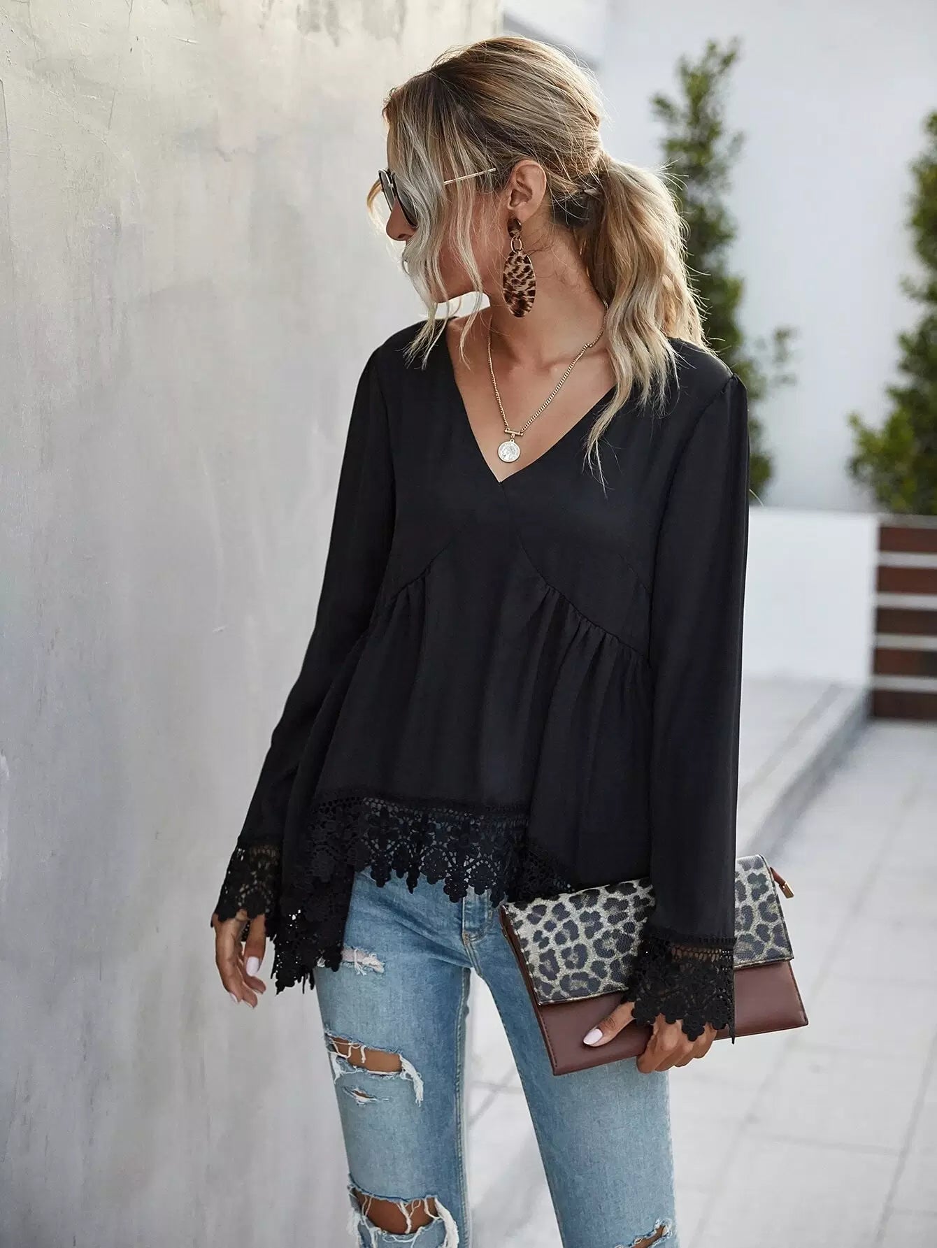 Lace Trim Long Sleeve High-Low Top