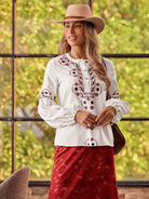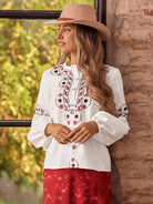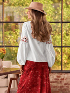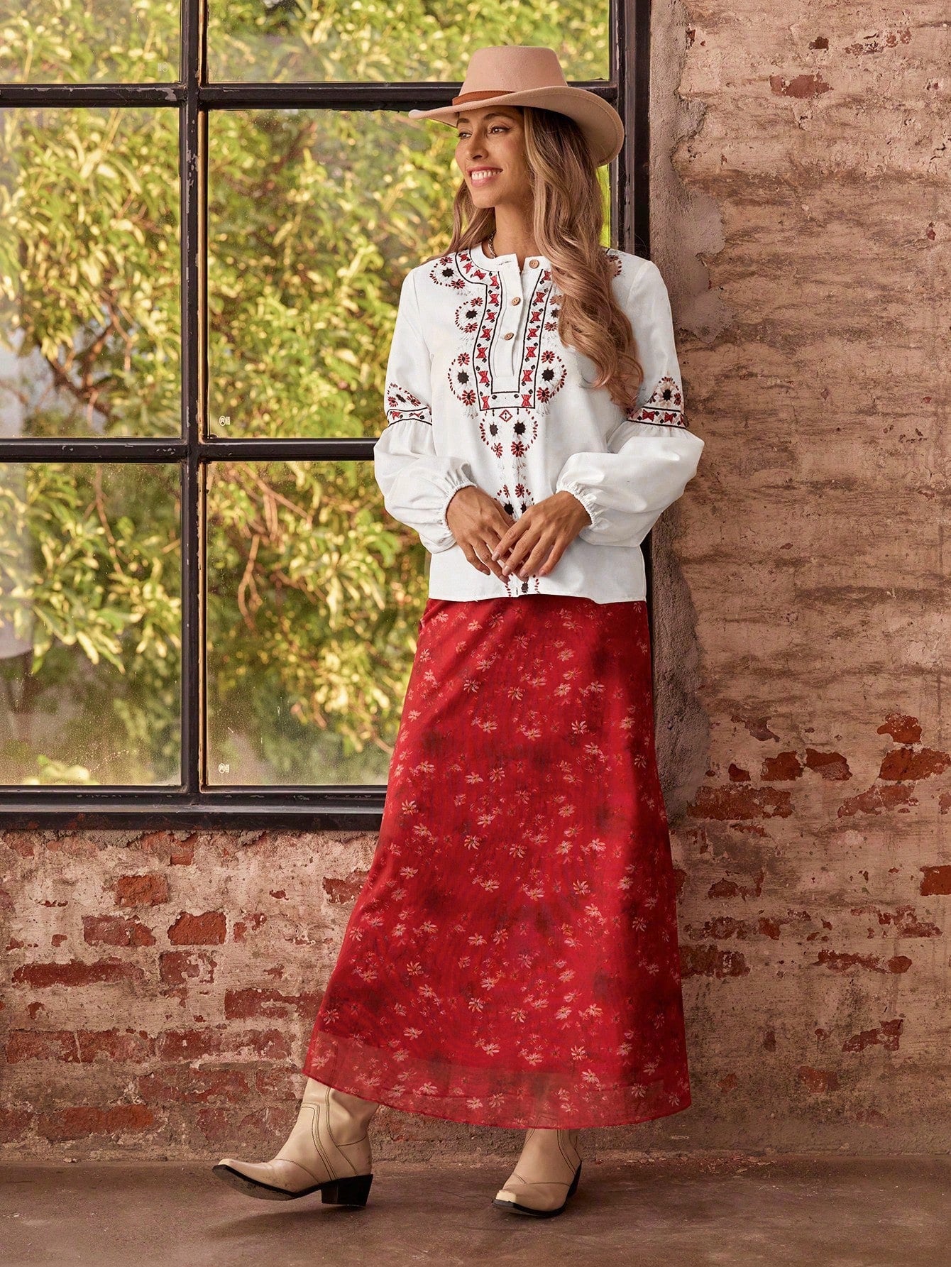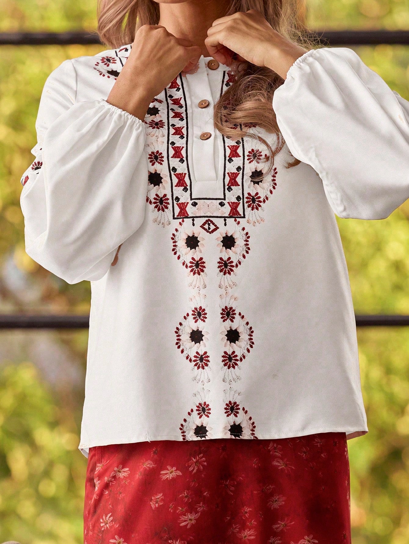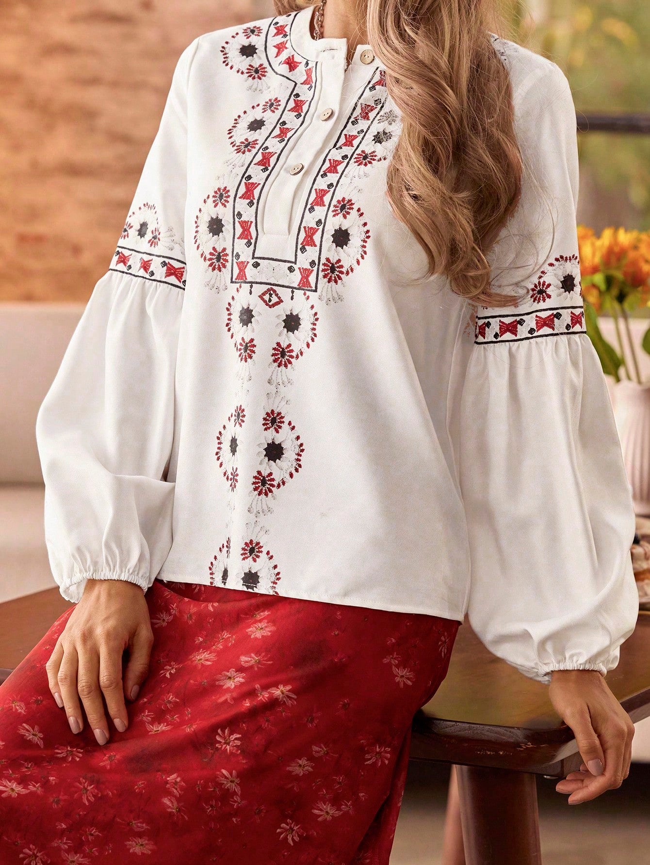 LanaWest Standard Sized Women's Retro Print Fitted Crew Neck Lantern Sleeve Blouse