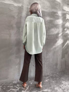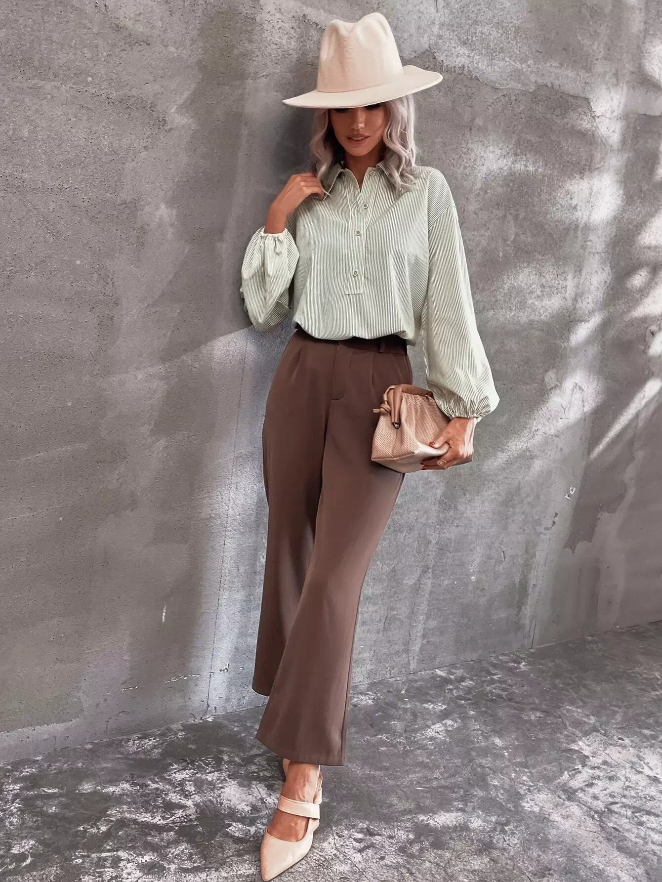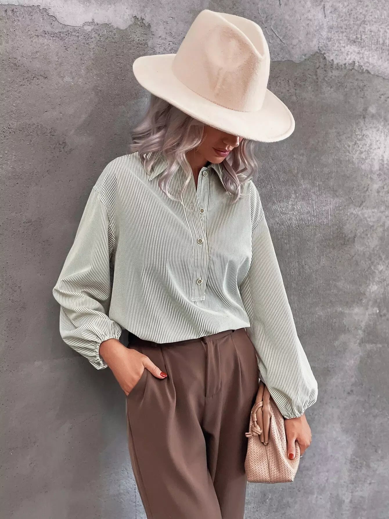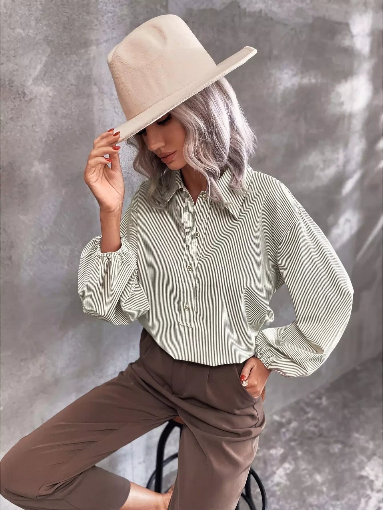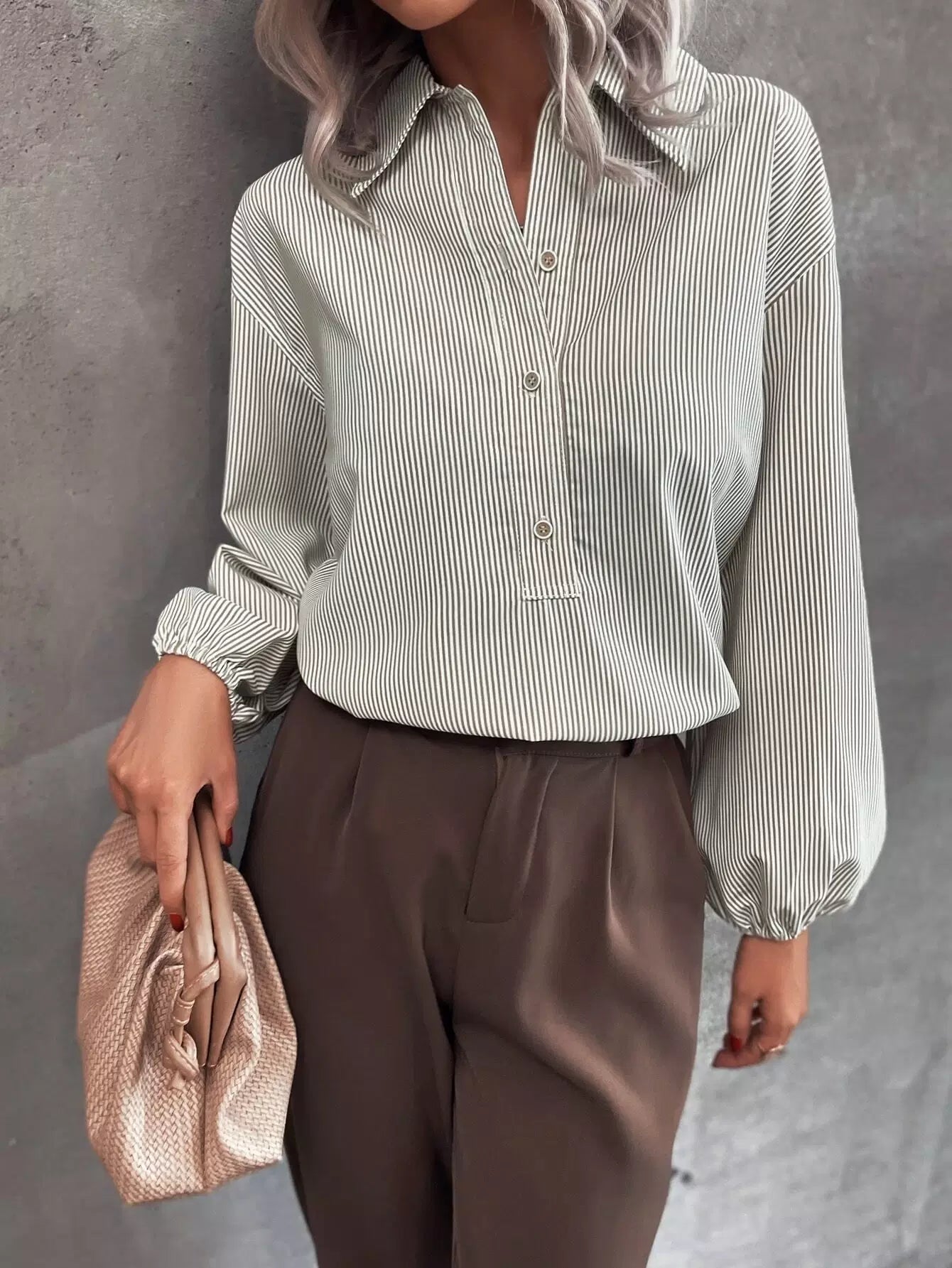 Lantern Sleeve Half Button Striped Blouse