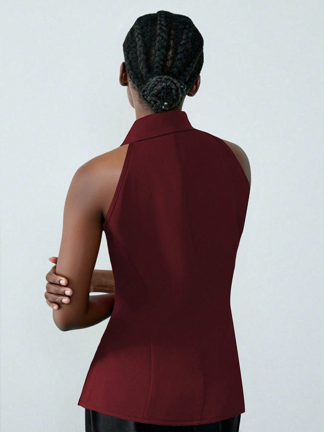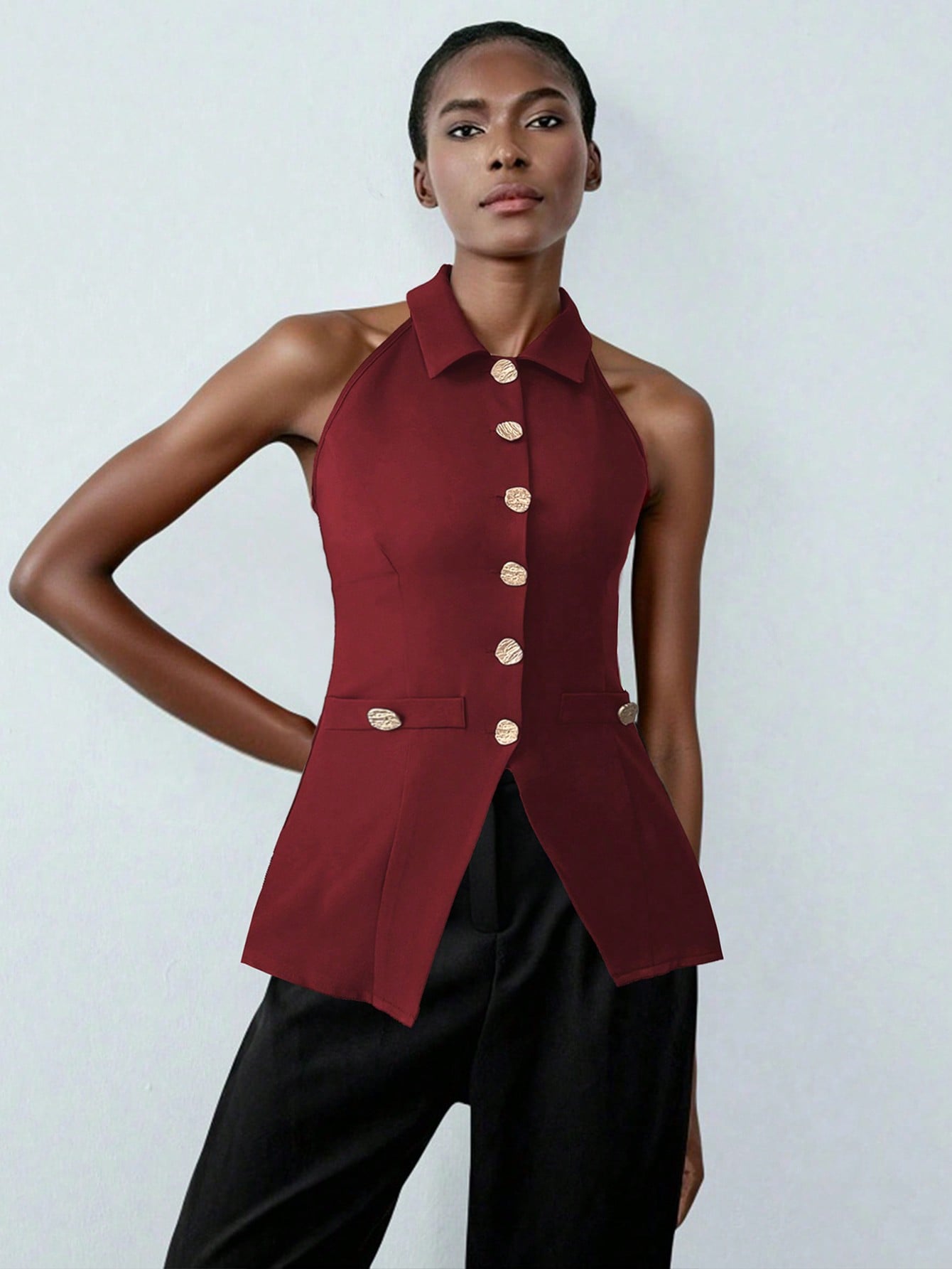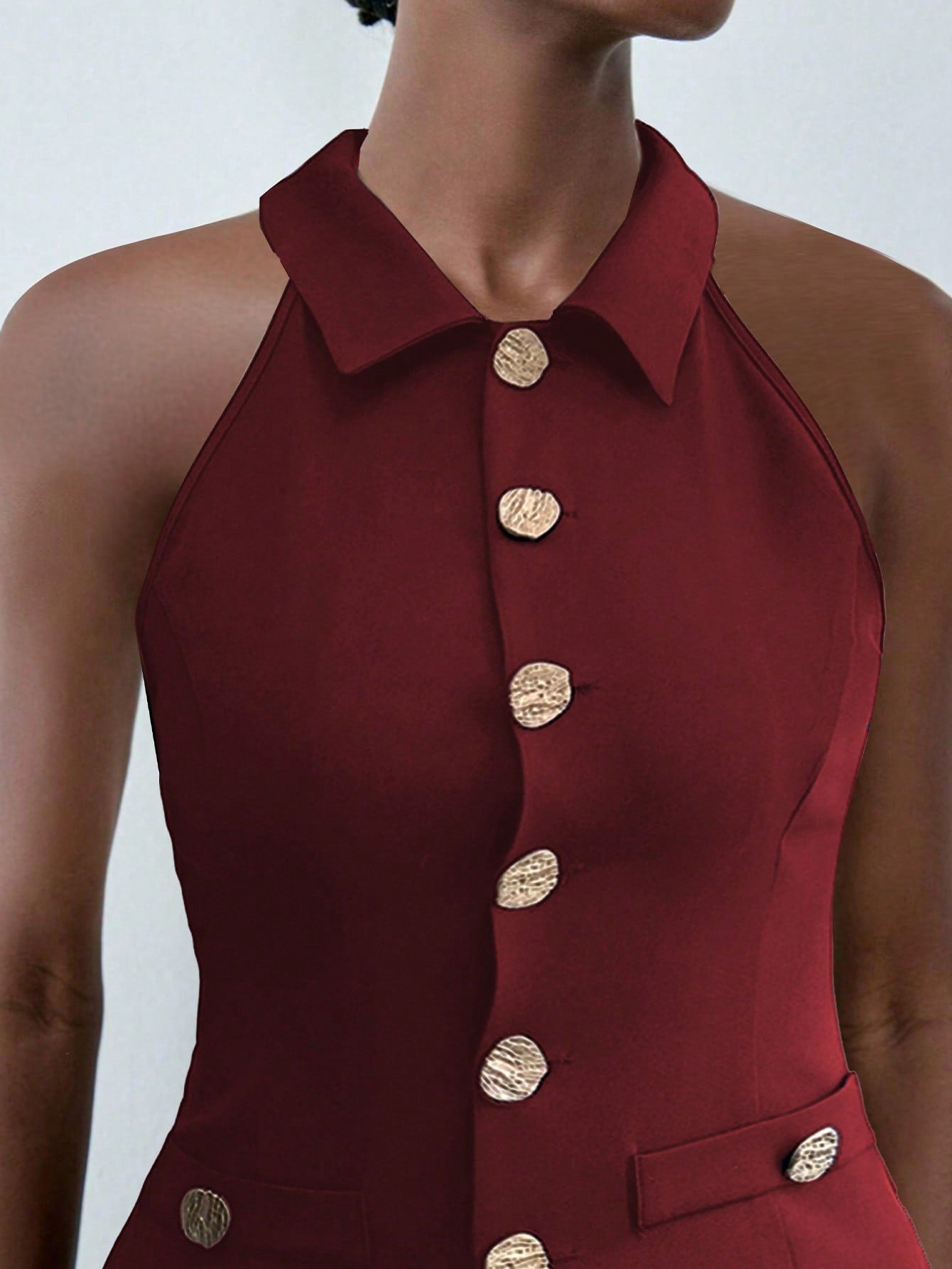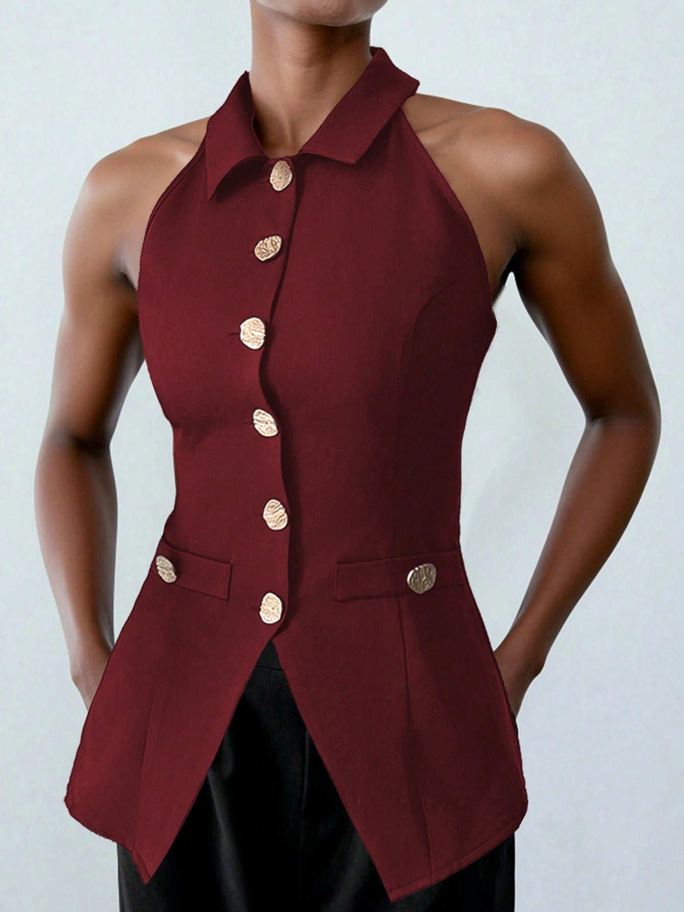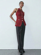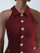 Lumivelle Women's Fashion Sleeveless Top With Metal Decor Buttons, Waist Cinched Fitted Burgundy Shirt