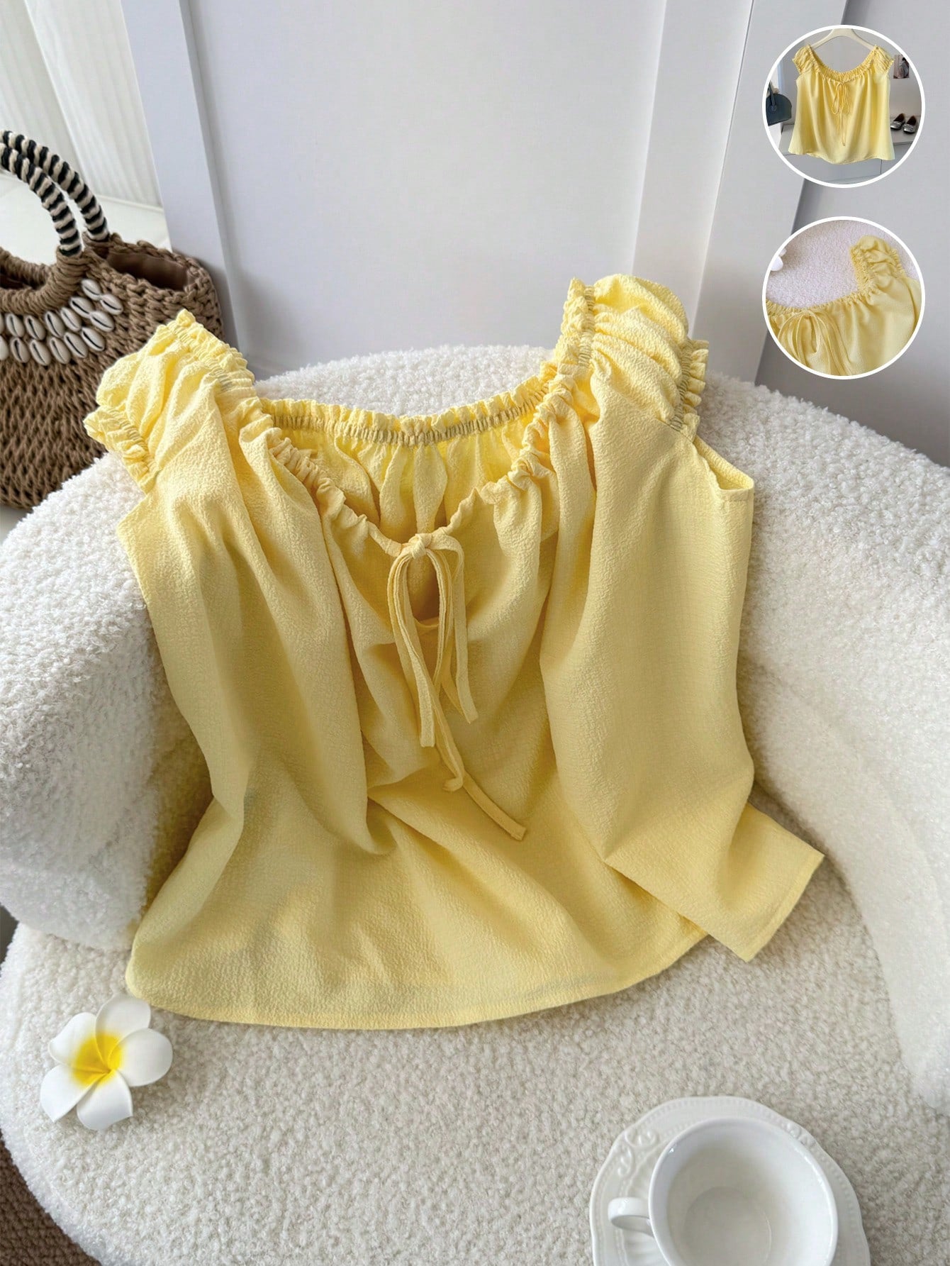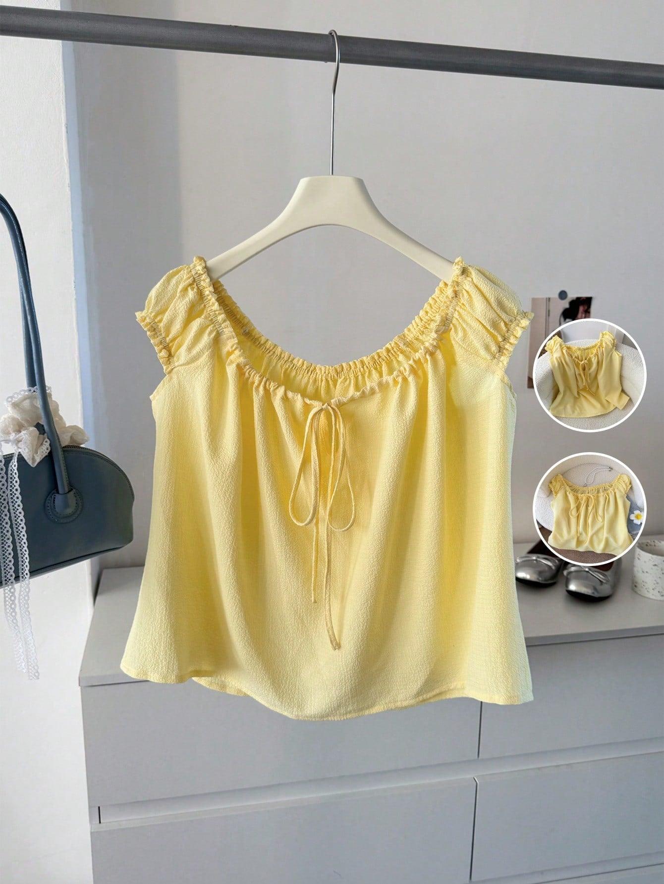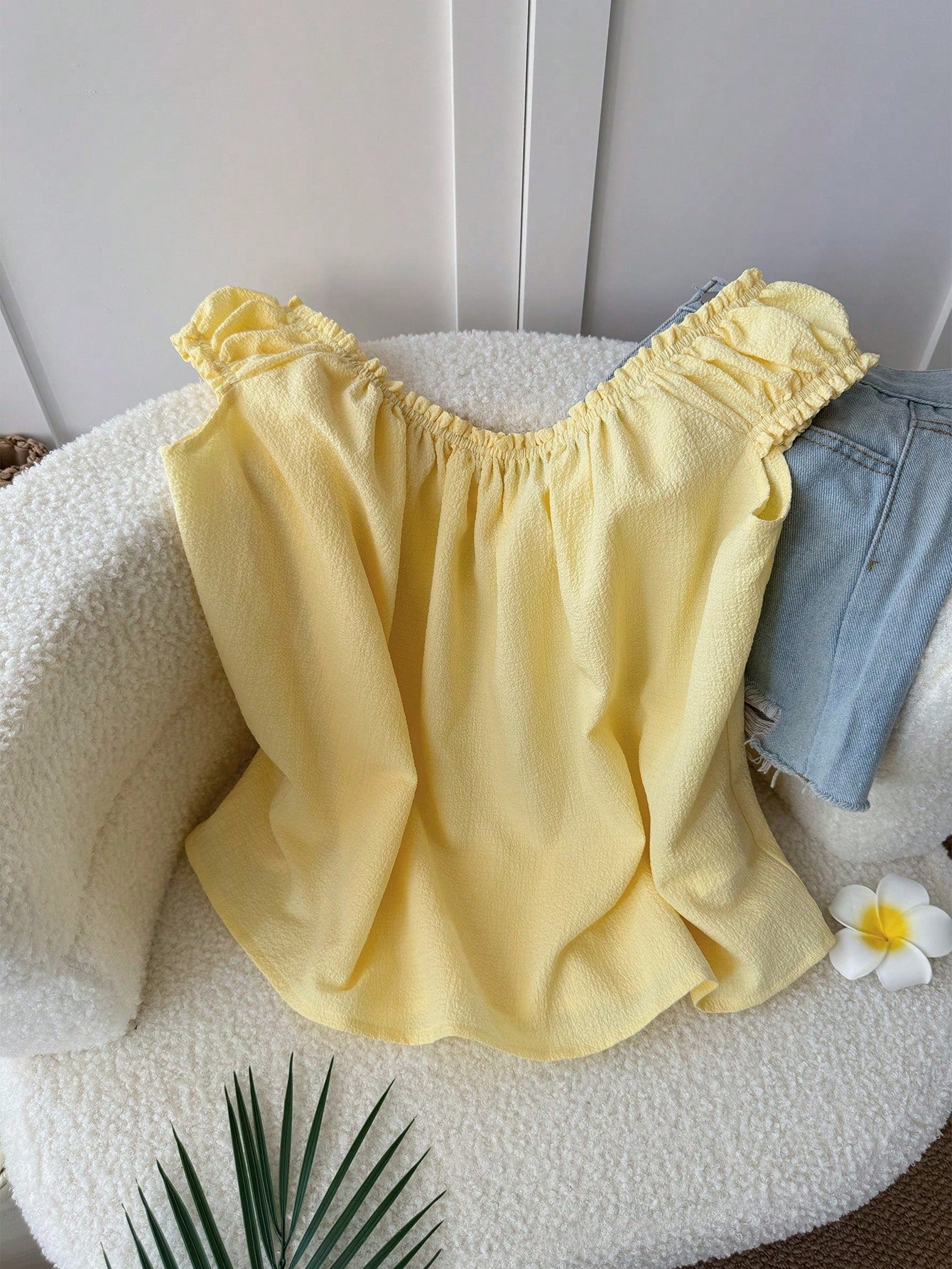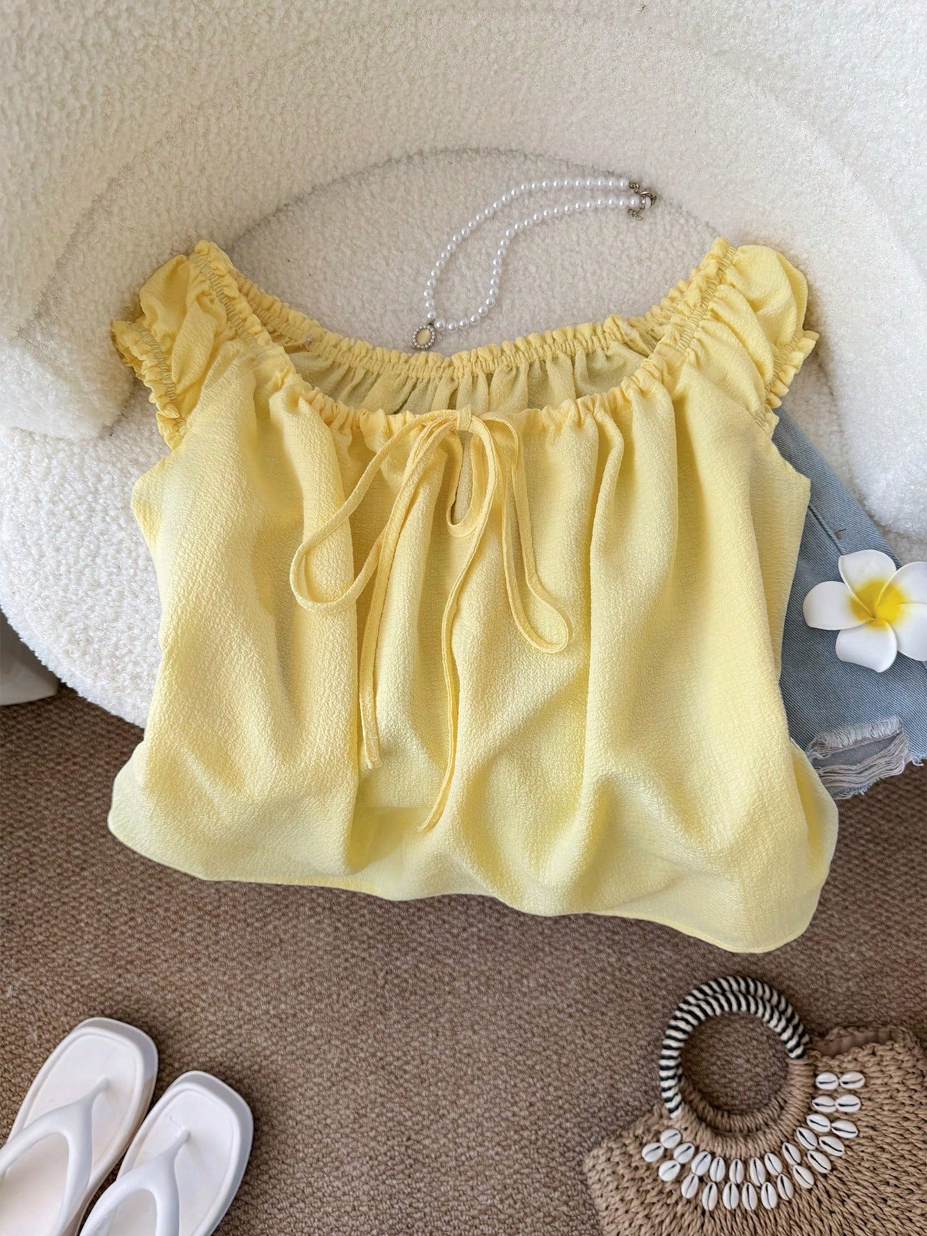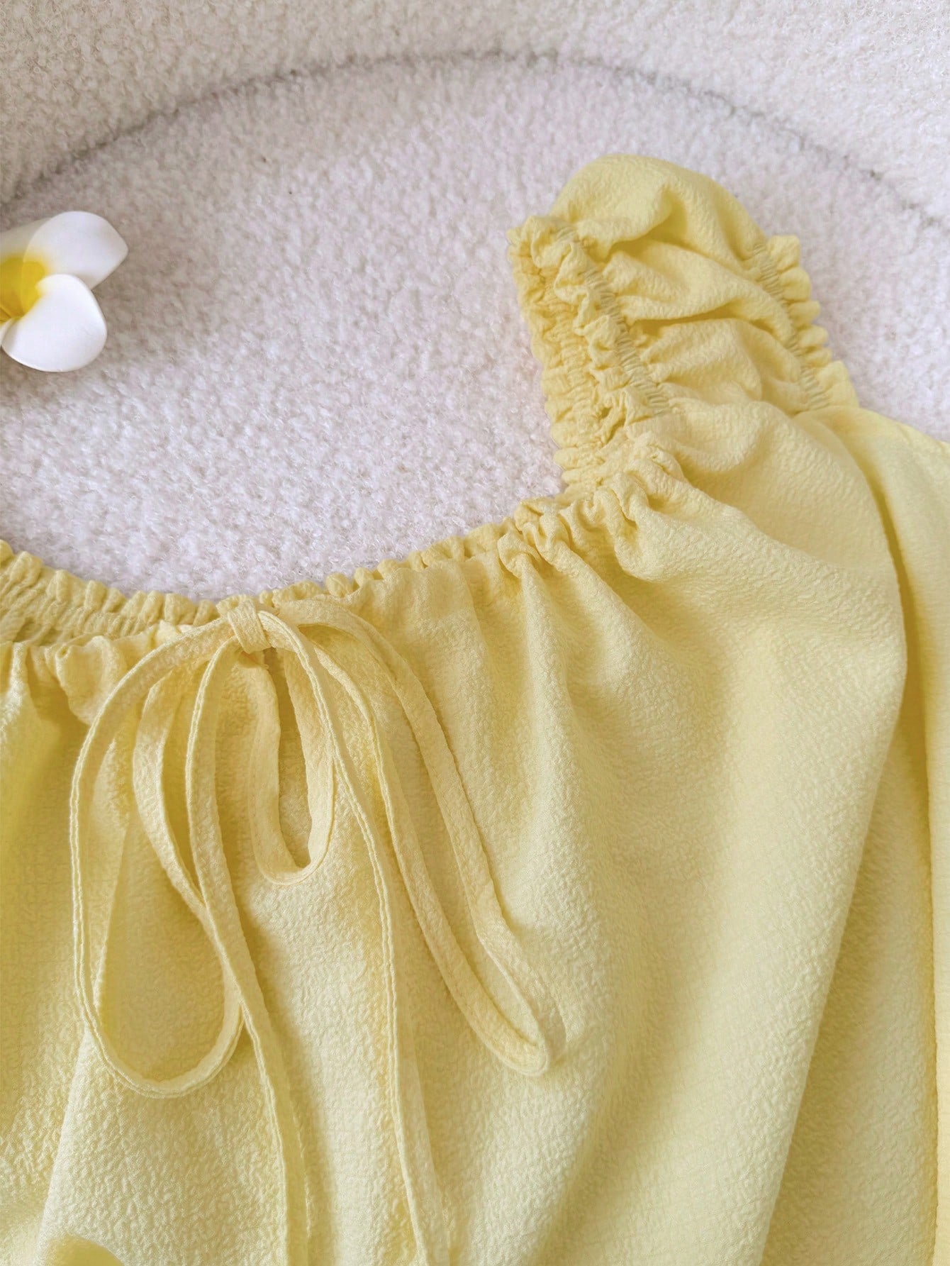 LUNE Butter Yellow Romantic Short Sleeve Women's Blouse, Suitable For Casual Daily, Romantic Vacation,