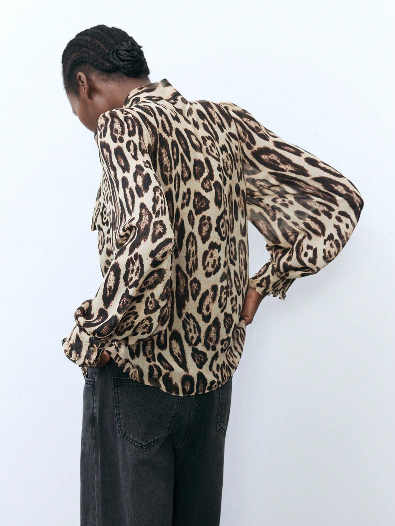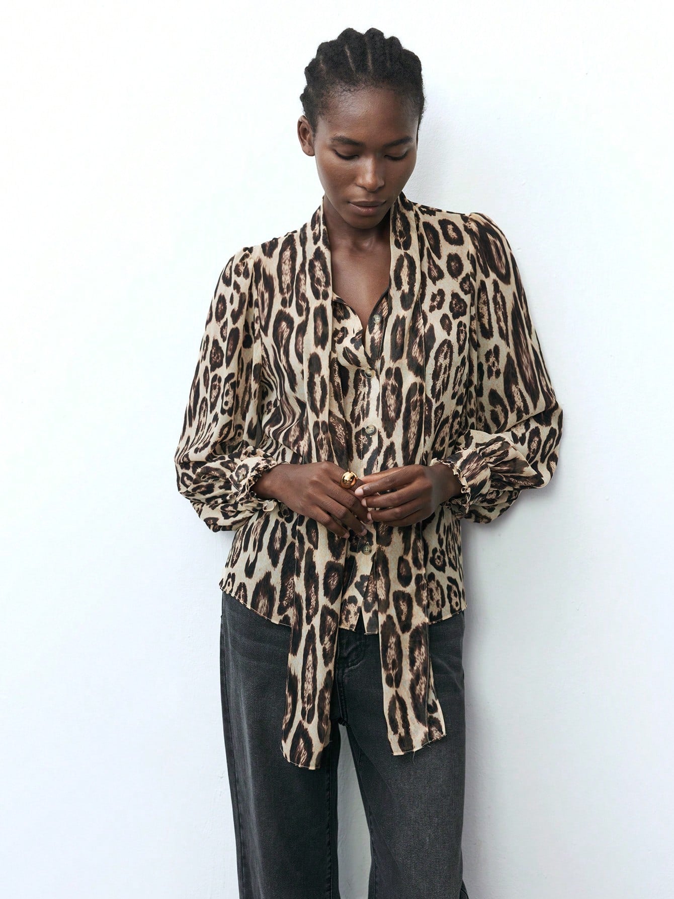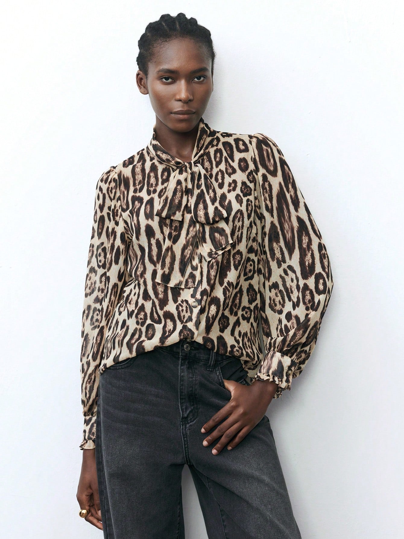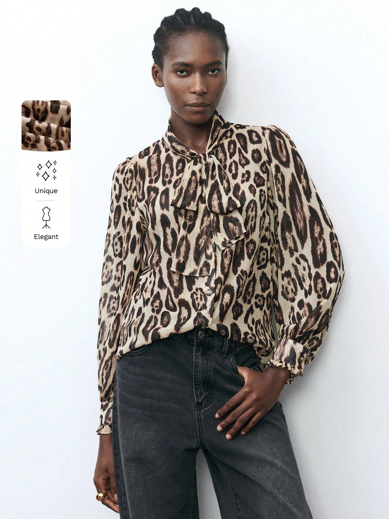 women Maija Women's Brown Leopard Print Chic Urban All-Season Versatile Animal Print Lace-Up Collar Long Sleeve Blouse